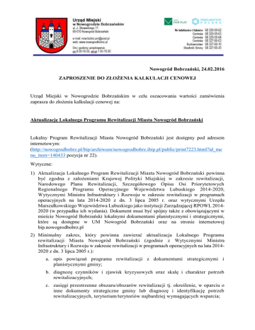 Nowogród Bobrzański, 24.02.2016 ZAPROSZENIE DO ZŁOŻENIA KALKULACJI CENOWEJ Urząd Miejski w Nowogrodzie Bobrzańskim w celu oszacowania wartości zamówienia zaprasza do złożenia kalkulacji cenowej na: Aktualizację Lokalnego Programu Rewitalizacji Miasta Nowogród Bobrzański Lokalny Program Rewitalizacji Miasta Nowogród Bobrzański jest dostępny pod adresem internetowym: (http://nowogrodbobrz.pl/bip/archiwum/nowogrodbobrz.ibip.pl/public/print7223.html?id_me nu_item=140433 pozycja nr 22). Wytyczne: 1) Aktualizacja Lokalnego Program Rewitalizacji Miasta Nowogród Bobrzański powinna być zgodna z założeniami Krajowej Polityki Miejskiej w zakresie rewitalizacji, Narodowego Planu Rewitalizacji, Szczegółowego Opisu Osi Priorytetowych Regionalnego Programu Operacyjnego Województwa Lubuskiego 2014-2020, Wytycznymi Ministra Infrastruktury i Rozwoju w zakresie rewitalizacji w programach operacyjnych na lata 2014-2020 z dn. 3 lipca 2005 r. oraz wytycznymi Urzędu Marszałkowskiego Województwa Lubuskiego jako instytucji Zarządzającej RPOWL 20142020 (w przypadku ich wydania). Dokument musi być spójny także z obowiązującymi w mieście Nowogród Bobrzański lokalnymi dokumentami planistycznymi i strategicznymi, które są dostępne w UM Nowogród Bobrzański oraz na stronie internetowej bip.nowogrodbobrz.pl 2) Minimalny zakres, który powinna zawierać aktualizacja Lokalnego Programu rewitalizacji Miasta Nowogród Bobrzański (zgodnie z Wytycznymi Ministra Infrastruktury i Rozwoju w zakresie rewitalizacji w programach operacyjnych na lata 20142020 z dn. 3 lipca 2005 r.): a. opis powiązań programu rewitalizacji z dokumentami strategicznymi i planistycznymi gminy; b. diagnozę czynników i zjawisk kryzysowych oraz skalę i charakter potrzeb rewitalizacyjnych; c. zasięgi przestrzenne obszaru/obszarów rewitalizacji tj. określenie, w oparciu o inne dokumenty strategiczne gminy lub diagnozę i identyfikację potrzeb rewitalizacyjnych, terytorium/terytoriów najbardziej wymagających wsparcia; d. wizję stanu obszaru po przeprowadzeniu rewitalizacji (planowany efekt rewitalizacji); e. cele rewitalizacji oraz odpowiadające zidentyfikowanym potrzebom rewitalizacyjnym kierunki działań mających na celu eliminację lub ograniczenie negatywnych zjawisk; f. listę planowanych, podstawowych projektów i przedsięwzięć rewitalizacyjnych wraz z ich opisami zawierającymi, w odniesieniu do każdego projektu/przedsięwzięcia rewitalizacyjnego, co najmniej: nazwę i wskazanie podmiotów go realizujących, zakres realizowanych zadań, lokalizację (miejsce przeprowadzenia danego projektu), szacowaną wartość, prognozowane rezultaty wraz ze sposobem ich oceny i zmierzenia w odniesieniu do celów rewitalizacji; g. charakterystykę pozostałych rodzajów przedsięwzięć rewitalizacyjnych realizujących kierunki działań, mających na celu eliminację lub ograniczenie negatywnych zjawisk powodujących sytuację kryzysową; h. mechanizmy zapewnienia komplementarności między poszczególnymi projektami/przedsięwzięciami rewitalizacyjnymi oraz pomiędzy działaniami różnych podmiotów i funduszy na obszarze objętym programem rewitalizacji; i. indykatywne ramy finansowe w odniesieniu do przedsięwzięć, o których mowa w lit. f oraz g, z indykatywnymi wielkościami środków finansowych z różnych źródeł (także spoza funduszy polityki spójności na lata 2014-2020 – publiczne i prywatne środki krajowe w celu realizacji zasady dodatkowości środków UE); j. mechanizmy włączenia mieszkańców, przedsiębiorców i innych podmiotów i grup aktywnych na terenie gminy w proces rewitalizacji; k. system realizacji (wdrażania) programu rewitalizacji; l. system monitoringu i oceny skuteczności działań i system wprowadzania modyfikacji w reakcji na zmiany w otoczeniu programu. 3) W związku z faktem, iż w obecnej perspektywie finansowej na lata 2014-2020 Lokalny Program Rewitalizacji będzie podlegał ocenie Instytucji Zarządzającej RPO Województwa Lubuskiego, należy uwzględnić, iż opracowany dokument będzie należało uaktualnić zgodnie z wytycznymi i uwagami ww. Instytucji. 4) W związku z faktem, iż Gmina Nowogród Bobrzański planuje podjąć współpracę z dwoma niezależnymi ekspertami w zakresie oceny Lokalnego Programu rewitalizacji, należy uwzględnić, iż opracowany dokument będzie należało uaktualnić/poprawić zgodnie z wytycznymi ww. ekspertów. 5) Kalkulację cenową zawierającą cenę brutto należy dostarczyć do Urzędu Miejskiego w Nowogrodzie Bobrzańskim do dnia 4 marca 2016 roku przesyłając na adres mailowy: [email protected] 6) Złożenie kalkulacji cenowej nie stanowi podstawy do roszczenia o zawarcie umowy na wykonanie przedmiotu wyceny - Aktualizacji Lokalnego Programu Rewitalizacji Miasta Nowogród Bobrzański. 7) O środki niezbędne do przeprowadzenia aktualizacji Lokalnego Programu Rewitalizacji Miasta Nowogród Bobrzański, Gmina Nowogród Bobrzański zamierza aplikować w ramach ogłoszonego przez Urząd Marszałkowski Województwa Lubuskie konkursu dotacji na opracowanie lub aktualizację programu rewitalizacji (http://obserwuj.lubuskie.pl/news/242/148/KONKURS-DOTACJI-DLA-GMIN-NAOPRACOWANIE-LUB-AKTUALIZACJe-PROGRAMoW-REWITALIZACJI). 8) Osoba do kontaktu: Joanna Powchowicz, tel. 068 329 09 62 wewn. 143
