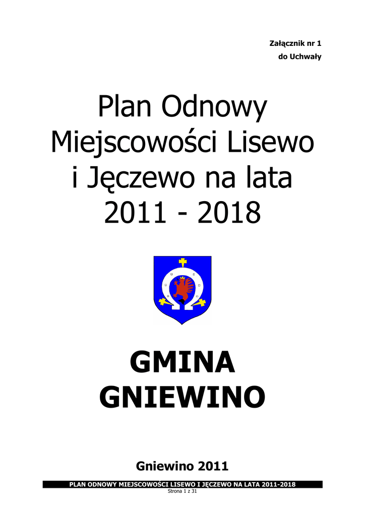 Załącznik nr 1 do Uchwały Plan Odnowy Miejscowości Lisewo i Jęczewo na lata 2011 - 2018 GMINA GNIEWINO Gniewino 2011 PLAN ODNOWY MIEJSCOWOŚCI LISEWO I JĘCZEWO NA LATA 2011-2018 Strona 1 z 31 SPIS TREŚCI WSTĘP .............................................................................................. 3 1. CHARAKTERYSTYKA MIEJSCOWOŚCI, W KTÓRYCHY BĘDZIE REALIZOWANA OPERACJA.................................................................. 4 1.1 1.2 1.3 1.4. CECHY POŁOśENIA WSI LISEWO I JĘCZEWO .................................................... 4 UśYTKOWANIE GRUNTÓW .................................................................................... 5 ZARYS HISTORII ROZWOJU LISEWA, JĘCZEWA I OKOLIC .............................. 5 KOMPOZYCYJNE WALORY ZESPOŁÓW ZABUDOWY ......................................... 7 2. INWENTARYZACJA ZASOBÓW SOŁECTWA LISEWO.......................... 9 2.1. ŚRODOWISKO FIZYCZNOGEOGRAFICZNE BADANEGO OBSZARU ...................... 9 2.1.1. Rzeźba powierzchni .............................................................................................. 9 2.1.2. Klimat.................................................................................................................... 11 2.1.3. Wody powierzchniowe ....................................................................................... 12 2.1.4. Gleby..................................................................................................................... 13 2.1.5. Szata roślinna...................................................................................................... 13 2.2. KRAJOBRAZ KULTUROWY ........................................................................................ 14 2.2.1. Obiekty i zespoły znaczące dla dziedzictwa kulturowego gminy................. 14 2.2.2. Obiekty i stanowiska archeologiczne ............................................................... 16 2.2.3. Obiekty i strefy ochrony archeologicznej ........................................................ 16 2.3. ŚRODOWISKO SPOŁECZNE I GOSPODARKA......................................................... 17 2.3.1. Charakterystyka demograficzna ....................................................................... 17 2.3.2. Analiza gospodarcza........................................................................................... 20 2.4. DROGI I SYSTEM TRANSPORTU ............................................................................. 20 2.5. KULTURA I REKREACJA ............................................................................................ 21 3. ANALIZA MOCNYCH I SŁABYCH STRON SOŁECTWA LISEWO ...........22 4. OPIS PLANOWANYCH DZIAŁAŃ......................................................24 5. OPIS i CHARAKTERYSTYKA OBSZARÓW O SZCZEGÓLNYM ZNACZENIU DLA ZASPOKOJENIA POTRZEB MIESZKAŃCÓW, SPRZYJAJĄCYCH NAWIĄZYWANIU KONTAKTÓW SPOŁECZNYCH, ZE WZGLĘDU NA ICH POŁOśENIE ORAZ CECHY FUNKCJONALNO - PRZESTRZENNE……………29 PLAN ODNOWY MIEJSCOWOŚCI LISEWO I JĘCZEWO NA LATA 2011-2018 Strona 2 z 31 WSTĘP Rozwój i odnowa obszarów wiejskich to jedno z kluczowych wyzwań, jakie stoją przed Polską w okresie integracji z Unią Europejską. Zasadniczym jej celem jest wzmocnienie działań słuŜących zmniejszaniu istniejących dysproporcji i róŜnic w poziomie rozwoju obszarów wiejskich w stosunku do terenów miejskich. Plan Odnowy Miejscowości jest jednym z najwaŜniejszych elementów odnowy wsi, jej rozwoju oraz poprawy warunków pracy i Ŝycia mieszkańców. Sporządzenie i uchwalenie takiego dokumentu stanowi niezbędny warunek przy aplikowaniu o środki finansowe w ramach „Programu Rozwoju Obszarów Wiejskich 2007-2013” działanie „Odnowa i rozwój wsi”, jak równieŜ stanowić będzie wytyczne dla władz Gminy Gniewino przy opracowaniu kierunków rozwoju miejscowości Lisewo i Jęczewo (sołectwo Lisewo). Celem działania „Odnowa i rozwój wsi” jest poprawa jakości Ŝycia na obszarach wiejskich poprzez zaspokojenie potrzeb społecznych i kulturalnych mieszkańców wsi oraz promowanie obszarów wiejskich. Działanie umoŜliwi rozwój toŜsamości społeczności wiejskiej, zachowanie dziedzictwa kulturowego i specyfiki obszarów wiejskich oraz wpłynie na wzrost ich atrakcyjności turystycznej i inwestycyjnej. Plan odnowy to przedstawiona w formie dokumentu koncepcja działań do długotrwałego i zrównowaŜonego rozwoju miejscowości Lisewo i Jęczewo do roku 2018. Zawiera charakterystykę miejscowości Lisewo i Jęczewo, inwentaryzację zasobów słuŜącą ujęciu stanu rzeczywistego, analizę SWOT, planowane kierunki rozwoju oraz szacunkowy koszt przedsięwzięcia i harmonogram działań. Obszarem realizacji Planu Odnowy Miejscowości Lisewo i Jęczewo jest teren tych miejscowości. Dokument ten powstał w procesie konsultacji społeczności sołectwa Lisewo. PLAN ODNOWY MIEJSCOWOŚCI LISEWO I JĘCZEWO NA LATA 2011-2018 Strona 3 z 31 1. CHARAKTERYSTYKA MIEJSCOWOŚCI, W KTÓRYCH BĘDZIE REALIZOWANA OPERACJA 1.1 CECHY POŁOśENIA WSI LISEWO i JĘCZEWO Miejscowość Lisewo i Jęczewo administracyjnie połoŜone są w centralnej części gminy Gniewino (powiat wejherowski)(Ryc. 1.). Ryc. 1. PołoŜenie miejscowości Lisewo i Jęczewo w gminie Gniewino źródło: opracowanie własne Badany obszar leŜy około 6 km od miejscowości gminnej Gniewina, 20 km od ośrodka powiatowego – Wejherowa, do centrum Gdyni, jednego z największych nadmorskich miast Polski, jest 40 km, zaś do Gdańska, miasta wojewódzkiego, jest ok.66 km PLAN ODNOWY MIEJSCOWOŚCI LISEWO I JĘCZEWO NA LATA 2011-2018 Strona 4 z 31 1.2 UśYTKOWANIE GRUNTÓW Obręb geodezyjny Tadzino, obejmujący sołectwo Lisewo i Tadzino zajmuje powierzchnię prawie 1300 ha, co stanowi 7,3% powierzchni całej gminy. Największą powierzchnię w obrębie geodezyjnym Tadzino stanowią uŜytki rolne (gruntu orne, łąki oraz pastwiska) 66,5% (tabl.1.). Ponad 27% powierzchni zaj