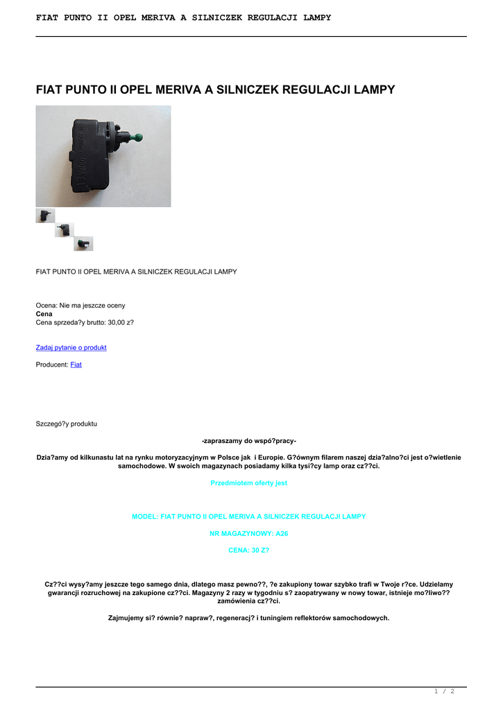 FIAT PUNTO II OPEL MERIVA A SILNICZEK REGULACJI LAMPY FIAT PUNTO II OPEL MERIVA A SILNICZEK REGULACJI LAMPY FIAT PUNTO II OPEL MERIVA A SILNICZEK REGULACJI LAMPY Ocena: Nie ma jeszcze oceny Cena Cena sprzeda?y brutto: 30,00 z? Zadaj pytanie o produkt Producent: Fiat Szczegó?y produktu -zapraszamy do wspó?pracyDzia?amy od kilkunastu lat na rynku motoryzacyjnym w Polsce jak i Europie. G?ównym filarem naszej dzia?alno?ci jest o?wietlenie samochodowe. W swoich magazynach posiadamy kilka tysi?cy lamp oraz cz??ci. Przedmiotem oferty jest MODEL: FIAT PUNTO II OPEL MERIVA A SILNICZEK REGULACJI LAMPY NR MAGAZYNOWY: A26 CENA: 30 Z? Cz??ci wysy?amy jeszcze tego samego dnia, dlatego masz pewno??, ?e zakupiony towar szybko trafi w Twoje r?ce. Udzielamy gwarancji rozruchowej na zakupione cz??ci. Magazyny 2 razy w tygodniu s? zaopatrywany w nowy towar, istnieje mo?liwo?? zamówienia cz??ci. Zajmujemy si? równie? napraw?, regeneracj? i tuningiem reflektorów samochodowych. 1 / 2 FIAT PUNTO II OPEL MERIVA A SILNICZEK REGULACJI LAMPY Siedziba firmy: Lampy Samochodowe P.Alwin Nowa 33 64-560 Ostroróg NIP: 783-160-38-97 Pytania prosimy kierowa?: [email protected] Drogi kliencie! Masz prawo zwrotu zakupionego towaru w ci?gu 14 dni bez podania przyczyny, niczym nie ryzykujesz. Jedyne koszty, których nie zwracamy to koszty wysy?ki. 2 / 2 Powered by TCPDF (www.tcpdf.org)
