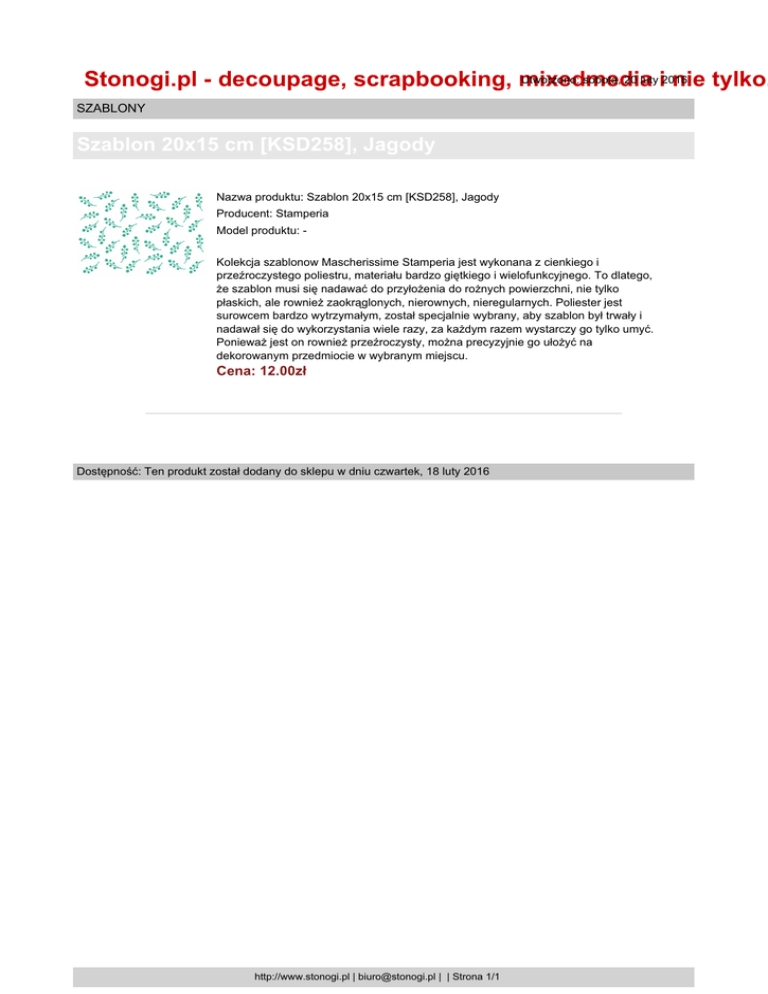 Utworzono: sobota, 20 luty i2016 Stonogi.pl - decoupage, scrapbooking, mixedmedia nie tylko. SZABLONY Szablon 20x15 cm [KSD258], Jagody Nazwa produktu: Szablon 20x15 cm [KSD258], Jagody Producent: Stamperia Model produktu: Kolekcja szablonow Mascherissime Stamperia jest wykonana z cienkiego i przeźroczystego poliestru, materiału bardzo giętkiego i wielofunkcyjnego. To dlatego, że szablon musi się nadawać do przyłożenia do rożnych powierzchni, nie tylko płaskich, ale rownież zaokrąglonych, nierownych, nieregularnych. Poliester jest surowcem bardzo wytrzymałym, został specjalnie wybrany, aby szablon był trwały i nadawał się do wykorzystania wiele razy, za każdym razem wystarczy go tylko umyć. Ponieważ jest on rownież przeźroczysty, można precyzyjnie go ułożyć na dekorowanym przedmiocie w wybranym miejscu. Cena: 12.00zł Dostępność: Ten produkt został dodany do sklepu w dniu czwartek, 18 luty 2016 http://www.stonogi.pl | [email protected] | | Strona 1/1