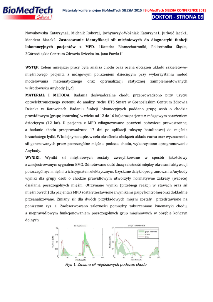 Materiały konferencyjne BioMedTech SILESIA 2015 I BioMedTech SILESIA CONFERENCE 2015 DOKTOR - STRONA 092 Nowakowska Katarzyna1, Michnik Robert1, Jochymczyk-Woźniak Katarzyna1, Jurkojć Jacek1, Mandera Marek2. Zastosowanie identyfikacji sił mięśniowych do diagnostyki funkcji lokomocyjnych pacjentów z MPD. 1Katedra Biomechatroniki, Politechnika Śląska, 2Górnośląskie Centrum Zdrowia Dziecka im. Jana Pawła II WSTĘP. Celem niniejszej pracy była analiza chodu oraz ocena obciążeń układu szkieletowomięśniowego pacjenta z mózgowym porażeniem dziecięcym przy wykorzystaniu metod modelowania matematycznego oraz optymalizacji statycznej zaimplementowanych w środowisku Anybody [1,2]. MATERIAŁ I METODA. Badania doświadczalne chodu przeprowadzono przy użyciu optoelektronicznego systemu do analizy ruchu BTS Smart w Górnośląskim Centrum Zdrowia Dziecka w Katowicach. Badaniu funkcji lokomocyjnych poddano grupę osób o chodzie prawidłowym (grupę kontrolną) w wieku od 12 do 16 lat) oraz pacjenta z mózgowym porażeniem dziecięcym (12 lat). U pacjenta z MPD zdiagnozowano porażeni połowicze prawostronne, a badanie chodu przeprowadzono 17 dni po aplikacji toksyny botulinowej do mięśnia brzuchatego łydki. W kolejnym etapie, w celu określenia obciążeń układu ruchu oraz wyznaczenia sił generowanych przez poszczególne mięśnie podczas chodu, wykorzystano oprogramowanie Anybody. WYNIKI. Wyniki sił mięśniowych zostały zweryfikowane w sposób jakościowy z zarejestrowanym sygnałem EMG. Odnotowano dość dużą zależność między okresami aktywacji poszczególnych mięśni, a ich sygnałem elektrycznym. Uzyskane dzięki oprogramowaniu Anybody wyniki dla grupy osób o chodzie prawidłowym utworzyły normatywne zakresy (wzorce) działania poszczególnych mięśni. Otrzymane wyniki (przebiegi reakcji w stawach oraz sił mięśniowych) dla pacjenta z MPD zostały zestawione z wynikami grupy kontrolnej oraz dokładnie przeanalizowane. Zmiany sił dla dwóch przykładowych mięśni zostały przedstawione na poniższym rys. 1. Zaobserwowano zależności pomiędzy zaburzeniami kinematyki chodu, a nieprawidłowym funkcjonowaniem poszczególnych grup mięśniowych w obrębie kończyn dolnych. Rys 1. Zmiana sił mięśniowych podczas chodu Materiały konferencyjne BioMedTech SILESIA 2015 I BioMedTech SILESIA CONFERENCE 2015 DOKTOR - STRONA 092 PODSUMOWANIE. Otrzymane wyniki wskazują, iż środowisko Anybody może wspomagać diagnostykę narządu ruchu, a przede wszystkim pozwala określić, które grupy mięśni pracują w sposób nieprawidłowy. Wyznaczanie obciążeń układu szkieletowo-mięśniowego może być pomocne w wyborze mięśni u pacjentów z MPD, do których należy aplikować toksynę botulinową. Projekt został sfinansowany ze środków Narodowego Centrum Nauki przyznanych na podstawie decyzji numer DEC-2011/01/B/NZ7/02695 LITERATURA [1] Damsgaard M. et.al, Analysis of musculoskeletal systems in the AnyBody Modeling, System, Simulation Modelling Practice and Theory 14, 2006, p. 1100–1111. [2] Rasmussen John, et all. Designing a general software system for musculoskeletal analysis, (in:) IX International Symposium on Computer Simulation in Biomechanics, Sydney 2003. p. 27.