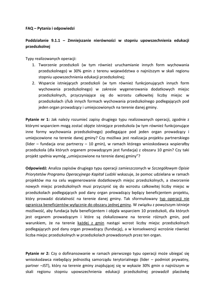 FAQ – Pytania i odpowiedzi Poddziałanie 9.1.1 – Zmniejszanie nierówności w stopniu upowszechnienia edukacji przedszkolnej Typy realizowanych operacji: 1. Tworzenie przedszkoli (w tym również uruchamianie innych form wychowania przedszkolnego) w 30% gmin z terenu województwa o najniższym w skali regionu stopniu upowszechnienia edukacji przedszkolnej; 2. Wsparcie istniejących przedszkoli (w tym również funkcjonujących innych form wychowania przedszkolnego) w zakresie wygenerowania dodatkowych miejsc przedszkolnych, przyczyniające się do wzrostu całkowitej liczby miejsc w przedszkolach i/lub innych formach wychowania przedszkolnego podlegających pod jeden organ prowadzący i umiejscowionych na terenie danej gminy. Pytanie nr 1: Jak należy rozumied zapisy drugiego typu realizowanych operacji, zgodnie z którymi wsparciem mogą zostad objęte istniejące przedszkola (w tym również funkcjonujące inne formy wychowania przedszkolnego) podlegające pod jeden organ prowadzący i umiejscowione na terenie danej gminy? Czy możliwa jest realizacja projektu partnerskiego (lider – fundacja oraz partnerzy – 10 gmin), w ramach którego wnioskodawca wspierałby przedszkola (dla których organem prowadzącym jest fundacja) z obszaru 10 gmin? Czy taki projekt spełnia wymóg „umiejscowione na terenie danej gminy”? Odpowiedź: Analiza zapisów drugiego typu operacji zamieszczonych w Szczegółowym Opisie Priorytetów Programu Operacyjnego Kapitał Ludzki wskazuje, że pomoc udzielana w ramach projektów ma na celu wygenerowanie dodatkowych miejsc przedszkolnych, a stworzenie nowych miejsc przedszkolnych musi przyczynid się do wzrostu całkowitej liczby miejsc w przedszkolach podlegających pod dany organ prowadzący będący beneficjentem projektu, który prowadzi działalnośd na terenie danej gminy. Tak sformułowany typ operacji nie ogranicza beneficjentów wyłącznie do obszaru jednej gminy. W związku z powyższym istnieje możliwośd, aby fundacja była beneficjentem i objęła wsparciem 10 przedszkoli, dla których jest organem prowadzącym i które są zlokalizowane na terenie różnych gmin, pod warunkiem, że na terenie każdej z gmin nastąpi wzrost liczby miejsc przedszkolnych podlegających pod dany organ prowadzący (fundację), a w konsekwencji wzrośnie również liczba miejsc przedszkolnych w przedszkolach prowadzonych przez ten organ. Pytanie nr 2: Czy o dofinansowanie w ramach pierwszego typu operacji może ubiegad się wnioskodawca niebędący jednostką samorządu terytorialnego (lider – podmiot prywatny, partner –JST), który na terenie gminy znajdującej się w wykazie 30% gmin o najniższym w skali regionu stopniu upowszechnienia edukacji przedszkolnej prowadził placówkę przedszkolną współfinansowaną ze środków EFS, która wraz z koocem realizacji projektu kooczy działalnośd (likwidacja miejsc przedszkolnych), a wnioskodawca chce utworzyd w jej miejsce nową placówkę przedszkolną także współfinansowaną w ramach Programu Operacyjnego Kapitał Ludzki? Wnioskodawca zakłada przy tym, iż w wyniku utworzenia nowej placówki stworzy większą liczbę miejsc przedszkolnych niż do tej pory, przyczyniającą się do zwiększenia stopnia upowszechnienia edukacji przedszkolnej na obszarze danej gminy. Odpowiedź: Podstawowym warunkiem determinującym możliwośd utworzenia nowych ośrodków wychowania przedszkolnego ze środków EFS jest zwiększenie liczby miejsc przedszkolnych, w stosunku do danych z roku poprzedzającego rok rozpoczęcia realizacji projektu, podlegających pod konkretny organ prowadzący. Dlatego też Instytucja Organizująca Konkurs ma prawo wymagad od wnioskodawcy deklaracji, że liczba miejsc przedszkolnych finansowanych przed rozpoczęciem realizacji projektu musi zostad utrzymana w okresie realizacji i trwałości projektu. Konkludując, organ prowadzący w momencie składania wniosku o dofinansowanie jest zobowiązany do zachowania posiadanej liczby miejsc przedszkolnych, a w rezultacie realizacji projektu liczba ta musi się zwiększyd. Nie ma zatem możliwości zlikwidowania istniejących już miejsc przedszkolnych i utworzenia w ich miejsce nowych, gdyż de facto nie doprowadzi to do wzrostu stopnia upowszechnienia edukacji przedszkolnej. Pytanie nr 3: Czy w ramach drugiego typu operacji można ubiegad się o dofinansowanie ze środków EFS na dodatkowe zajęcia edukacyjno-wychowawcze dla dzieci, które już wcześniej uczęszczały do danej placówki przedszkolnej, o ile projekt przyczynia się do wzrostu całkowitej liczby miejsc przedszkolnych podlegających pod dany organ prowadzący? Odpowiedź: Projekty mające na celu wsparcie istniejących ośrodków wychowania przedszkolnego powinny przyczyniad się do zapewnienia wysokiej jakości edukacji przedszkolnej, dlatego w realizowanych projektach uznaje się za istotne zachowanie jednolitej oferty edukacyjnej kierowanej do dzieci, których edukacja jest finansowana ze środków organu prowadzącego i ze środków EFS. W związku z powyższym, istnieje możliwośd sfinansowania realizacji dodatkowych zajęd edukacyjno-wychowawczych, wykraczających poza dotychczasowy zakres usług przedszkolnych finansowanych ze środków organu prowadzącego, o ile jest to uzasadnione zapewnieniem jednolitych standardów edukacji przedszkolnej dla wszystkich dzieci z jednoczesnym wzrostem liczby dzieci uczestniczących w edukacji przedszkolnej w danym ośrodku wychowania przedszkolnego. Nie mniej jednak, zaplanowanie dodatkowych zajęd nakłada na wnioskodawcę obowiązek wskazania we wniosku o dofinansowanie projektu informacji o liczbie, rodzaju i zakresie dodatkowych działao edukacyjno-wychowawczych z zachowaniem racjonalności przeznaczonych na dodatkowe zajęcia wydatków. Pytanie nr 4: Czy w ramach pierwszego typu operacji możliwa jest realizacja następującego projektu: pod organ prowadzący będący podmiotem prywatnym podlegają obecnie 3 przedszkola, współfinan