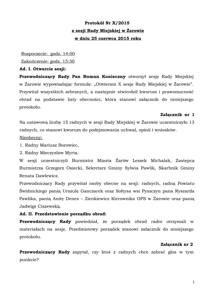 Protokół Nr X/2015 z sesji Rady Miejskiej w Żarowie w dniu 25 czerwca 2015 roku Rozpoczęcie: godz. 14:00 Zakończenie: godz. 15:30 Ad. I. Otwarcie sesji: Przewodniczący Rady Pan Roman Konieczny otworzył sesję Rady Miejskiej w Żarowie wypowiadając formułę: „Otwieram X sesję Rady Miejskiej w Żarowie”. Przywitał wszystkich zebranych, a następnie stwierdził kworum i prawomocność obrad na podstawie listy obecności, która stanowi załącznik do niniejszego protokołu. Załącznik nr 1 Na ustawową liczbę 15 radnych w sesji Rady Miejskiej w Żarowie uczestniczyło 13 radnych, co stanowi kworum do podejmowania uchwał, opinii i wniosków. Nieobecny: 1. Radny Mariusz Borowiec, 2. Radny Mieczysław Myrta. W sesji uczestniczyli Burmistrz Miasta Żarów Leszek Michalak, Zastępca Burmistrza Grzegorz Osiecki, Sekretarz Gminy Sylwia Pawlik, Skarbnik Gminy Renata Dawlewicz. Przewodniczący Rady przywitał osoby obecne na sesji: radnych, radną Powiatu Świdnickiego panią Urszulę Ganczarek oraz Sołtysa wsi Pyszczyn pana Ryszarda Pawlika, panią Anitę Denes – Zienkiewicz Kierownika OPS w Żarowie oraz panią Jadwigę Ciszewską. Ad. II. Przedstawienie porządku obrad: Przewodniczący Rady powiedział, że porządek obrad radni otrzymali w materiałach na sesję. Przedmiotowy porządek stanowi załącznik do niniejszego protokołu. Załącznik nr 2 Przewodniczący Rady zapytał, czy ktoś z radnych chce zabrać głos w tym punkcie? 1 Radny Tadeusz Pudlik zaproponował, aby punkt 3, tj. rozpatrzenie projektu uchwały w sprawie rozpatrzenia skargi na Kierownika Ośrodka Pomocy Społecznej w Żarowie był rozpatrzony jako punkt 1, ponieważ są obecne na sali zainteresowane strony, a my nad pozostałymi punktami będziemy długo debatować. Przewodniczący Rady przeszedł do głosowania zmiany do porządku obrad, zgłoszonej przez radnego Tadeusza Pudlika. W wyniku głosowania przy 13 głosach „za” zmiana do porządku obrad została przyjęta. Burmistrz Leszek Michalak powiedział, że radni otrzymali do materiałów na sesję dodatkowo jeszcze cztery projekty uchwał w sprawie: 1. przystąpienia do sporządzenia miejscowego planu zagospodarowania przestrzennego dla obszaru położonego w obrębie wsi Buków, gmina Żarów. Chodzi o to, aby zmienić w planie, ponieważ okazało się, że część świetlicy wiejskiej jest „drogą”. 2. nadania nazwy ulicy we wsi Wierzbna. Zwrócił się mieszkaniec z prośbą o nadanie numeru adresowego przy ulicy, która jeszcze nie ma swojej nazwy, stąd ta prośba o wprowadzenie tego projektu uchwały do porządku obrad. 3. utworzenia odrębnego obwodu głosowania w ogólnokrajowym referendum. Związane jest to ze zbliżającym się referendum. 4. uchwalenia zmiany miejscowego planu zagospodarowania przestrzennego dla obszarów położonych w obrębie miasta Żarowa i wsi Łażany. Związany z zakończeniem procedowania dla tego terenu specjalnej strefy ekonomicznej, czyli miasto i częściowo Łażany. Burmistrz Leszek Michalak zaproponował, aby dodane projekty były wprowadzone z numerem kolejno 13, 14, 15 i 16. Przewodniczący Rady przeszedł do głosowania zmiany do porządku obrad, zgłoszonej przez pana Burmistrza. W wyniku głosowania przy 13 głosach „za” zmiana do porządku obrad została przyjęta. Więcej pytań do przedmiotowego porządku obrad nie było, więc Przewodniczący Rady przeszedł do głosowania zmienionego porządku obrad, w wyniku którego przy 13 głosach „za” porządek obrad został przyjęty. Ad X. Rozpatrzenie projektu uchwały w sprawie: Pkt 1. rozpatrzenia skargi na Kierownika Ośrodka Pomocy Społecznej w Żarowie. 2 Projekt przedmiotowej uchwały stanowi załącznik do niniejszego protokołu. Załącznik nr 3 Przewodniczący Rady powiedział, że w dniu 07.05.2015r. do Urzędu Miejskiego w Żarowie wpłynęła skarga mieszkanki Żarowa na Kierownika Ośrodka Pomocy Społecznej w Żarowie. Zgodnie z § 67 ust. 1 pkt 3 Statutu Gminy Żarów do zadań komisji rewizyjnej należy prowadzenie postępowania w sprawie rozpatrywania skarg na działalność Burmistrza i kierowników gminnych jednostek organizacyjnych oraz przygotowanie uchwał w sprawie rozpatrzenia skarg. W tej sprawie komisja odbyła posiedzenie, wysłuchała stanowiska stron oraz analizowała zgromadzoną dokumentację. W wyniku tego komisja jednogłośnie uznała skargę za bezzasadną. Przewodniczący Rady otworzył dyskusję i zapytał, czy radni mają pytania w tej kwestii? Nikt z radnych nie zabrał głosu w dyskusji. O głos poprosiła pani Kierownik OPS w Żarowie Anita Denes – Ziemkiewicz oraz pani Jadwiga Ciszewska. Kierownik OPS w Żarowie pani Anita Denes – Ziemkiewicz wypowiedziała się w tej kwestii i powiedziała, że podtrzymuje swoje stanowisko, jakie zajęła podczas posiedzenia komisji rewizyjnej. Skargę na pracowników rozpatrzyła, jako skargę bezzasadną i powiedziała, że jesteśmy dla każdego, otwarci, wspieramy w granicach swoich kompetencji i możliwości i zawsze tak będzie. Pani Jadwiga Ciszewska powiedziała, że skierowała pismo z dnia 24.05.2015r. i nie było rozpatrywane. Prosi o jego rozpatrzenie. Przewodniczący Rady powiedział, że w zależności od treści pisma o pracy komisji zostanie pani powiadomiona. Więcej pytań nie było, więc Przewodniczący Rady zamknął dyskusję i przeszedł do głosowania i zapytał radnych kto jest za uznaniem skargi za bezzasadną, proszę o podniesienie ręki. W wyniku głosowania przy 13 głosach „za”, 0 „przeciw”, 0 „wstrzymujących się” Rada Miejska w Żarowie uznała skargę za bezzasadną. Przewodniczący Rady powiedział, aby w miejsce wykropkowania wpisać słowo „bezzasadna”. Przedmiotowa uchwała stanowi załącznik do niniejszego protokołu. Załącznik nr 4 Uchwała Nr X/76/2015 3 Ad. III. Rozpatrzenie sprawozdania z wykonania budżetu Gminy Żarów za 2014 rok. Sprawozdanie z wykonania budżetu stanowi załącznik do ninie