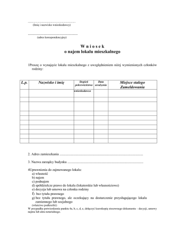 ................................................................... (Imię i nazwisko wnioskodawcy) .................................................. (adres korespondencyjny) Wniosek o najem lokalu mieszkalnego 1Proszę o wynajęcie lokalu mieszkalnego z uwzględnieniem niżej wymienionych członków rodziny: L.p. Nazwisko i imię Stopień Data pokrewieństwa urodzenia Miejsce stałego Zameldowania wnioskodawca 2. Adres zamieszkania .................................................................................................. 3. Nazwa zarządcy budynku ......................................................................................... 4Uprawnienia do zajmowanego lokalu: a) własność b) najem c) podnajem d) spółdzielcze prawo do lokalu (lokatorskie lub własnościowe) e) decyzja lub umowa na członka rodziny f) bez tytułu prawnego g) bez tytułu prawnego, ale oczekujący na dostarczenie przysługującego lokalu zamiennego lub socjalnego (właściwe podkreślić) W przypadku potwierdzenia punktu 4a, b, c, d, e, dołączyć kserokopię stosownego dokumentu – decyzji, umowy najmu lub aktu notarialnego. 5Powierzchnia użytkowa zajmowanego lokalu mieszkalnego ............ m2. 5Liczba izb w całym lokalu (łącznie z kuchnią) ........... . 5Liczba osób zamieszkałych w całym lokalu .........., w tym liczba osób rodziny wnioskodawcy .......... . 5Do jakich innych lokali mieszkalnych (domów) wnioskodawca, małżonek lub którykolwiek z członków rodziny zgłoszonych do wspólnego zamieszkania posiada tytuł prawny ? (podać adres) .............................................................................................................................................................................. ................................................................................................................................. Czy małżonek wnioskodawcy zamieszkuje w innym lokalu? - tak (podać adres) ......................................................................................................... - nie (właściwe podkreślić) Czy małżonek wnioskodawcy, zamieszkujący w innym lokalu, posiada do niego tytuł prawny?tak (podać adres lokalu) ................................................................................................. - nie (właściwe podkreślić) 5Czy wnioskodawca, małżonek lub którykolwiek z członków rodziny zgłoszonych do wspólnego zamieszkania posiadał tytuł prawny do lokalu mieszkalnego (domu), który następnie utracił lub, którego się zrzekł ? tak (podać imię i nazwisko ................................................................................... oraz adres) .......................................................................................................................... nie (właściwe podkreślić) 12.Uzasadnienie wniosku: ............................................................................................................................. .... ............................................................................................................................. ............................................................................................................................. ............................................................................................................................. ............................................................................................................................. ............................................................................................................................. ............................................................................................................................. ............................................................................................................................. ............................................................................................................................. ............................................................................................................................. ............................................................................................................................. ............................................................................................................................. ............................................................................................................................. ............................................................................................................................. .................................................... Oświadczam, że wszystkie podane przeze mnie informacje są zgodne z prawdą. Przyjmuję do wiadomości, że podanie nieprawdziwych danych spowoduje utratę dotychczas nabytych w sprawie uprawnień oraz pociągnięcie do odpowiedzialności karnej w trybie art. 233 kk. Zobowiązuję się natychmiast informować Wydział Spraw Społecznych Urzędu Miejskiego w Tczewie o wszystkich zmianach w danych z wniosku. .......................................... podpis wnioskodawcy Oświadczam, że zostałem(am) poinformowany(a) o przetwarzaniu danych osobowych przez Wydział Spraw Społecznych Urzędu Miejskiego w Tczewie w celu realizacji wniosku o najem lokalu mieszkalnego, a także możliwości ich przekazywania organom administracji publicznej i innym podmiotom. Zapoznałem (am) się z prawem wglądu do swoich danych i możliwości ich poprawiania. Podstawa prawna: art. 24 ustawy z dnia 29 sierpnia 1997 r. o ochronie danych osobowych (Dz. U. z 1997 r. Nr 133, poz. 883). data ..................... ......................................... podpis czytelny