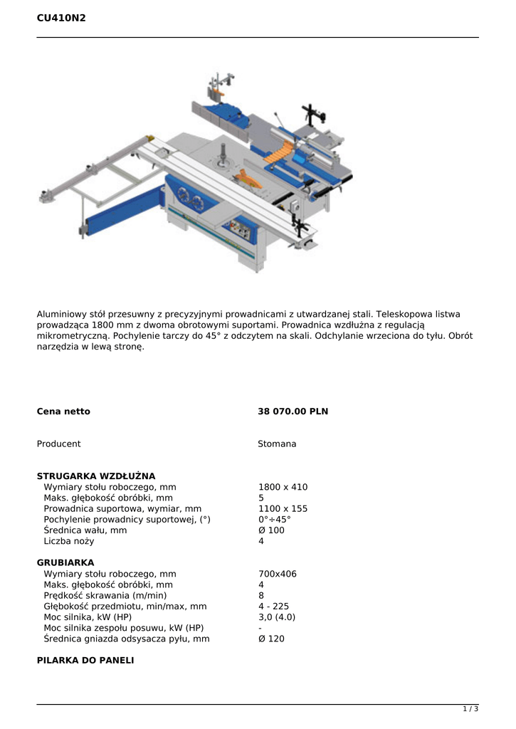 CU410N2 Aluminiowy stół przesuwny z precyzyjnymi prowadnicami z utwardzanej stali. Teleskopowa listwa prowadząca 1800 mm z dwoma obrotowymi suportami. Prowadnica wzdłużna z regulacją mikrometryczną. Pochylenie tarczy do 45° z odczytem na skali. Odchylanie wrzeciona do tyłu. Obrót narzędzia w lewą stronę. Cena netto 38 070.00 PLN Producent Stomana STRUGARKA WZDŁUŻNA Wymiary stołu roboczego, mm Maks. głębokość obróbki, mm Prowadnica suportowa, wymiar, mm Pochylenie prowadnicy suportowej, (°) Średnica wału, mm Liczba noży 1800 х 410 5 1100 х 155 0°÷45° Ø 100 4 GRUBIARKA Wymiary stołu roboczego, mm Maks. głębokość obróbki, mm Prędkość skrawania (m/min) Głębokość przedmiotu, min/max, mm Moc silnika, kW (HP) Moc silnika zespołu posuwu, kW (HP) Średnica gniazda odsysacza pyłu, mm 700x406 4 8 4 - 225 3,0 (4.0) Ø 120 PILARKA DO PANELI 1/3 CU410N2 Średnica tarczy – maks./min. Średnica wrzeciona, mm Prędkość wrzeciona, min-1 Długość prowadnicy równoległej Maksymalna szerokość cięcia przy prowadnicy wzdłużnej, mm Maksymalna długość cięcia, mm Pochylenie piły tarczowej, (°) Maksymalna wysokość cięcia 90°/45°, mm - Z tarczą Ø 315 mm - Z tarczą Ø 250 mm Moc silnika, kW (HP) Średnica gniazda odsysacza pyłu, mm FREZARKA WRZECIONOWA Średnica wrzeciona, mm Pochylenie wrzeciona, w tył (°) Przesuw pionowy wrzeciona, mm Wysokość robocza wrzeciona, mm Maks. średnica narzędzia, mm: - dla obróbki kształtowej - dla obróbki czopów Wrzeciono ze stożkiem Morse’a w wymiennej oprawce Odległość między przednią częścią stołu roboczego oraz środkiem wrzeciona, mm Średnica otworów w stole roboczym Maks. średnica/głębokość przesuwu narzędzia pod powierzchnię stołu, mm Prędkość wrzeciona, min-1 Moc silnika, kW (HP) Średnica gniazda odsysacza pyłu, mm - pod stołem roboczym; - urządzenia zabezpieczającego Osłona dla frezowania z prowadnicą suportu 2 x L, mm DŁUTOWNICA Maks. średnica przyrządu wiercącego, mm Wymiary stołu roboczego, mm Wzdłużny ruch, mm Poprzeczny ruch, mm Pionowy ruch, mm WYMIARY OGÓLNE Długość, mm Szerokość, mm Wysokość stołu roboczego, mm Wymiary stołu roboczego, mm Wymiary stołu roboczego, mm Waga (kg) Wymagany obszar, m Opcje: Jednostka nacinająca: Średnica tarczy, mm Średnica wrzeciona, mm Ø315/Ø 250 Ø 30 4000 1100 840 2150 0° до 45° 102 / 72 70 / 49 3.0 (4.0) Ø 120 Ø 30 90°/45° 175 125 Ø250 Ø300 MK4 550 Ø260 Ø250 / 60 10000 / 8000 / 6000 / 5000 / 4000 / 3000 3.2/4.2 (4.3/5.5) Ø 120 Ø 120 L=500 16 300 х 500 210 250 160 2500 2900 850 1450 х 650 2300 х 350 1090 6.5 х 7.0 ø 120 ø 20 2/3 CU410N2 Prędkość wrzeciona, min-1 8000 Moc silnika, kW (HP) 0.55 (1.1) Moc silnika głównej tarczy, kW (HP) 4.0 (5.5) Prowadnica kątowa (bez przedłużenia) 600, 900, 1219 Przedłużenie prowadnicy kątowej 600, 900/1219 Maksymalna szerokość cięcia z prowadnicą 1400 wzdłużną – ze stołem rozszerzającym i prowadnicą wzdłużną, mm Elektroniczny odczyt położenia dla prowadnicy wzdłużnej Prowadnica krótka z ogranicznikami kątowymi Stół ruchomy, mm 2550, 2800, 3000, 3200 Maksymalna szerokość obróbki jednostką 2400, 2600, 2900, 3100 nacinającą, mm Stół wspierający 500 x 320 mm stołu ruchomego Osłona wrzeciona dla obróbki kształtowej ze L =500 zintegrowanymi prowadnicami 2 x L, mm Lewe / prawe obroty wrzeciona Prędkość wrzeciona (2 prędkości), min-1 15000 / 9000 / 7500 / 6000 / 4500 / 3000 Moc silnika (2 prędkości), kW (HP) 4.5/5.5 (6.1/7.4) Średnica wymiennej oprawki MK4 / wysokość ø32/125;ø1¼”/125; ø35/125; ø40/125 robocza: Wymienna oprawka dla pracy z zaciskami ER32 Klucz do zacisków ER32 Stół i wyciąg do obróbki czopów, mm ø300 Podajnik (z 3 rolkami i 8 prędkościami) MX 38. Podajnik (z 4 rolkami i 8 prędkościami) MX 48. 3/3 Powered by TCPDF (www.tcpdf.org)