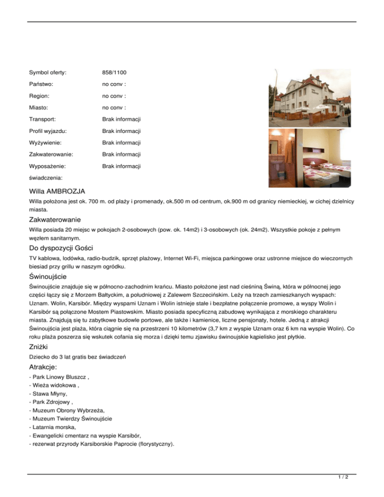 Symbol oferty: 858/1100 Państwo: no conv : Region: no conv : Miasto: no conv : Transport: Brak informacji Profil wyjazdu: Brak informacji Wyżywienie: Brak informacji Zakwaterowanie: Brak informacji Wyposażenie: Brak informacji świadczenia: Willa AMBROZJA Willa położona jest ok. 700 m. od plaży i promenady, ok.500 m od centrum, ok.900 m od granicy niemieckiej, w cichej dzielnicy miasta. Zakwaterowanie Willa posiada 20 miejsc w pokojach 2-osobowych (pow. ok. 14m2) i 3-osobowych (ok. 24m2). Wszystkie pokoje z pełnym węzłem sanitarnym. Do dyspozycji Gości TV kablowa, lodówka, radio-budzik, sprzęt plażowy, Internet Wi-Fi, miejsca parkingowe oraz ustronne miejsce do wieczornych biesiad przy grillu w naszym ogródku. Świnoujście Świnoujście znajduje się w północno-zachodnim krańcu. Miasto położone jest nad cieśniną Świną, która w północnej jego części łączy się z Morzem Bałtyckim, a południowej z Zalewem Szczecińskim. Leży na trzech zamieszkanych wyspach: Uznam. Wolin, Karsibór. Między wyspami Uznam i Wolin istnieje stałe i bezpłatne połączenie promowe, a wyspy Wolin i Karsibór są połączone Mostem Piastowskim. Miasto posiada specyficzną zabudowę wynikająca z morskiego charakteru miasta. Znajdują się tu zabytkowe budowle portowe, ale także i kamienice, liczne pensjonaty, hotele. Jedną z atrakcji Świnoujścia jest plaża, która ciągnie się na przestrzeni 10 kilometrów (3,7 km z wyspie Uznam oraz 6 km na wyspie Wolin). Co roku plaża poszerza się wskutek cofania się morza i dzięki temu zjawisku świnoujskie kąpielisko jest płytkie. Zniżki Dziecko do 3 lat gratis bez świadczeń Atrakcje: - Park Linowy Bluszcz , - Wieża widokowa , - Stawa Młyny, - Park Zdrojowy , - Muzeum Obrony Wybrzeża, - Muzeum Twierdzy Świnoujście - Latarnia morska, - Ewangelicki cmentarz na wyspie Karsibór, - rezerwat przyrody Karsiborskie Paprocie (florystyczny). 1/2 TERMINY: CENNIK: Długość pobytu: dni Grupa cenowa: Waluta: PLN Aktualne ceny z systemu S.A.R.T. (-) - cena usługi, podatku kalkulowana przy osobie lub gratis (*) - kwota wliczona w cenę standardową 2/2