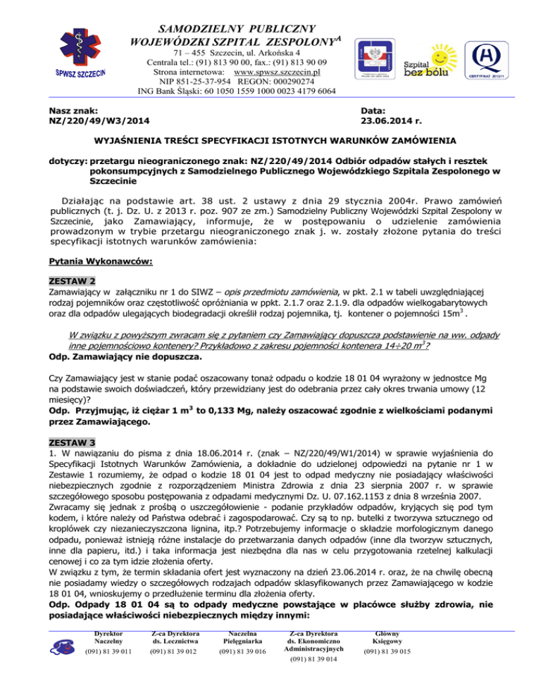 SAMODZIELNY PUBLICZNY WOJEWÓDZKI SZPITAL ZESPOLONY 71 – 455 Szczecin, ul. Arkońska 4 Centrala tel.: (91) 813 90 00, fax.: (91) 813 90 09 Strona internetowa: www.spwsz.szczecin.pl NIP 851-25-37-954 REGON: 000290274 ING Bank Śląski: 60 1050 1559 1000 0023 4179 6064 Nasz znak: NZ/220/49/W3/2014 Data: 23.06.2014 r. WYJAŚNIENIA TREŚCI SPECYFIKACJI ISTOTNYCH WARUNKÓW ZAMÓWIENIA dotyczy: przetargu nieograniczonego znak: NZ/220/49/2014 Odbiór odpadów stałych i resztek pokonsumpcyjnych z Samodzielnego Publicznego Wojewódzkiego Szpitala Zespolonego w Szczecinie Działając na podstawie art. 38 ust. 2 ustawy z dnia 29 stycznia 2004r. Prawo zamówień publicznych (t. j. Dz. U. z 2013 r. poz. 907 ze zm.) Samodzielny Publiczny Wojewódzki Szpital Zespolony w Szczecinie, jako Zamawiający, informuje, że w postępowaniu o udzielenie zamówienia prowadzonym w trybie przetargu nieograniczonego znak j. w. zostały złożone pytania do treści specyfikacji istotnych warunków zamówienia: Pytania Wykonawców: ZESTAW 2 Zamawiający w załączniku nr 1 do SIWZ – opis przedmiotu zamówienia, w pkt. 2.1 w tabeli uwzględniającej rodzaj pojemników oraz częstotliwość opróżniania w ppkt. 2.1.7 oraz 2.1.9. dla odpadów wielkogabarytowych oraz dla odpadów ulegających biodegradacji określił rodzaj pojemnika, tj. kontener o pojemności 15m3 . W związku z powyższym zwracam się z pytaniem czy Zamawiający dopuszcza podstawienie na ww. odpady inne pojemnościowo kontenery? Przykładowo z zakresu pojemności kontenera 14÷20 m 3? Odp. Zamawiający nie dopuszcza. Czy Zamawiający jest w stanie podać oszacowany tonaż odpadu o kodzie 18 01 04 wyrażony w jednostce Mg na podstawie swoich doświadczeń, który przewidziany jest do odebrania przez cały okres trwania umowy (12 miesięcy)? Odp. Przyjmując, iż ciężar 1 m3 to 0,133 Mg, należy oszacować zgodnie z wielkościami podanymi przez Zamawiającego. ZESTAW 3 1. W nawiązaniu do pisma z dnia 18.06.2014 r. (znak – NZ/220/49/W1/2014) w sprawie wyjaśnienia do Specyfikacji Istotnych Warunków Zamówienia, a dokładnie do udzielonej odpowiedzi na pytanie nr 1 w Zestawie 1 rozumiemy, że odpad o kodzie 18 01 04 jest to odpad medyczny nie posiadający właściwości niebezpiecznych zgodnie z rozporządzeniem Ministra Zdrowia z dnia 23 sierpnia 2007 r. w sprawie szczegółowego sposobu postępowania z odpadami medycznymi Dz. U. 07.162.1153 z dnia 8 września 2007. Zwracamy się jednak z prośbą o uszczegółowienie - podanie przykładów odpadów, kryjących się pod tym kodem, i które należy od Państwa odebrać i zagospodarować. Czy są to np. butelki z tworzywa sztucznego od kroplówek czy niezanieczyszczona lignina, itp.? Potrzebujemy informacje o składzie morfologicznym danego odpadu, ponieważ istnieją różne instalacje do przetwarzania danych odpadów (inne dla tworzyw sztucznych, inne dla papieru, itd.) i taka informacja jest niezbędna dla nas w celu przygotowania rzetelnej kalkulacji cenowej i co za tym idzie złożenia oferty. W związku z tym, że termin składania ofert jest wyznaczony na dzień 23.06.2014 r. oraz, że na chwilę obecną nie posiadamy wiedzy o szczegółowych rodzajach odpadów sklasyfikowanych przez Zamawiającego w kodzie 18 01 04, wnioskujemy o przedłużenie terminu dla złożenia oferty. Odp. Odpady 18 01 04 są to odpady medyczne powstające w placówce służby zdrowia, nie posiadające właściwości niebezpiecznych między innymi: Dyrektor Naczelny Z-ca Dyrektora ds. Lecznictwa Naczelna Pielęgniarka (091) 81 39 011 (091) 81 39 012 (091) 81 39 016 Z-ca Dyrektora ds. Ekonomiczno Administracyjnych (091) 81 39 014 Główny Księgowy (091) 81 39 015 -opakowania po lekach z wyłączeniem materiałów recyklingowych / szkło ,plastik, makulatura / -zużyte pampersy z wyjątkiem oddziałów zakaźnych oraz pacjentów z podejrzeniem lub potwierdzeniem choroby zakaźnej i od chorych z biegunką - odpady pozostałe po sprzątaniu -opakowania po środkach spożywczych pochodzących z sal chorych z wyjątkiem oddziałów zakaźnych oraz pacjentów z podejrzeniem lub potwierdzeniem choroby zakaźnej i od chorych z biegunką - nieskażone rękawice gumowe , lateksowe np.: po sprzątaniu kuchenek gabinetów lekarskich , biur itp. -nieskażone ochraniacze na obuwie , włosy, maseczki , fartuchy jednorazowe , ręczniki . -podpaski itp. -niktóre opakowania po środkach dezynfekcyjnych / zgodnie z kartami charakterystyk / - nieskażona pościel jednorazowa - opatrunki gipsowe nie zanieczyszczone materiałem biologicznym Termin składania ofert został wydłużony do dnia 26.06.2014 r. do godziny 09:00, zgodnie z informacją udzieloną w piśmie z dnia 20.06.2014 r. znak: NZ/220/49/W2/2014 i zamieszczoną na stronie internetowej Zamawiającego w zakładce „wyjaśnienia”. ZESTAW 4 Odp. Termin składania ofert został wydłużony do dnia 26.06.2014 r. do godziny 09:00, zgodnie z informacją udzieloną w piśmie z dnia 20.06.2014 r. znak: NZ/220/49/W2/2014 i zamieszczoną na stronie internetowej Zamawiającego w zakładce „wyjaśnienia”. Odp. Zamawiający nie przewiduje gromadzenia odpadu 18 01 04 w innych kontenerach niż prasokontenery. ZESTAW 5 2 Odp. Dotyczy kodu 18 01 04 są to odpady medyczne powstające w placówce służby zdrowia, nie posiadające właściwości niebezpiecznych między innymi: -opakowania po lekach z wyłączeniem materiałów recyklingowych / szkło ,plastik, makulatura / -zużyte pampersy z wyjątkiem oddziałów zakaźnych oraz pacjentów z podejrzeniem lub potwierdzeniem choroby zakaźnej i od chorych z biegunką - odpady pozostałe po sprzątaniu -opakowania po środkach spożywczych pochodzących z sal chorych z wyjątkiem oddziałów zakaźnych oraz pacjentów z podejrzeniem lub potwierdzeniem choroby zakaźnej i od chorych z biegunką - nieskażone rękawice gumowe , lateksowe np.: po sprzątaniu kuchenek gabinetów lekarskich , biur itp. -nieskażone ochraniacze na obuwie , w