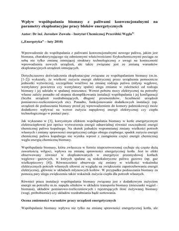 Wpływ współspalania biomasy z paliwami konwencjonalnymi parametry eksploatacyjne pracy bloków energetycznych na Autor: Dr inż. Jarosław Zuwała - Instytut Chemicznej Przeróbki Węgla1) („Energetyka” – luty 2010) Wprowadzenie do współspalania z paliwami konwencjonalnymi nowego paliwa, jakim jest biomasa, charakteryzującego się odmiennymi właściwościami fizykochemicznymi pociąga za sobą nie tylko zmianę istniejącej struktury technologicznej z uwagi na konieczność wprowadzenia nowych urządzeń, ale także związane jest ze zmianą warunków eksploatacyjnych urządzeń istniejących. Dotychczasowe doświadczenia eksploatacyjne związane ze współspalaniem biomasy (m.in. [1-2]) wykazały, że wielkość zużycia energii elektrycznej przez urządzenia pomocnicze jednostki wytwórczej, szczególnie wrażliwe na zmianę rodzaju paliwa (młyny węglowe, wentylatory powietrza czy wentylatory spalin) ulega zmianie w zależności od rodzaju biomasy i jej udziału w spalanej mieszance. Wzrost poboru mocy elektrycznej na potrzeby własne zależy ponadto od stopnia skomplikowania instalacji współspalania i jej konfiguracji (liczba urządzeń rozdrabniających, długość przenośników, liczebność urządzeń pomiarowo-rozliczeniowych etc). Ponadto, funkcjonowanie dodatkowych instalacji (np. urządzeń do podsuszania biomasy przed jej wprowadzeniem do komory paleniskowej) może dodatkowo wpływać na wzrost zużycia napędowej energii elektrycznej czy ciepła technologicznego w postaci pary. Jak wykazano w [3], korzystnym efektem współspalania biomasy w kotle energetycznym elektrociepłowni jest oprócz wytworzenia energii odnawialnej również oszczędność energii chemicznej paliwa kopalnego. Na skutek jednakże wspomnianej zmiany wielkości potrzeb własnych i zmiany sprawności energetycznej całego obiegu cieplnego, spadek zużycia energii chemicznej paliwa kopalnego nie wynika wprost z zastąpienia części energii chemicznej węgla energią chemiczną biomasy. Współspalanie biomasy, która zwłaszcza w formie nieprzetworzonej cechuje się często dużą zawartością wilgoci, wpływa na zmianę sprawności energetycznej kotła. Jest to efekt obserwowany również w eksploatowanych w energetyce przemysłowej kotłach węglowe—gazowych, w których spalane są niskokaloryczne paliwa gazowe (np. gaz wielkopiecowy [4]). Równocześnie obserwuje się zmiany w wielkości wskaźnika elektrycznych potrzeb własnych siłowni ze względu na zwiększenie zapotrzebowania energii elektrycznej, głównie w układach młynowych kotłów. W przypadku podsuszania biomasy za pomocą pary ulega zwiększeniu także wskaźnik zużycia ciepła dla potrzeb własnych. Również praca instalacji współspalania biomasy związana jest z dodatkowym zużyciem energii na potrzeby m.in. napędu silników w układzie transportu biomasy (mieszanki węgiel biomasa), układów pomiarowo-rozliczeniowych i rejestrujących ilość zużywanej biomasy (wagi, próbobiernie) czy układów rozdrabniania bądź sortowania. Ocena zmienności warunków pracy urządzeń energetycznych Współspalanie biomasy wpływa nie tylko na zmianę sprawności energetycznej kotła, ale również na zmianę wskaźnika potrzeb własnych - głównie elektrycznych, a w niektórych przypadkach także cieplnych (np. gdy do celów podsuszania biomasy loco elektrownia wykorzystuje się parę). Wskaźnik potrzeb własnych stanowi (wraz ze sprawnością obiegu i sprawnością elektromechaniczną turbozespołu) czynnik wpływający na sprawność energetyczną netto bloku zgodnie z zależnościami (1), (2) obowiązującymi odpowiednio: • dla spalania samego węgla: • dla współspalania biomasy: gdzie: ηEN0 , ηEN - sprawność energetyczna netto bloku opalanego odpowiednio: wyłącznie węglem kamiennym i mieszanką węgiel - biomasa, εel0, εel - wskaźnik elektrycznych potrzeb własnych bloku energetycznego w przypadku opalania odpowiednio węglem kamiennym i mieszanką węgiel - biomasa, ηEk0 , ηEk - sprawność energetyczna kotła opalanego odpowiednio węglem kamiennym i mieszanką węgiel biomasa. W zależnościach (1), (2) czynniki ηtob (sprawność cieplna obiegu) i ηme (sprawność elektromechaniczna turbozespołu) nie zależą od udziału biomasy w mieszance. Uwzględniając to oraz dzieląc równania stronami otrzymuje się: Zależności empiryczne ujmujące wpływ współspalania biomasy można wyprowadzić na podstawie znajomości parametrów charakteryzujących pracę kotła energetycznego w warunkach współspalania biomasy (z odniesieniem do spalania samego paliwa podstawowego) oraz parametrów pracy instalacji pomocniczych (układu paliwo - powietrze spaliny). Z uwagi na możliwość współspalania biomasy z węglem kamiennym i węglem brunatnym analizie poddano oba warianty. W obu przypadkach wykorzystano głównie własny obszerny materiał badawczy, odnosząc uzyskane wyniki do dostępnych informacji literaturowych. Metodyka wyznaczenia wartości liczbowej stosunków biomasy w mieszance będzie zaprezentowana poniżej. oraz w funkcji udziału Współspalanie biomasy z węglem kamiennym Wykorzystując wyniki własnych prac naukowo-badawczych i wdrożeniowych wybrano należący do jednej z krajowych elektrowni systemowych kocioł - reprezentant (OP-650), na którym Instytut Chemicznej Przeróbki Węgla zrealizował program badawczy w zakresie analizy parametrów energetycznych i emisyjnych towarzyszących procesowi współspalania biomasy. Zakres tego programu, obejmujący najszerszy z danego zbioru eksperymentów przedział zmienności rodzajów biomasy, jej parametrów fizykochemicznych udziału energetycznego pozwolił na potraktowanie opisanego w tej pracy kotła jako reprezentatywnego, a wyprowadzonym charakterystykom nadał uniwersalność zastosowania. W omawianym kotle współspalaniu poddano m.in. paliwa scharakteryzowane w tabeli 1. Zawarte w [5] wyniki obliczeń pozwoliły na wyprowadze