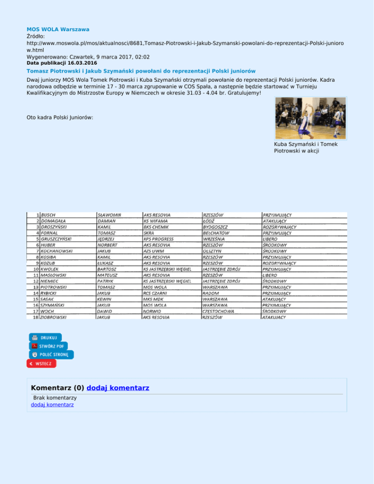 MOS WOLA Warszawa Źródło: http://www.moswola.pl/mos/aktualnosci/8681,Tomasz-Piotrowski-i-Jakub-Szymanski-powolani-do-reprezentacji-Polski-junioro w.html Wygenerowano: Czwartek, 9 marca 2017, 02:02 Data publikacji 16.03.2016 Tomasz Piotrowski i Jakub Szymański powołani do reprezentacji Polski juniorów Dwaj juniorzy MOS Wola Tomek Piotrowski i Kuba Szymański otrzymali powołanie do reprezentacji Polski juniorów. Kadra narodowa odbędzie w terminie 17 - 30 marca zgrupowanie w COS Spała, a następnie będzie startować w Turnieju Kwalifikacyjnym do Mistrzostw Europy w Niemczech w okresie 31.03 - 4.04 br. Gratulujemy! Oto kadra Polski Juniorów: Kuba Szymański i Tomek Piotrowski w akcji Komentarz (0) dodaj komentarz Brak komentarzy dodaj komentarz