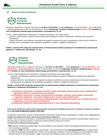 Powiatowy Urząd Pracy w Zgierzu http://pupzgierz.pl/wydarzenie/341/krajowy-fundusz-szkoleniowy Krajowy Fundusz Szkoleniowy Powiatowy Urząd Pracy w Zgierzu informuje, że od dnia 13.06.2016 r. będą wydawane, a od 20.06.2016 r. do 24.06.2016 r. będą przyjmowane wnioski na finansowanie w ramach Krajowego Funduszu Szkoleniowego (rezerwa KFS) działań na rzecz kształcenia ustawicznego pracowników i pracodawców, tj. na: ● kursy i studia podyplomowe realizowane z inicjatywy pracodawcy lub za jego zgodą, egzaminy umożliwiające uzyskanie dokumentów potwierdzających nabycie umiejętności, kwalifikacji lub uprawnień zawodowych, badania lekarskie i psychologiczne wymagane do podjęcia kształcenia lub pracy zawodowej po ukończonym kształceniu, ubezpieczenie od następstw nieszczęśliwych wypadków w związku z podjętym kształceniem. ❍ ❍ ❍ Środki z rezerwy KFS mogą być przeznaczone na finansowanie działań związanych z kształceniem ustawicznym zgodnych z ustalonymi priorytetami, tj. na: Powiatowy Urząd Pracy w Zgierzu informuje, że od dnia 13.06.2016 r. będą wydawane, a od 20.06.2016 r. do 24.06.2016 r. będą przyjmowane wnioski na finansowanie w ramach Krajowego Funduszu Szkoleniowego (rezerwa KFS) działań na rzecz kształcenia ustawicznego pracowników i pracodawców, tj. na: ● kursy i studia podyplomowe realizowane z inicjatywy pracodawcy lub za jego zgodą, egzaminy umożliwiające uzyskanie dokumentów potwierdzających nabycie umiejętności, kwalifikacji lub uprawnień zawodowych, badania lekarskie i psychologiczne wymagane do podjęcia kształcenia lub pracy zawodowej po ukończonym kształceniu, ubezpieczenie od następstw nieszczęśliwych wypadków w związku z podjętym kształceniem. ❍ ❍ ❍ Środki z rezerwy KFS mogą być przeznaczone na finansowanie działań związanych z kształceniem ustawicznym zgodnych z ustalonymi priorytetami, tj. na: a) kształcenie ustawiczne w branżach/zawodach, gdzie pracodawcy oferują miejsca pracy i jednocześnie zgłaszają trudności z zatrudnianiem pracowników, b) kształcenie ustawiczne w branży transportowej w zawodach: kierowcy samochodów ciężarowych i ciągników siodłowych, maszyniści kolejowi oraz w branży usług opiekuńczych, c) kształcenie ustawiczne w branżach/przedsiębiorstwach restrukturyzowanych, np. w branży górnictwa węglowego, w celu utrzymania zatrudnienia, d) kształcenie ustawiczne osób niepełnosprawnych w celu utrzymania zatrudnienia. Średni koszt kształcenia ustawicznego finansowanego z przyznanych środków rezerwy KFS, na jednego uczestnika w urzędzie pracy nie może przekroczyć kwoty 4 253,10zł. Pracodawca może złożyć wniosek o dofinansowanie kształcenia ustawicznego w powiatowym urzędzie pracy właściwym ze względu na siedzibę pracodawcy albo miejsce prowadzenia działalności. Środki z KFS przyznane pracodawcy na podstawie umowy zawartej ze starostą (dyrektorem powiatowego urzędu pracy), stanowią pomoc udzielaną zgodnie z warunkami dopuszczalności pomocy de minimis. W ramach KFS możliwe jest sfinansowanie: ● ● 80% kosztów kształcenia ustawicznego, nie więcej jednak niż do wysokości 300% przeciętnego wynagrodzenia w danym roku na jednego uczestnika, do wysokości 100% kosztów kształcenia ustawicznego – jeśli wnioskodawca jest mikroprzedsiębiorcą, nie więcej jednak niż 300% przeciętnego wynagrodzenia w danym roku na jednego uczestnika (mikroprzedsiębiorca to przedsiębiorca, który zatrudnia mniej niż 10 pracowników, a jego roczny obrót lub całkowity bilans roczny nie przekracza 2 mln euro). Aktualny druk wniosku dostępny będzie na stronie internetowej: www.pupzgierz.pl, w zakładce Dokumenty do pobrania lub w siedzibie Urzędu, pok. 1 (oraz w Punktach Informacyjno-Konsultacyjnych działających na terenie Powiatu Zgierskiego.