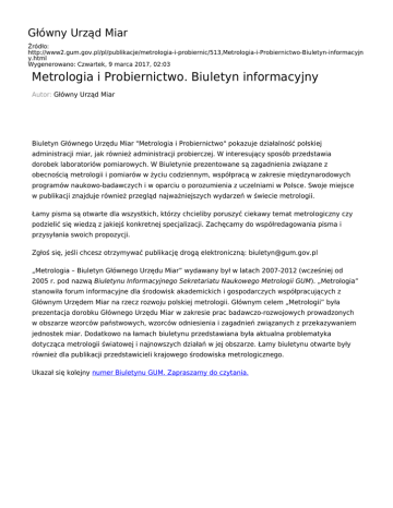 Główny Urząd Miar Źródło: http://www2.gum.gov.pl/pl/publikacje/metrologia-i-probiernic/513,Metrologia-i-Probiernictwo-Biuletyn-informacyjn y.html Wygenerowano: Czwartek, 9 marca 2017, 02:03 Metrologia i Probiernictwo. Biuletyn informacyjny Autor: Główny Urząd Miar Biuletyn Głównego Urzędu Miar "Metrologia i Probiernictwo" pokazuje działalność polskiej administracji miar, jak również administracji probierczej. W interesujący sposób przedstawia dorobek laboratoriów pomiarowych. W Biuletynie prezentowane są zagadnienia związane z obecnością metrologii i pomiarów w życiu codziennym, współpracą w zakresie międzynarodowych programów naukowo-badawczych i w oparciu o porozumienia z uczelniami w Polsce. Swoje miejsce w publikacji znajduje również przegląd najważniejszych wydarzeń w świecie metrologii. Łamy pisma są otwarte dla wszystkich, którzy chcieliby poruszyć ciekawy temat metrologiczny czy podzielić się wiedzą z jakiejś konkretnej specjalizacji. Zachęcamy do współredagowania pisma i przysyłania swoich propozycji. Zgłoś się, jeśli chcesz otrzymywać publikację drogą elektroniczną: [email protected] „Metrologia – Biuletyn Głównego Urzędu Miar” wydawany był w latach 2007-2012 (wcześniej od 2005 r. pod nazwą Biuletynu Informacyjnego Sekretariatu Naukowego Metrologii GUM). „Metrologia” stanowiła forum informacyjne dla środowisk akademickich i gospodarczych współpracujących z Głównym Urzędem Miar na rzecz rozwoju polskiej metrologii. Głównym celem „Metrologii” była prezentacja dorobku Głównego Urzędu Miar w zakresie prac badawczo-rozwojowych prowadzonych w obszarze wzorców państwowych, wzorców odniesienia i zagadnień związanych z przekazywaniem jednostek miar. Dodatkowo na łamach biuletynu przedstawiana była aktualna problematyka dotycząca metrologii światowej i najnowszych działań w jej obszarze. Łamy biuletynu otwarte były również dla publikacji przedstawicieli krajowego środowiska metrologicznego. Ukazał się kolejny numer Biuletynu GUM. Zapraszamy do czytania.