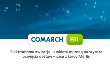 Elektroniczna awizacja i etykieta metodą na szybsze przyjęcia dostaw – case z Leroy Merlin Insert presentation title Trendy w łańcuchu dostaw Wzrost kosztów logistycznych Outsourcing usług logistycznych Kompleksowe zarządzanie łańcuchem (Rozwiązania IT) Polski Kongres Logistyczny LOGISTICS 2012 / 16.05.2012 Zrównoważony rozwój (ekologia) Wspólna organizacja procesów transportowych Strona 2 Insert presentation title Etykieta logistyczna – fakty Skrócenie czasu przyjęcia dostawy z zewnątrz z wykorzystaniem etykiety wraz z elektroniczną awizacją skraca się do 33% czasu przyjęcia realizowanego tradycyjnie (Źródło: GS1) W krajach skandynawskich 90% wszystkich etykiet na paletach to etykiety zgodne z GS1 (Źródło: GS1) Polski Kongres Logistyczny LOGISTICS 2012 / 16.05.2012 Przykłady użycia etykiet logistycznych z DESADV w Europie: • Carrefour Belgium • Remia Netherlands • Casino France • Laurus Netherlands • Sligro Food Netherlands 4% uczestników systemu GS1 w Polsce stosuje standardową etykietę logistyczną (Źródło: GS1) Strona 3 Insert presentation title Leroy Merlin – o firmie Data założenia: 1923 r. we Francji Pozycja Groupe ADEO: 2-gi w Europie i 4-ty na świecie dystrybutor w branży DIY Rozpoczęcie działalności w PL: 1994 r. Liczba sklepów: 43 sklepy Powierzchnia sklepów: 6 000 – 18 000 m2 80% towarów oferowanych w sklepach Leroy Merlin pochodzi od polskich producentów i dystrybutorów Liczba dostawców: ok. 1000 Polski Kongres Logistyczny LOGISTICS 2012 / 16.05.2012 Strona 4 Insert presentation title Leroy Merlin – logistyka Centrum Logistyczne w Strykowie: Od 01.01.2009 Powierzchnia 56 000 m2 Wysokość 12 m i 68 doków rozładunkowo-załadunkowych Prowadzi dystrybucję do wszystkich sklepów Leroy Merlin 7 000 indeksów asortymentowych o różnych gabarytach Współpraca z firmą Spedimex w obsłudze centrum Polski Kongres Logistyczny LOGISTICS 2012 / 16.05.2012 Strona 5 Insert presentation title Leroy Merlin – cel projektu POPRAWA JAKOŚCI ETYKIET LOGISTYCZNYCH SKRÓCENIE CZASU ODBIORU TOWARÓW SZYBSZY PRZESYŁ INFORMACJI NISKI NAKŁAD ZASOBÓW DOSTAWCÓW START PROJEKTU W KRÓTKIM CZASIE Polski Kongres Logistyczny LOGISTICS 2012 / 16.05.2012 Strona 6 Insert presentation title Leroy Merlin – case study Awizacja wraz z etykietą logistyczną Kompletacja SIEĆ HANDLOWA Etykiety SSCC (KANAŁ NOWOCZESNY) Awizacja (+ dodatkowe ) Polski Kongres Logistyczny LOGISTICS 2012 / 16.05.2012 Strona 7 Insert presentation title Leroy Merlin – wdrożenie Rozszerzenie Rozszerzenie funkcjonalności funkcjonalności Comarch EDI Comarch EDI Web używanej Web używanej w komunikacji w komunikacji EDI EDI Szybkie ii proste proste Szybkie wyszukiwanie wyszukiwanie Szybkie i proste Zamówień crossZamówień wyszukiwanie dockingowych crossZamówień dockingowych crossdockingowych Zaczytywanie Zaczytywanie danychz z danych otrzymanych otrzymanych Zamówień Zamówień podczas podczas tworzenia tworzenia DESADV DESADV Intuicyjne Intuicyjne Zawężenie ‘pakowanie‘ ‘pakowanie‘ wyboru typu zamówionych zamówionych opakowań do towarów do towarów do używanych zdefiniowanych zdefiniowanych przez opakowań Leroy opakowań Merlin (np. Automatyczne (ze wskazanej Automatyczne puli) lub ręczne (ze wskazanej generowanie puli) lub ręczne numeru SSCC generowanie numeru SSCC Zawężenie Zawężenie Intuicyjne wyboru typu wyboru typu ‘pakowanie‘ opakowań opakowań do do zamówionych wykorzystywan wykorzystywan towarów do ych przez ych przez Leroy Leroy zdefiniowanych Merlin Merlin (np. (np. opakowań paleta, paczka) paleta, paczka) paleta, paczka) Polski Kongres Logistyczny LOGISTICS 2012 / 16.05.2012 Weryfikacja danych wpisywanych przez Dostawców Wydruk etykiety Wydruk logistycznej etykiety zgodny z logistycznej szablonem zgodny z szablonem Strona 8 Insert presentation title Logowanie do aplikacji Polski Kongres Logistyczny LOGISTICS 2012 / 16.05.2012 Strona 9 Insert presentation title Tworzenie DESADV na podstawie ORDER Polski Kongres Logistyczny LOGISTICS 2012 / 16.05.2012 Strona 10 Insert presentation title Generowanie kodu SSCC Polski Kongres Logistyczny LOGISTICS 2012 / 16.05.2012 Strona 11 Insert presentation title Pakowanie towarów Polski Kongres Logistyczny LOGISTICS 2012 / 16.05.2012 Strona 12 Insert presentation title Zapakowana dostawa Polski Kongres Logistyczny LOGISTICS 2012 / 16.05.2012 Strona 13 Insert presentation title Wysłanie DESADV Polski Kongres Logistyczny LOGISTICS 2012 / 16.05.2012 Strona 14 Insert presentation title Wysłane DESADV Polski Kongres Logistyczny LOGISTICS 2012 / 16.05.2012 Strona 15 Insert presentation title Wydruk etykiety Polski Kongres Logistyczny LOGISTICS 2012 / 16.05.2012 Strona 16 Insert presentation title Korzyści Leroy Merlin SKRÓCENIE CZASU PRZYJMOWANIA DOSTAW • WCZEŚNIEJSZE OTRZYMANIE INFORMACJI O OTRZYMANYM TOWARZE (DESADV) – EFEKTYWNIEJSZE PLANOWANIE PRZYJĘĆ • AUTOMATYZACJA WERYFIKACJA PRODUKTÓW (ORDER vs. DESADV) • OBSŁUGA WIĘKSZEJ LICZBY DOSTAW W JEDNYM OKNIE CZASOWYM SZYBKI START PROJEKTU • JEDNO NARZĘDZIE DO KOMUNIKACJI EDI I GENEROWANIA ETYKIET • PRZYZWYCZAJENIE DOSTAWCÓW DO JEGO WYKORZYSTANIA • DOŚWIADCZENIE COMARCH (PROJECT MANAGEMENT, CALL CENTER) LEPSZA WSPÓŁPRACA Z DOSTAWCAMI • LEPSZA MOŻLIWOŚĆ LOKALIZACJI PRZESYŁEK W RAZIE NIEPOROZUMIEŃ • MNIEJSZA LICZBA ZAGUBIEŃ I OPÓŹNIEŃ W DOSTAWACH • MNIEJSZA LICZBA NIEPOROZUMIEŃ ZE WZGLĘDU NA BRAK INDYWIDUALNYCH ROZWIĄZAŃ Polski Kongres Logistyczny LOGISTICS 2012 / 16.05.2012 Strona 17 Insert presentation title LOGISTYKA PRODUKCJA IFTMIN, INSDES, HANMOV LOGISTYKA IFTMIN, INSDES, HANMOV INVRPT, IFTSTA, OSTRPT OPERATOR LOGISTYCZNY MAGAZYN PRODUCENT IFTMIN, INSDES IFTMIN, INSDES IFTSTA, OSTRPT LOGISTYKA MAGAZYN DESADV, INVOIC OPERATOR LOGISTYCZNY IFTSTA, OSTRPT PRZEWOŹNIK INVRPT, IFTSTA, OSTRPT LOGISTYKA LOGISTYKA ORDER, RECADV PRZEWOŹNIK IFTMIN, INSDES, HANMOV ODBIORCA Sieć handlowa (kan