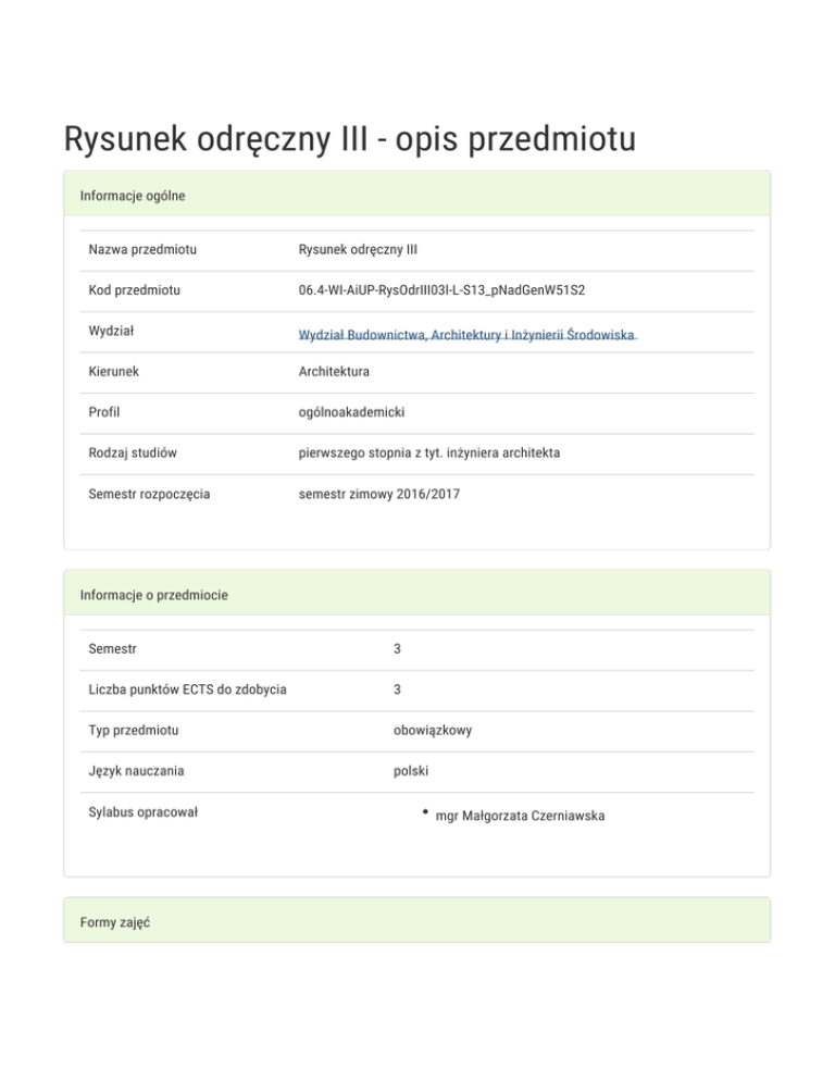 Rysunek odręczny III - opis przedmiotu Informacje ogólne Nazwa przedmiotu Rysunek odręczny III Kod przedmiotu 06.4-WI-AiUP-RysOdrIII03l-L-S13_pNadGenW51S2 Wydział Wydział Budownictwa, Architektury i Inżynierii Środowiska Kierunek Architektura Profil ogólnoakademicki Rodzaj studiów pierwszego stopnia z tyt. inżyniera architekta Semestr rozpoczęcia semestr zimowy 2016/2017 Informacje o przedmiocie Semestr 3 Liczba punktów ECTS do zdobycia 3 Typ przedmiotu obowiązkowy Język nauczania polski Sylabus opracował Formy zajęć mgr Małgorzata Czerniawska Forma zajęć Laboratorium Liczba godzin Liczba godzin Liczba godzin w Liczba godzin w Forma w semestrze w tygodniu semestrze tygodniu zaliczenia (stacjonarne) (stacjonarne) (niestacjonarne) (niestacjonarne) 45 3 - - Zaliczenie na ocenę Cel przedmiotu 1. Celem w zakresie wiedzy jest: ugruntowanie wiedzy o rysunku na przykładzie prac wybitnych malarzy i architektów. 2. Celem w zakresie umiejętności jest: ugruntowanie umiejętności posługiwania się różnymi rodzajami rysunku w zależności od sytuacji np. syntetyczny szkic koncepcyjny, lawowanie, czy budowanie nastroju przy pomocy światłocienia, z uwzględnieniem różnorodności faktur i materii. 3. Celem w zakresie kompetencji personalnych i społecznych jest: ugruntowanie umiejętności prezentowania i uzasadniania własnych interpretacji kompozycji ustawionych w pracowni, oraz architektury rysowanej w plenerze, a także wyrobienie potrzeby zarówno dyskusji, jak i sztuki swobodnego dzielenia się wrażeniami na temat własnych prac oraz prac swoich kolegów. Wymagania wstępne Formalne: Uzyskanie pozytywnej oceny z przedmiotu: Rysunek Odręczny II. Nieformalne: Umiejętność prawidłowej interpretacji zadania z uwzględnieniem kierunków, proporcji, wzajemnych relacji form w obserwowanym zjawisku, różnic w natężeniu światła, oraz niuansów materii na różnorodnych powierzchniach. Znajomość szkiców i rysunków wybitnych malarzy i architektów. Zakres tematyczny Program laboratorium:: 1. Na podstawie zaproponowanego układu różnych form /pracownia/ narysować interpretację własną tej kompozycji: biorąc pod uwagę różnorodność faktur i materii zbudować klimat, uwzględniając przestrzeń, proporcje, oraz dynamikę układu. 2. Znaleźć w plenerze obiekty architektury zabytkowej oraz współczesnej i wykonać serię szybkich szkiców, dokonując syntezy określonego problemu, a na dużym formacie narysować studium uwzględniające faktury i materie podkreślające charakter wybranego obiektu. 3. Na podstawie martwej natury /pracownia/ narysować dwie kompozycje: statyczną oraz dynamiczną akcentując wybrane elementy układu oraz materie podkreślające klimat i charakter danego opracowania. 4. Wyszukać w plenerze obiekty architektoniczne i narysować dwie kompozycje pokazujące różne aspekty światła w architekturze: prześwit i zaułek, używając środków wyrazu charakterystycznych dla danego problemu. Metody kształcenia Metody podające: zaprezentowanie szkiców i rysunków wybitnych twórców oraz wybór prac studentów (Galeria Sztuki KAiU UZ). Metody poszukujące: studium martwej natury w pracowni, szkice i rysunki w plenerze. Efekty kształcenia i metody weryfikacji osiągania efektów kształcenia Opis efektu Symbole Metody weryfikacji Forma zajęć efektów umie zinterpretować wybraną formę K_U01 obserwacje i ocena architektoniczną na płaszczyźnie obrazu umiejętności zarówno w syntetycznym szkicu, jak i w praktycznych szerszym opracowaniu, oddającym studenta Laboratorium dynamikę, charakter i klimat obiektu z uwzględnieniem różnorodności faktur i materii. posiada znajomość różnych koncepcji rysunku na przykładach prac wybitnych twórców. K_W01 odpowiedź ustna Laboratorium Opis efektu Symbole Metody weryfikacji Forma zajęć efektów potrafi zaprezentować i uzasadnić własne K_K01 aktywność w interpretacje kompozycji ustawionych w trakcie zajęć pracowni, oraz architektury rysowanej w obserwacje i ocena plenerze, a także zarówno dyskutować, jak umiejętności i swobodnie dzielić się wrażeniami na praktycznych temat własnych prac oraz prac swoich studenta Laboratorium kolegów. Warunki zaliczenia Laboratorium: Student rozwinął wiedzę o rysunku na przykładzie prac wybitnych malarzy i architektów. Na podstawie zaproponowanego układu różnych form, narysował własną interpretację tej kompozycji, biorąc pod uwagę różnorodność faktur i materii, uwzględniając przestrzeń, proporcje, oraz dynamikę układu. Znalazł w plenerze obiekty architektury zabytkowej oraz współczesnej i wykonał serię szybkich szkiców, dokonując syntezy określonego problemu, a na dużym formacie narysował studium uwzględniające faktury i materie podkreślające charakter wybranego obiektu. Na podstawie martwej natury narysował dwie kompozycje: statyczną i dynamiczną, akcentując wybrane elementy układu oraz materie podkreślające klimat i charakter danego opracowania. Wyszukał w plenerze obiekty architektoniczne i narysował dwie kompozycje pokazujące różne aspekty światła w architekturze: prześwit i zaułek, używając środków wyrazu charakterystycznych dla danego problemu. Ma twórcze podejście do własnej interpretacji martwej natury ustawionej w pracowni, oraz architektury rysowanej w plenerze, a także swobodnie dyskutuje i dzieli się wrażeniami na temat własnych prac oraz prac swoich kolegów. Obciążenie pracą Obciążenie pracą Studia Studia niestacjonarne stacjonarne (w godz.) (w godz.) Godziny kontaktowe (udział w zajęciach; konsultacjach; egzaminie, itp.) 45 - Samodzielna praca studenta (przygotowanie do: zajęć, kolokwium, 30 - Łącznie 75 - Punkty ECTS Studia Studia niestacjonarne egzaminu; studiowanie literatury przygotowanie: pracy pisemnej, projektu, prezentacji, raportu, wystąpienia; itp.) stacjonarne Zajęcia z udziałem nauczyciela akademickiego 2 - Zajęcia bez 