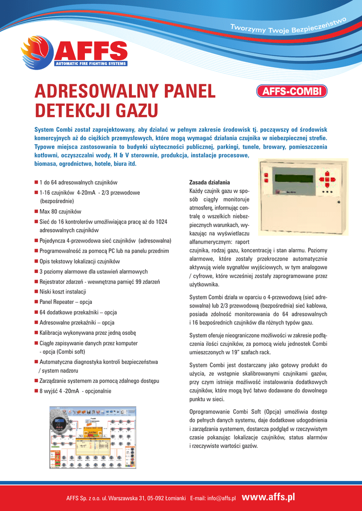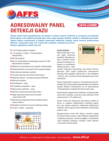 Tworzym y ze Twoje Bezpiec o ństw ADRESOWALNY PANEL DETEKCJI GAZU System Combi został zaprojektowany, aby działać w pełnym zakresie środowisk tj. począwszy od środowisk komercyjnych aż do ciężkich przemysłowych, które mogą wymagać działania czujnika w niebezpiecznej strefie. Typowe miejsca zastosowania to budynki użyteczności publicznej, parkingi, tunele, browary, pomieszczenia kotłowni, oczyszczalni wody, H & V sterownie, produkcja, instalacje procesowe, biomasa, ogrodnictwo, hotele, biura itd. ■ ■ ■ ■ 1 do 64 adresowalnych czujników 1-16 czujników 4-20mA - 2/3 przewodowe (bezpośrednie) Max 80 czujników Sieć do 16 kontrolerów umożliwiająca pracę aż do 1024 adresowalnych czujników ■ Pojedyncza 4-przewodowa sieć czujników (adresowalna) ■ Programowalność za pomocą PC lub na panelu przednim ■ Opis tekstowy lokalizacji czujników ■ 3 poziomy alarmowe dla ustawień alarmowych ■ Rejestrator zdarzeń - wewnętrzna pamięć 99 zdarzeń ■ Niski koszt instalacji ■ Panel Repeater – opcja ■ 64 dodatkowe przekaźniki – opcja ■ Adresowalne przekaźniki – opcja ■ Kalibracja wykonywana przez jedną osobę ■ ■ Ciągłe zapisywanie danych przez komputer - opcja (Combi soft) Automatyczna diagnostyka kontroli bezpieczeństwa / system nadzoru ■ Zarządzanie systemem za pomocą zdalnego dostępu ■ 8 wyjść 4 -20mA - opcjonalnie Zasada działania Każdy czujnik gazu w sposób ciągły monitoruje atmosferę, informując centralę o wszelkich niebezpiecznych warunkach, wykazując na wyświetlaczu alfanumerycznym: raport czujnika, rodzaj gazu, koncentrację i stan alarmu. Poziomy alarmowe, które zostały przekroczone automatycznie aktywują wiele sygnałów wyjściowych, w tym analogowe / cyfrowe, które wcześniej zostały zaprogramowane przez użytkownika. System Combi działa w oparciu o 4-przewodową (sieć adresowalna) lub 2/3 przewodową (bezpośrednia) sieć kablowa, posiada zdolność monitorowania do 64 adresowalnych i 16 bezpośrednich czujników dla różnych typów gazu. System oferuje nieograniczone możliwości w zakresie podłączenia ilości czujników, za pomocą wielu jednostek Combi umieszczonych w 19” szafach rack. System Combi jest dostarczany jako gotowy produkt do użycia, ze wstępnie skalibrowanymi czujnikami gazów, przy czym istnieje możliwość instalowania dodatkowych czujników, które mogą być łatwo dodawane do dowolnego punktu w sieci. Oprogramowanie Combi Soft (Opcja) umożliwia dostęp do pełnych danych systemu, daje dodatkowe udogodnienia i zarządzania systemem, dostarcza podgląd w rzeczywistym czasie pokazując lokalizacje czujników, status alarmów i rzeczywiste wartości gazów. AFFS Sp. z o.o. ul. Warszawska 31, 05-092 Łomianki E-mail: [email protected] www.affs.pl DANE TECHNICZNE Ilości detektorów ■ 1- 64 detektorów adresowalnych - CAN bus i / lub ■ 16 detektorów bezpośrednich 4-20mA Combi Plus - 128 adresowalnych ■ Gazy palne L.E.L.,% vol Toksyczne gaz ppm,% obj Czynnik chłodniczy ppm ■ Pomiar ■ ■ Wskaźniki jednostki sterującej ■ ■ Wyjścia ■ ■ ■ ■ ■ ■ ■ Wyświetlacz alfanumeryczny LCD 4- wiersze po 40 znaków – wskazuje okalizację czujnika, typ gazu, stężenie (wzrost lub spadek wartości alarmów), stan alarmu, awarię systemu, awarię linii czujnika, awarię czujnika, blokadę, zegar czasu rzeczywistego, pamięć zdarzeń. LED czerwona – alarm ogólny, LED żółta – uszkodzenie ogólne, LED żółta - blokada. przekaźników programowalnych z opcją normalnie pod napięciem lub normalnie bez napięcia oraz z opóźnieniem odłączania - styki przekaźnika - 2 D.P.C.O / 6 S.P.C.O. ; obciążalność 5A @ 230VAC. Ustawienie fabryczne: • 1 ogólny alarm niskiego stężenia D.P.C.O. lub grupa 1 • 1 ogolny alarm wysokiego stężenia D.P.C.O lub grupa 2 • 1 przekroczenie zakresu (overrange) S.P.C.O lub grupa 3 • 1 uszkodzenie S.P.C.O lub grupa 4 • 4 ustawialne przez użytkownika S.P.C.O grupy od 5 do 8 Przekaźnik alarmu ogólnego - resetowalny S.P.C.O. - do sygnalizatorów itp. Opcjonalnie - 2 x 32 przekaźniki - pierwszych 16 programowalnych z opcją normalnie pod napięciem lub normalnie bez napięcia oraz z opóźnieniem odłączania - 48 przekaźników - pojedyncze zdarzenia Opcjonalnie - zdalnie adresowany moduł 4 przekaźnikowy RS232 - protokół danych Modbus - RS485 x2 Combi Soft - narzędzie do zarządza i pełnego dostępu danych - opcja. Alarm dźwiękowy ■ Alarm / Błąd - z opcją stałego wyciszenia Zasilanie ■ 230/115VAC lub 24V DC 7.5W w czasie dozoru 17W w czasie alarmu Czujnik: 1.25W Wbudowany zasilacz • max 20 czujniki • dla liczby czujników >20 - wymagany dodatkowy zasilacz 11A/24VDC ■ ■ ■ Przewody czujników adresowalnych, bezpośrednich ■ ■ ■ ■ Inne ■ ■ ■ ■ ■ ■ ■ Środowisko pracy ■ Wymiary ■ ■ ■ ■ ■ Główna sieć - 4 przewodowa (2 zasilające, 2 Komunikacja) [1,5mm2 – max długość 1 km] 2/3 przewodowa linia bezpośrednia [1,5mm2 – max długość 1 km] Opcjonalny wzmacniacz sygnału na dodatkowy 1 kilometr Wejście kablowe do obudowy - z dołu, z tyłu, z góry Zdalny: RESET / WYCISZENIE Panel przedni – zamykany na kluczyk Panel wynośny Konwerter 16 torów 4- 20mA Wskaźnik LED - Komunikacja uszkodzenie, Modbus uszkodzenie, MPU uszkodzenie Ochrona hasłem - tryb użytkownik / inżynier LCD i LED przyciemniane Panel - IP52 Opcja obudowy - IP65 Temperatura pracy: 5/40˚C 315W x 265H x 95D – Panel Combi 315W x 265H x 95D - Dodatkowy zasilacz Waga 4,95 kg Panel przekaźników 2x32 Moduł przekaźnikowy Start panel 3-przewodowy bezpośrednio 4-przewodowy adresowalny Strefa niebezpieczna 8 kanałowy moduł 4-20 mA Detektory dla strefy bezpiecznej Detektory dla strefy niebezpiecznej