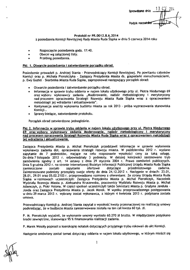 Sprawdzono dnia 13 C: E 2(114 I Podpis noczeln .911", Protokół nr PR.0012.8.6.2014 z posiedzenia Komisji Rewizyjnej Rady Miasta Ruda Śląska w dniu 5 czerwca 2014 roku • • • Rozpoczęcie posiedzenia godz. 17:40. Obecni wg za łączonej listy. Przebieg posiedzenia. Pkt 1. Otwarcie posiedzenia i zatwierdzenie porz ądku obrad. Posiedzenie prowadzi ł p. Andrzej Stania - Przewodnicz ący Komisji Rewizyjnej. Po powitaniu członków Komisji oraz p. Micha ła Pierończyka - Zastępcy Prezydenta Miasta ds. gospodarki nieruchomo ściami, p. Ewy Guziel - Skarbnika Miasta Ruda Śląska, zaproponowa ł następuj ący porządek obrad: • • • • Otwarcie posiedzenia i zatwierdzenie porz ądku obrad. Informacja w sprawie trybu oddania w najem lokalu u żytkowego przy ul. Piotra Niedurnego 69 oraz wyboru wykonawcy zadania „Moderowanie, nadzór metodologiczny i merytoryczny nad procesem opracowania Strategii Rozwoju Miasta Ruda Śląska wraz z opracowaniem metodologii jej wdrażania i aktualizowania". Kontynuacja analizy wykonania bud żetu miasta za rok 2013 - próba wypracowania stanowiska Komisji.. Sprawy bieżące, zatwierdzenie protoko łu. Porządek obrad zatwierdzono jednog łośnie. Pkt 2. Informacja w sprawie trybu oddania w najem lokalu u żytkowego przy ul. Piotra Niedurnego 69 oraz wyboru wykonawcy zadania Moderowanie, nadzór metodologiczny i merytoryczny nad procesem opracowania Strategii Rozwoju Miasta Ruda Śl ą ska wraz z opracowaniem metodologii jej wdrażania i aktualizowania. Zastępca Prezydenta Miasta p. Micha ł Pierończyk przedstawi ł informacje w sprawie wy łonienia wykonawcy zadania dot. opracowania strategii rozwoju miasta. W pa ździerniku 2012 r. wystano zapytanie do 7 podmiotów, maj ące na celu rozpoznanie wysoko ści ceny za tak ą usługę. Do dnia 7 listopada 2012 r. odpowiedziały 3 podmioty. W dalszej kolejno ści zastosowano tryb zamówienia zgodny z art. 14 ustawy z dnia 29 stycznia 2004 r. Prawo zamówie ń publicznych. Dnia 5 grudnia 2012 r. na stronie internetowej Biuletyn Informacji Publicznej Urz ędu Miasta Ruda Śląska zamieszczone zosta ło zapytanie ofertowe dotycz ące przedmiotowego zadania. Zainteresowane podmioty przesy łały swoje oferty do dnia 24.12.2012 r. Nast ępnie w dniach: 23.01, 28.01, 29.01 oraz 05.02.2103 r. przeprowadzono rozmowy z oferentami. Ze strony Urz ędu Miasta Ruda Ś ląska w rozmowach uczestniczyli: Zast ępca Prezydenta Miasta p. Micha ł Pierończyk, Naczelnik Wydział u Rozwoju Miasta p. Aleksandra Kruszewska, pracownicy Wydzia łu Rozwoju Miasta p. Micha ł Adamczyk, p. Piotr Holona. W cz ęści spotka ń uczestniczyli tak że Sekretarz Miasta p. Gra żyna Jandu ła Jonda oraz Zast ępca Prezydenta Miasta p. Jacek Morek. W wyniku przeprowadzonego post ępowania w dniu 29 marca 2013 r. wybrany zosta ł wykonawca, z którym 4 kwietnia 2013 r. podpisana zosta ła umowa. Przewodniczący Komisji p. Andrzej Stania zapyta ł o wysokość kwoty przeznaczonej na realizacj ę umowy podkreślaj ąc, że w budżecie Miasta zarezerwowana zosta ła na ten cel kwota 60 tys. z ł . P. M. Pierończyk wyjaśni ł , że wykonanie umowy wynios ło 60.270 zł brutto. W mi ędzyczasie pozyskano środki zewn ętrzne, stanowi ące 95 % finansowania realizacji zadania. P. Marek Wesoły poprosi ł o kserokopi ę notatek dotycz ących przyj ętego trybu rokowa ń do akt Komisji. Nast ępnie omówiony zosta ł temat dotycz ący oddania w najem lokalu u żytkowego, w którym mieścił si ę pub Druid. P. M. Piero ńczyk poinformowa ł , że na dzień 21.02.2014 r. zad łużenie firmy - poprzedniego najemcy lokalu w budynku Miejskiego Centrum Kultury wzgl ędem Miasta wynosi ło 30.456,28 zł Po dokonaniu wypowiedzenia umowy oraz opuszczeniu lokalu, wp łynęły 3 oferty dotycz ące jego wynajmu w trybie bezprzetargowym na okres trzech lat. Oferty z łożyły następuj ące podmioty: ART. IN S,C. Krzysztof Kasprzyk, Tomasz Bartniczak, Marzena i Marek Labudzi ńscy oraz Mini-Browar i Restauracja Spi ż z Wrocławia. Po przeprowadzeniu post ępowania wyjaśniaj ącego oraz szczegó łowym przeanalizowaniu propozycji zawartych w ofertach, zostata podj ęta decyzja o przydzieleniu lokalu użytkowego przy ul. Piotra Niedurnego 69 na rzecz ART. IN S.C. Krzysztof Kasprzyk, Tomasz Bartniczak. Zaproponowany przez Spó łkę program obejmuje swoim zakresem dzia łalność kulturaln ą i społeczną, gwarantuje wykorzystanie potencja ł u, jaki drzemie w tym miejscu oraz zachowanie klimatu z nim zwi ązanego. Ponadto Spółka, jako jedyna, przedłożyła referencje przysz łego szefa kuchni. Dokonano analizy średnich stawek czynszu najmu w Mie ście, w tym w rozbiciu na bran że i poszczególne Rejony Eksploatacji Budynków Miejskiego Przedsi ębiorstwa Gospodarki Mieszkaniowej Sp. z o.o. Średnia stawka czynszu netto dla lokali u żytkowych dla Miasta w I kwartale 2014 roku wynios ła 9,62 zł /m2, dla bran ży gastronomicznej natomiast 7,04 zł /m2, dla dzielnicy Nowy Bytom średnia stawka wyniosła 10,03 zł /m2. Zaproponowana stawka czynszu w wysoko ści 12,88 zt/m2 netto oceniona zosta ła jako stawka rynkowa. W trybie par. 2 ust. 5 uchwa ły Rady Miasta Ruda Śląska z dnia 13.05.2010 roku dokonano wyboru Spółki ART. IN S.C., ze wzgl ędu na to, i ż jej doświadczenie daje r ękojmi ę należytej i wszechstronnej współpracy z Miejskim Centrum Kultury im. H. Bisty. P. B. Wystyrk - Benigier zapyta ła o wysokość stawki czynszu, jak ą zobowi ązany był płaci ć poprzedni najemca oraz o mo żliwość odzyskania należności od poprzedniego najemcy. Zapytata tak że, czy w umowie z obecnym najemc ą znajduje si ę zapis zabezpieczaj ący Miasto przed powtórzeniem si ę sytuacji, jaka miała miejsce z poprzednim najemc ą. P. M. Pierończyk poinformowat, że stawka czynszu by ła taka sama, jak zastosowana obecnie. W kwestii odzyskania nale żności wyjaśnił , że trwa obecnie post ępowanie komornicze. P. M. Piero ńczyk wyjaś