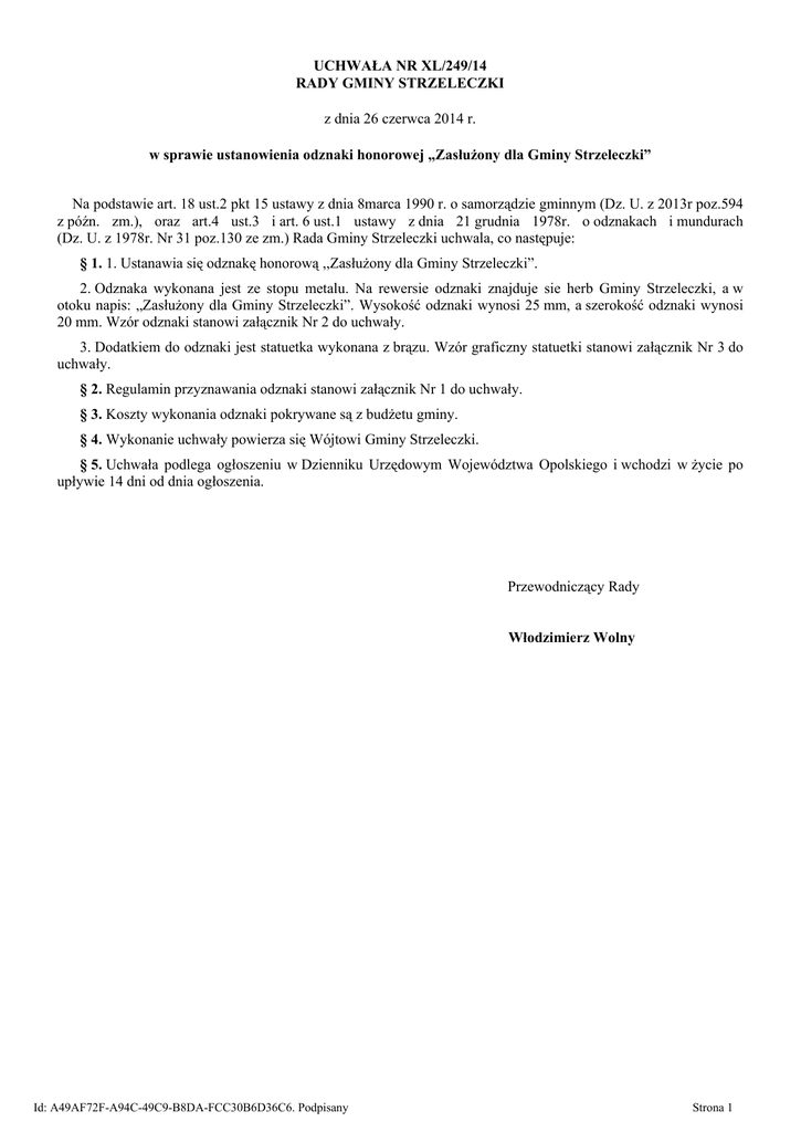 UCHWAŁA NR XL/249/14 RADY GMINY STRZELECZKI z dnia 26 czerwca 2014 r. w sprawie ustanowienia odznaki honorowej „Zasłużony dla Gminy Strzeleczki” Na podstawie art. 18 ust.2 pkt 15 ustawy z dnia 8marca 1990 r. o samorządzie gminnym (Dz. U. z 2013r poz.594 z późn. zm.), oraz art.4 ust.3 i art. 6 ust.1 ustawy z dnia 21 grudnia 1978r. o odznakach i mundurach (Dz. U. z 1978r. Nr 31 poz.130 ze zm.) Rada Gminy Strzeleczki uchwala, co następuje: § 1. 1. Ustanawia się odznakę honorową ,,Zasłużony dla Gminy Strzeleczki”. 2. Odznaka wykonana jest ze stopu metalu. Na rewersie odznaki znajduje sie herb Gminy Strzeleczki, a w otoku napis: „Zasłużony dla Gminy Strzeleczki”. Wysokość odznaki wynosi 25 mm, a szerokość odznaki wynosi 20 mm. Wzór odznaki stanowi załącznik Nr 2 do uchwały. 3. Dodatkiem do odznaki jest statuetka wykonana z brązu. Wzór graficzny statuetki stanowi załącznik Nr 3 do uchwały. § 2. Regulamin przyznawania odznaki stanowi załącznik Nr 1 do uchwały. § 3. Koszty wykonania odznaki pokrywane są z budżetu gminy. § 4. Wykonanie uchwały powierza się Wójtowi Gminy Strzeleczki. § 5. Uchwała podlega ogłoszeniu w Dzienniku Urzędowym Województwa Opolskiego i wchodzi w życie po upływie 14 dni od dnia ogłoszenia. Przewodniczący Rady Włodzimierz Wolny Id: A49AF72F-A94C-49C9-B8DA-FCC30B6D36C6. Podpisany Strona 1 Załącznik Nr 1 do Uchwały Nr XL/249/14 Rady Gminy Strzeleczki z dnia 26 czerwca 2014 r. Regulamin przyznawania odznaki honorowej ,,Zasłużony dla Gminy Strzeleczki” § 1. Odznaka ,,Zasłużony dla Gminy Strzeleczki” jest wyrazem wyróżnienia i uznania za szczególne zasługi i osiągnięcia w pracy zawodowej i społecznej, której przyczyniły się do rozwoju Gminy Strzeleczki i samorządności lokalnej. § 2. 1. Odznaka może być przyznana obywatelom polskim i cudzoziemcom oraz organizacjom, instytucjom i podmiotom gospodarczym. 2. Odznaka może być przyznana tej samej osobie, instytucji, organizacji, podmiotowi gospodarczemu tylko jeden raz. § 3. Odznaka będzie przyznawana w następujących w następujących kategoriach: 1) przedsiębiorczość, 2) samorządność, 3) działalność społeczna, 4) promocja i wybitne osiągnięcia i zasługi na rzecz gminy. § 4. Wniosek wraz z uzasadnieniem mogą składać organizacje społeczne, podmioty gospodarcze oraz grupa 20 mieszkańców mających czynne prawo wyborcze. § 5. Wnioski będą przyjmowane do końca października danego roku i winny być rozpatrzone w terminie jednego miesiąca. Wniosek powinien zawierać: a) dane o kandydacie, b) określenie zasług uzasadniających przyznanie odznaki, c) podpis(y) sporządzających wniosek, d) zgodę kandydata. § 6. 1. Wnioski na rok 2014 rozpatruje komisja w składzie 6 osób powołana przez Przewodniczącego Rady i Wójta Gminy - każdy z nich wskazuje po 3 osoby. 2. W latach następnych komisję tworzą laureaci poprzedniego roku i osoby wyznaczone przez Przewodniczącego Rady i Wójta Gminy - każdy z nich po 3 osoby. § 7. 1. Odznakę przyznaje Rada Gminy Strzeleczki tylko na ostatniej sesji roku kalendarzowego, w którym wnioski zostały złożone, po pozytywnym zaopiniowaniu wniosku przez komisję. 2. Odznakę wręcza Przewodniczący Rady wraz z Wójtem Gminy na sesji. § 8. Osoba zostaje pozbawiona odznaki w przypadku skazania przez sąd prawomocnym wyrokiem za przestępstwo umyślne lub umyślne przestępstwo skarbowe. § 9. Ewidencję wyróżnionych odznaką prowadzi Biuro Rady Gminy. Ewidencja jest dostępna w BIP Urzędu Gminy. Id: A49AF72F-A94C-49C9-B8DA-FCC30B6D36C6. Podpisany Strona 1 Załącznik Nr 2 do Uchwały Nr XL/249/14 Rady Gminy Strzeleczki z dnia 26 czerwca 2014 r. Wzór odznaki „Zasłużony dla Gminy Strzeleczki" Id: A49AF72F-A94C-49C9-B8DA-FCC30B6D36C6. Podpisany Strona 1 Załącznik Nr 3 do Uchwały Nr XL/249/14 Rady Gminy Strzeleczki z dnia 26 czerwca 2014 r. Wzór graficzny statuetki Id: A49AF72F-A94C-49C9-B8DA-FCC30B6D36C6. Podpisany Strona 1