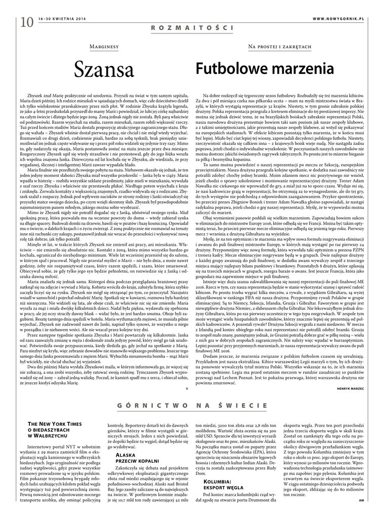 10 W W W.NOW YGORNIK.PL 16 –3 0 K W I E T N I A 2 014 R O Z M A I T O Ś C I Marginesy Szansa Zbyszek znał Marię praktycznie od urodzenia. Przyszli na świat w tym samym szpitalu, Maria dzień później. Ich rodzice mieszkali w sąsiadujących domach, więc całe dzieciństwo dzielił ich tylko wielokrotnie przeskakiwany przez nich płot. W rodzinie Zbyszka krążyła legenda, że jako 4-letni przedszkolak przyszedł do mamy Marii i powiedział, że lubi jej córkę najbardziej na całym świecie i dlatego będzie jego żoną. Żoną jednak nigdy nie została. Byli parą właściwie od podstawówki. Razem wyjechali na studia, razem mieszkali, razem robili większość rzeczy. Tuż przed końcem studiów Maria dostała propozycję atrakcyjnego zagranicznego stażu. Długo się wahała – Zbyszek właśnie dostał pierwszą pracę, nie chciał i nie mógł wtedy wyjechać. Rozmawiali co drugi dzień, codziennie pisali, bardzo za sobą tęsknili, brak pieniędzy uniemożliwiał im jednak częste widywanie się i przez pół roku widzieli się jedynie trzy razy. Mimo to, gdy nadarzyła się okazja, Maria postanowiła zostać na stażu jeszcze przez dwa miesiące. Rozgoryczony Zbyszek upił się wtedy straszliwie i nie protestował, gdy do jego łóżka weszła ich wspólna znajoma Janka. Dziewczyna od lat kochała się w Zbyszku, ale wiedziała, że przy wygadanej, ślicznej i inteligentnej Marii zawsze wypadała blado. Maria finalnie nie przedłużyła swojego pobytu na stażu. Niebawem okazało się jednak, że ten jeden jedyny moment słabości Zbyszka miał wszystko przekreślić – Janka była w ciąży. Maria wpadła w histerię – rozbiła wszystkie szklane przedmioty, jakie mieli w mieszkaniu, wywalała z szaf rzeczy Zbyszka i właściwie nie przestawała płakać. Niedługo potem wyjechała z kraju i zniknęła. Zerwała kontakty z większością znajomych, rzadko widywała się z rodzicami. Zbyszek szalał z rozpaczy. Jednak pod wpływem nacisków ze strony rodziny i Janki oświadczył się przyszłej matce swojego dziecka, po czym wzięli skromny ślub. Zbyszek był prawdopodobnie najsmutniejszym panem młodym, jakiego można sobie wyobrazić. Mimo że Zbyszek nigdy nie potrafił dogadać się z Janką, ubóstwiał swojego synka. Miał spokojną pracę, która pozwalała mu na wczesne powroty do domu – wtedy zabierał synka na długie spacery. Budowali domki na drzewie, bawili się w piratów i bazę kosmiczną. Opowiadał mu o świecie, o dalekich krajach i o życiu zwierząt. Z żoną praktycznie nie rozmawiał na tematy inne niż rachunki czy zakupy, postanowił jednak nie wracać do przeszłości i wykonywać nową rolę tak dobrze, jak tylko potrafił. Minęło 16 lat, w trakcie których Zbyszek nie zmienił ani pracy, ani mieszkania. Właściwie – nie zmieniło się absolutnie nic. Kontakt z żoną, która mimo wszystko bardzo go kochała, ograniczał do niezbędnego minimum. Wiele lat wcześniej przeniósł się do salonu, w którym spał i pracował. Nigdy nie przestał myśleć o Marii – nie było dnia, a może nawet godziny, żeby nie rozpamiętywał czasu, który razem spędzili, i szans, które zmarnował. Obiecywał sobie, że gdy tylko jego syn będzie pełnoletni, on rozwiedzie się z Janką i odszuka dawną miłość. Maria znalazła się jednak sama. Któregoś dnia podczas przeglądania branżowej prasy natknął się na zdjęcie i wywiad z Marią. Kobieta wróciła do kraju, założyła firmę, która szybko zaczęła liczyć się na rynku. Zbyszek nie mógł się otrząsnąć po tym, co przeczytał. Nazajutrz wsiadł w samochód i pojechał odnaleźć Marię. Spotkali się w kawiarni, rozmowa była bardziej niż niezręczna. Nie widzieli się lata, ale oboje czuli, że właściwie nic się nie zmieniło. Maria wyszła za mąż i miała dwójkę kilkuletnich dzieci. Nadal była piękna, wydawała się spełniona w pracy, ale jej oczy straciły dawny blask – widać było, że jest bardzo smutna. Oboje byli zagubieni. Resztę tamtego dnia spędzili w hotelu. Maria wytłumaczyła mężowi, że musiała pilnie wyjechać, Zbyszek nie zadzwonił nawet do Janki, napisał tylko synowi, że wszystko u niego w porządku i że niebawem wróci. Ale nie wracał przez kolejne trzy dni. Przez następne tygodnie spotkania Zbyszka i Marii powtarzały się kilkakrotnie. Janka od razu zauważyła zmianę u męża i doskonale znała jedyny powód, który mógł go tak uradować. Potwierdziła swoje przypuszczenia, kiedy śledziła go, gdy jechał na spotkanie z Marią. Para niezbyt się kryła, więc zebranie dowodów nie stanowiło większego problemu. Jeszcze tego samego dnia Janka porozmawiała z mężem Marii. Wybuchła niesamowita bomba – mąż Marii był wściekły, nie chciał słuchać jej wyjaśnień. Dwa dni później Maria wysłała Zbyszkowi maila, w którym informowała go, że więcej się nie zobaczą, a ona zrobi wszystko, żeby ratować swoją rodzinę. Tymczasem Zbyszek wyprowadził się od żony – zabrał jedną walizkę. Poczuł, że kamień spadł mu z serca, i obiecał sobie, że jeszcze kiedyś odzyska Marię. l G Ó R N I C T W O T he N ew Y ork T imes o biedaszybach w W ałbrzychu Internetowy portal NYT w sobotnim wydaniu z 29 marca zamieścił film o eksploatacji węgla kamiennego w wałbrzyskich biedaszybach. Jego oryginalność nie podlega żadnej wątpliwości, gdyż prawie wszystkie rozmowy prowadzone są w języku polskim. Film pokazuje trzyosobową brygadę młodych ludzi urabiających kilofem pokład węgla występujący tuż pod powierzchnią ziemi. Pewną nowością jest odnotowanie nocnego transportu urobku, aby ominąć policyjną kontrolę. Reporterzy dotarli też do dawnych górników, którzy w filmie wystąpili w górniczych strojach. Jeden z nich powiedział, że dopóki będzie tu węgiel, dotąd będzie się go wydobywać. A laska przeciw kopalni Zakończyła się debata nad projektem odkrywkowej eksploatacji gigantyczn