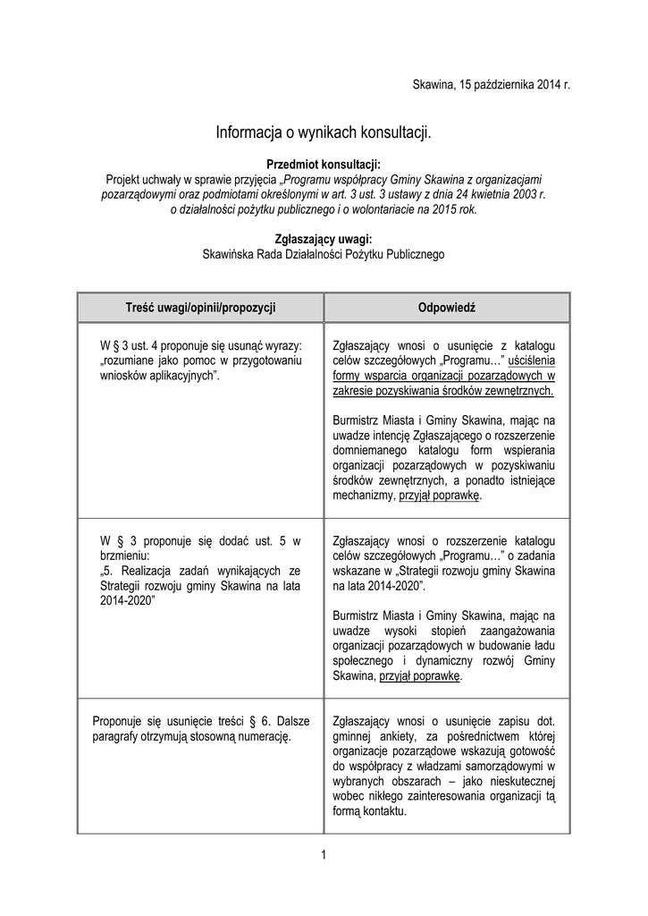Skawina, 15 października 2014 r. Informacja o wynikach konsultacji. Przedmiot konsultacji: Projekt uchwały w sprawie przyjęcia „Programu współpracy Gminy Skawina z organizacjami pozarządowymi oraz podmiotami określonymi w art. 3 ust. 3 ustawy z dnia 24 kwietnia 2003 r. o działalności pożytku publicznego i o wolontariacie na 2015 rok. Zgłaszający uwagi: Skawińska Rada Działalności Pożytku Publicznego Treść uwagi/opinii/propozycji Odpowiedź W § 3 ust. 4 proponuje się usunąć wyrazy: „rozumiane jako pomoc w przygotowaniu wniosków aplikacyjnych”. Zgłaszający wnosi o usunięcie z katalogu celów szczegółowych „Programu…” uściślenia formy wsparcia organizacji pozarządowych w zakresie pozyskiwania środków zewnętrznych. Burmistrz Miasta i Gminy Skawina, mając na uwadze intencję Zgłaszającego o rozszerzenie domniemanego katalogu form wspierania organizacji pozarządowych w pozyskiwaniu środków zewnętrznych, a ponadto istniejące mechanizmy, przyjął poprawkę. W § 3 proponuje się dodać ust. 5 w brzmieniu: „5. Realizacja zadań wynikających ze Strategii rozwoju gminy Skawina na lata 2014-2020” Zgłaszający wnosi o rozszerzenie katalogu celów szczegółowych „Programu…” o zadania wskazane w „Strategii rozwoju gminy Skawina na lata 2014-2020”. Burmistrz Miasta i Gminy Skawina, mając na uwadze wysoki stopień zaangażowania organizacji pozarządowych w budowanie ładu społecznego i dynamiczny rozwój Gminy Skawina, przyjął poprawkę. Proponuje się usunięcie treści § 6. Dalsze paragrafy otrzymują stosowną numerację. Zgłaszający wnosi o usunięcie zapisu dot. gminnej ankiety, za pośrednictwem której organizacje pozarządowe wskazują gotowość do współpracy z władzami samorządowymi w wybranych obszarach – jako nieskutecznej wobec nikłego zainteresowania organizacji tą formą kontaktu. 1 Burmistrz Miasta i Gminy Skawina przyjął poprawkę. W załączniku nr 2, stanowiącym „Regulamin przyznawania dotacji” proponuje się zmianę treści pkt. II.2.2) na: Burmistrz Miasta i Gminy Skawina przyjął poprawkę. ocena merytoryczna - zostanie przeprowadzona na podstawie kryteriów wypracowanych w wyniku konsultacji ze Skawińską Radą Działalności Pożytku Publicznego i organizacjami pozarządowymi; kryteria te zostaną określone w Zarządzeniach Burmistrza Miasta i Gminy Skawina dotyczących ogłaszanych konkursów. 2