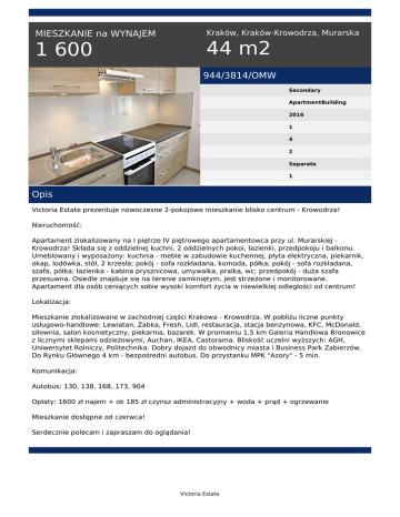 Kraków, Kraków-Krowodrza, Murarska MIESZKANIE na WYNAJEM 44 m2 1 600 944/3814/OMW Secondary ApartmentBuilding 2016 1 4 2 Separate 1 Opis Victoria Estate prezentuje nowoczesne 2-pokojowe mieszkanie blisko centrum - Krowodrza! Nieruchomość: Apartament zlokalizowany na I piętrze IV piętrowego apartamentowca przy ul. Murarskiej Krowodrza! Składa się z oddzielnej kuchni, 2 oddzielnych pokoi, łazienki, przedpokoju i balkonu. Umeblowany i wyposażony: kuchnia - meble w zabudowie kuchennej, płyta elektryczna, piekarnik, okap, lodówka, stół, 2 krzesła; pokój - sofa rozkładana, komoda, półka; pokój - sofa rozkładana, szafa, półka; łazienka - kabina prysznicowa, umywalka, pralka, wc; przedpokój - duża szafa przesuwna. Osiedle znajduje się na terenie zamkniętym, jest strzeżone i monitorowane. Apartament dla osób ceniących sobie wysoki komfort życia w niewielkiej odległości od centrum! Lokalizacja: Mieszkanie zlokalizowane w zachodniej części Krakowa - Krowodrza. W pobliżu liczne punkty usługowo-handlowe: Lewiatan, Żabka, Fresh, Lidl, restauracja, stacja benzynowa, KFC, McDonald, siłownia, salon kosmetyczny, piekarnia, bazarek. W promieniu 1,5 km Galeria Handlowa Bronowice z licznymi sklepami odzieżowymi, Auchan, IKEA, Castorama. Bliskość uczelni wyższych: AGH, Uniwersytet Rolniczy, Politechnika. Dobry dojazd do obwodnicy miasta i Business Park Zabierzów. Do Rynku Głównego 4 km - bezpośredni autobus. Do przystanku MPK "Azory" - 5 min. Komunikacja: Autobus: 130, 138, 168, 173, 904 Opłaty: 1600 zł najem + ok 185 zł czynsz administracyjny + woda + prąd + ogrzewanie Mieszkanie dostępne od czerwca! Serdecznie polecam i zapraszam do oglądania! Victoria Estate Małgorzata Wicha tel. +48 511 560 721 email: [email protected] Victoria Estate Powered by TCPDF (www.tcpdf.org)