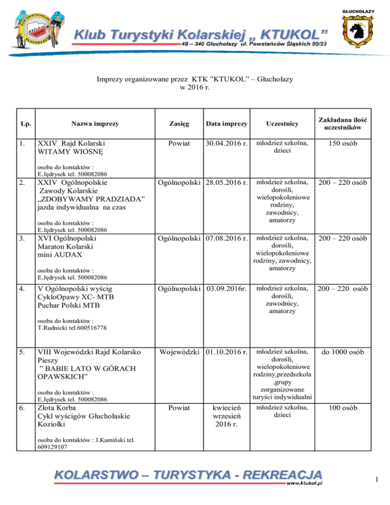 Imprezy organizowane przez KTK ”KTUKOL” – Głuchołazy w 2016 r. Lp. 1. Nazwa imprezy XXIV Rajd Kolarski WITAMY WIOSNĘ Zakładana ilość uczestników Zasięg Data imprezy Uczestnicy Powiat 30.04.2016 r. młodzież szkolna, dzieci 150 osób Ogólnopolski 28.05.2016 r. młodzież szkolna, dorośli, wielopokoleniowe rodziny, zawodnicy, amatorzy 200 – 220 osób osoba do kontaktów : E.Jędrysek tel. 500082086 2. XXIV Ogólnopolskie Zawody Kolarskie „ZDOBYWAMY PRADZIADA” jazda indywidualna na czas osoba do kontaktów : E.Jędrysek tel. 500082086 3. XVI Ogólnopolski Maraton Kolarski mini AUDAX Ogólnopolski 07.08.2016 r. osoba do kontaktów : E.Jędrysek tel. 500082086 4. V Ogólnopolski wyścig CykloOpawy XC- MTB Puchar Polski MTB młodzież szkolna, 200 – 220 osób dorośli, wielopokoleniowe rodziny, zawodnicy, amatorzy Ogólnopolski 03.09.2016r. młodzież szkolna, dorośli, zawodnicy, amatorzy 200 – 220 osób Wojewódzki 01.10.2016 r. młodzież szkolna, dorośli, wielopokoleniowe rodziny,przedszkola ,grupy zorganizowane turyści indywidualni do 1000 osób młodzież szkolna, dzieci 100 osób osoba do kontaktów : T.Rudnicki tel.600516778 5. VIII Wojewódzki Rajd Kolarsko Pieszy ” BABIE LATO W GÓRACH OPAWSKICH” osoba do kontaktów : E.Jędrysek tel. 500082086 6. Złota Korba Cykl wyścigów Głuchołaskie Koziołki Powiat kwiecień wrzesień 2016 r. osoba do kontaktów : J.Kamiński tel. 609129107 1 Pragniemy zaznaczyć, że wymienione imprezy kolarskie i turystyczne przyciągają z roku na rok coraz większą ilość uczestników, co stanowi wspaniałą promocję regionu – powiatu nyskiego. Celem naszej działalności poprzez organizację w/w imprez, jest popularyzacja turystyki rowerowej i kolarstwa, jako formy aktywnego wypoczynku, propagowanie roweru jako pojazdu ekologicznego, poznawanie oznakowanych szlaków rowerowych regionu, poznawanie walorów krajoznawczych, historii oraz zabytków Gminy Głuchołazy oraz Powiatu Nyskiego, integracja i umacnianie więzi między turystami, zainteresowanie różnych środowisk kolarstwem i turystyką rowerową. Promocja walorów przyrodniczych jako potencjału dla rozwoju turystyki, oraz podnoszenie rangi regionu poprzez budowanie wizerunku gminy i powiatu, kładącej nacisk na rozwój sportu, zdrowego trybu życia, aktywnego wypoczynku i rekreacji, dzieci, młodzieży szkolnej, dorosłych oraz wielopokoleniowych rodzin, to cele, które od wielu lat realizujemy. Wielkie zaangażowanie i oddana praca wolontariuszy klubu oraz masowy udział turystów i zawodników biorących udział imprezach organizowanych w 2015 r. i latach poprzednich, potwierdzają, że mieszkańcy Powiatu Nyskiego, bardzo chętnie chcą i uczestniczą w imprezach tego typu. Cieszy nas bardzo ,że tak wiele organizacji , stowarzyszeń i instytucji publicznych ,wspiera naszą wspólną inicjatywę. Wielokrotnie to sami uczniowie głuchołaskich szkół, sponsorzy lub przedstawiciele stowarzyszeń, proponują i układają scenariusz pewnych etapów całego zadania, co pokazuje że imprezę można kształtować wspólnie, a każdy zaangażowany w jej przeprowadzenie, powinien czuć się współorganizatorem. Dobrym przykładem jest Rajd Kolarsko – Pieszy „Babie Lato w Górach Opawskich”, podczas którego na pikniku turystycznym w ośrodku Banderoza, wspaniale i aktywnie w 2015 r. bawiło się blisko 1000 osób. Z poważaniem : 2