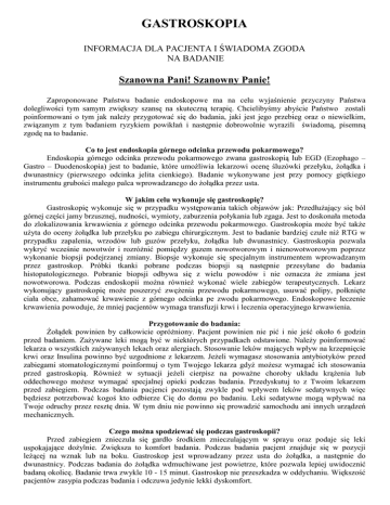 GASTROSKOPIA INFORMACJA DLA PACJENTA I ŚWIADOMA ZGODA NA BADANIE Szanowna Pani! Szanowny Panie! Zaproponowane Państwu badanie endoskopowe ma na celu wyjaśnienie przyczyny Państwa dolegliwości tym samym zwiększy szansę na skuteczną terapię. Chcielibyśmy abyście Państwo zostali poinformowani o tym jak należy przygotować się do badania, jaki jest jego przebieg oraz o niewielkim, związanym z tym badaniem ryzykiem powikłań i następnie dobrowolnie wyrazili świadomą, pisemną zgodę na to badanie. Co to jest endoskopia górnego odcinka przewodu pokarmowego? Endoskopia górnego odcinka przewodu pokarmowego zwana gastroskopią lub EGD (Ezophago – Gastro – Duodenoskopia) jest to badanie, które umożliwia lekarzowi ocenę śluzówki przełyku, żołądka i dwunastnicy (pierwszego odcinka jelita cienkiego). Badanie wykonywane jest przy pomocy giętkiego instrumentu grubości małego palca wprowadzanego do żołądka przez usta. W jakim celu wykonuje się gastroskopię? Gastroskopię wykonuje się w przypadku występowania takich objawów jak: Przedłużający się ból górnej części jamy brzusznej, nudności, wymioty, zaburzenia połykania lub zgaga. Jest to doskonała metoda do zlokalizowania krwawienia z górnego odcinka przewodu pokarmowego. Gastroskopia może być także użyta do oceny żołądka lub przełyku po zabiegu chirurgicznym. Jest to badanie bardziej czułe niż RTG w przypadku zapalenia, wrzodów lub guzów przełyku, żołądka lub dwunastnicy. Gastroskopia pozwala wykryć wcześnie nowotwór i rozróżnić pomiędzy guzem nowotworowym i nienowotworowym poprzez wykonanie biopsji podejrzanej zmiany. Biopsje wykonuje się specjalnym instrumentem wprowadzanym przez gastroskop. Próbki tkanki pobrane podczas biopsji są następnie przesyłane do badania histopatologicznego. Pobranie biopsji odbywa się z wielu powodów i nie oznacza że zmiana jest nowotworowa. Podczas endoskopii można również wykonać wiele zabiegów terapeutycznych. Lekarz wykonujący gastroskopię może poszerzyć zwężenia przewodu pokarmowego, usuwać polipy, połknięte ciała obce, zahamować krwawienie z górnego odcinka pe zwodu pokarmowego. Endoskopowe leczenie krwawienia powoduje, że mniej pacjentów wymaga transfuzji krwi i leczenia operacyjnego krwawienia. Przygotowanie do badania: Żołądek powinien by całkowicie opróżniony. Pacjent powinien nie pić i nie jeść około 6 godzin przed badaniem. Zażywane leki mogą być w niektórych przypadkach odstawione. Należy poinformować lekarza o wszystkich zażywanych lekach oraz alergiach. Stosowanie leków mających wpływ na krzepnięcie krwi oraz Insulina powinno być uzgodnione z lekarzem. Jeżeli wymagasz stosowania antybiotyków przed zabiegami stomatologicznymi poinformuj o tym Twojego lekarza gdyż możesz wymagać ich stosowania przed gastroskopią. Również w sytuacji jeżeli cierpisz na poważne choroby układu krążenia lub oddechowego możesz wymagać specjalnej opieki podczas badania. Przedyskutuj to z Twoim lekarzem przed zabiegiem. Podczas badania pacjenci pozostają zwykle pod wpływem leków sedatywnych więc będziesz potrzebować kogoś kto odbierze Cię do domu po badaniu. Leki sedatywne mogą wpływać na Twoje odruchy przez resztę dnia. W tym dniu nie powinno się prowadzić samochodu ani innych urządzeń mechanicznych. Czego można spodziewać się podczas gastroskopii? Przed zabiegiem znieczula się gardło środkiem znieczulającym w sprayu oraz podaje się leki uspokajające dożylnie. Zwiększa to komfort badania. Podczas badania pacjent znajduje się w pozycji leżącej na wznak lub na boku. Gastroskop jest wprowadzany przez usta do żołądka, a następnie do dwunastnicy. Podczas badania do żołądka wdmuchiwane jest powietrze, które pozwala lepiej uwidocznić badaną okolicę. Badanie trwa zwykle 10 - 15 minut. Gastroskop nie przeszkadza w oddychaniu. Większość pacjentów zasypia podczas badania i odczuwa jedynie lekki dyskomfort. Czego można oczekiwać po badaniu? W przypadku badania w sedacji pacjent pozostaje pod obserwacją przez 1 – 2 godziny do momentu ustąpienia działania leków sedatywnych. Pacjent może odczuwać niewielki ból gardła przez kilka dni po badaniu. Bezpośrednio po badaniu możesz odczuwać wzdęcie, które szybko ustępuje. Jest to spowodowane powietrzem wdmuchiwanym do żołądka podczas badania. Po opuszczeniu szpitala/gabinetu możesz powrócić do normalnej diety i możesz spożyć Twoje regularne lekarstwa, chyba że lekarz zleci inaczej. Również po badaniu lekarz wyjaśnia Ci wyniki badania. Jeżeli podczas badania wykonano biopsję, wyniki otrzymuje się po około trzech tygodniach, a wynik testu urazowego na Helikobacter Pylori po około ½ godzinie. Jeżeli z powodu działania leków sedatywnych lub stresu nie pamiętasz instrukcji udzielonych Ci po badaniu, skontaktuj się z Twoim lekarzem w dniu następnym. Jakie są możliwe powikłania Gastroskopia i biopsja są badaniami bezpiecznymi w rękach lekarza, który ma odpowiednie kwalifikacje. Powikłania s ą rzadkie lecz mogą wystąpić. Należą do nich: krwawienie z miejsca biopsji lub polipektomii oraz perforacja ściany przewodu pokarmowego. Transfuzje krwi są rzadko potrzebne. Powikłaniem może być również reakcja uboczna na leki uspokajające oraz infekcja w miejscu wkłucia dożylnego. Bardzo ważne jest wczesne rozpoznanie możliwych powikłań i kontakt z lekarzem jeżeli masz kłopoty z połykaniem, ból w klatce piersiowej, narastający ból gardła, ostry ból brzucha, gorączkę, dreszcze lub krwawienie z odbytu w ilości większej niż pół szklanki. Badanie w znieczuleniu ogólnym: U nas istnieje możliwość znieczulenia się do badań endoskopowych oraz wykonywanych zabiegów. Znacznie polepsza to komfort podczas badania. Większość z Państwa uważa to badanie za wstydliwe i mało intymne, dzięki znieczuleniu nie myślicie Państwo o tym, a badanie jest przeprowadzon