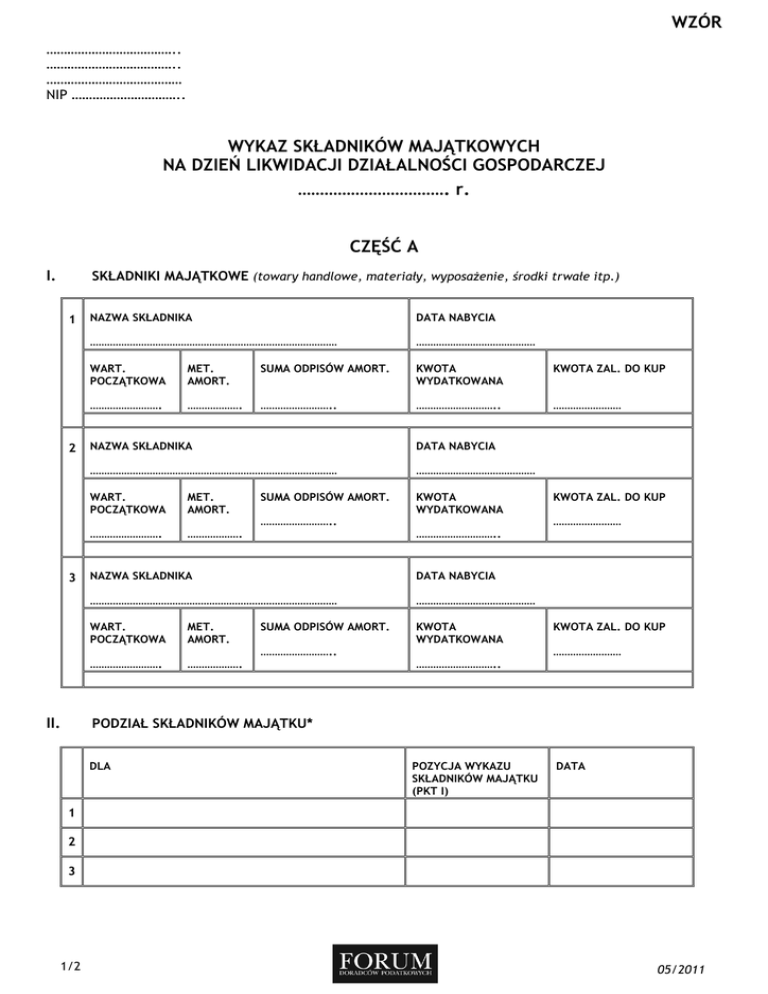 WZÓR ……………………………….. ……………………………….. ………………………………… NIP ………………………….. WYKAZ SKŁADNIKÓW MAJĄTKOWYCH NA DZIEŃ LIKWIDACJI DZIAŁALNOŚCI GOSPODARCZEJ ……………………………. r. CZĘŚĆ A I. SKŁADNIKI MAJĄTKOWE (towary handlowe, materiały, wyposaŜenie, środki trwałe itp.) 1 2 NAZWA SKŁADNIKA DATA NABYCIA …………………………………………………………………………… …………………………………… WART. POCZĄTKOWA MET. AMORT. SUMA ODPISÓW AMORT. KWOTA WYDATKOWANA KWOTA ZAL. DO KUP ……………………. ………………. …………………….. ……………………….. …………………… NAZWA SKŁADNIKA DATA NABYCIA …………………………………………………………………………… …………………………………… WART. POCZĄTKOWA MET. AMORT. KWOTA WYDATKOWANA ……………………. ………………. SUMA ODPISÓW AMORT. …………………….. 3 …………………… ……………………….. NAZWA SKŁADNIKA DATA NABYCIA …………………………………………………………………………… …………………………………… WART. POCZĄTKOWA MET. AMORT. KWOTA WYDATKOWANA ……………………. ………………. SUMA ODPISÓW AMORT. …………………….. II. KWOTA ZAL. DO KUP KWOTA ZAL. DO KUP …………………… ……………………….. PODZIAŁ SKŁADNIKÓW MAJĄTKU* DLA POZYCJA WYKAZU SKŁADNIKÓW MAJĄTKU (PKT I) DATA 1 2 3 1/2 05/2011 WZÓR III. ŚRODKI PIENIĘśNE WYPŁACONE Z TYTUŁU UDZIAŁU W SPÓŁCE OSOBOWEJ* DLA KWOTA DATA 1 2 3 Sporządził: ………………………………………………………. podpis …………………………………………….. Podpisy wspólników:* …………………………………………………………………………………………………… …………………………………………………………………………………………………… …………………………………………………………………………………………………… CZĘŚĆ B (wypełnić w przypadku późniejszego odpłatnego zbycia składnika majątkowego) 1 NAZWA SKŁADNIKA WYKAZANY W POZYCJI (CZĘŚĆ A) …………………………………………………………………………………………………………….…… ………………………….. DATA SPRZEDAśY PRZYCHÓD ZE SPRZEDAśY PODATEK NALEśNY ……………………………….. ……………………. ……………. 2 NAZWA SKŁADNIKA WYKAZANY W POZYCJI (CZĘŚĆ A) …………………………………………………………………………………………………………….…… ………………………….. DATA SPRZEDAśY PRZYCHÓD ZE SPRZEDAśY PODATEK NALEśNY ……………………………….. ……………………. ……………. 3 NAZWA SKŁADNIKA WYKAZANY W POZYCJI (CZĘŚĆ A) …………………………………………………………………………………………………………….…… ………………………….. DATA SPRZEDAśY PRZYCHÓD ZE SPRZEDAśY DATA SPRZEDAśY ……………………………….. ……………………. ……………………………….. *wypełnić w przypadku spółki osobowej 2/2 05/2011
