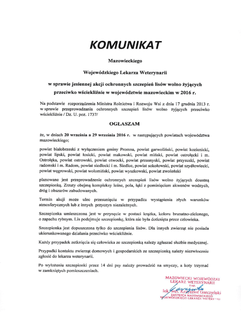 KOMUNIKAT Mazowieckiego Wojewodzkiego Lekarza Weterynarii w sprawie jesiennej akcji ochronnych szczepien lisow wolno zyj^cych przeciwko wsciekliznie w wojewodztwie mazowieckim w 2016 r. Na podstawie rozporz^dzenia Ministra Rolnictwa i Rozwoju Wsi z dnia 17 grudnia 2013 r. wsprawie przeprowadzania ochronnych szczepien lis6w wolno Zyj^cych przeciwko wsciekliznie / Dz. U. poz. 1737/ OGLASZAM ze, w dniach 20 wrzesnia a 29 wrzesnia 2016 r. w nast^puj^cych powiatach wojewddztwa mazowieckiego; powiat bialobrzeski z wyl^czeniem gminy Promna, powiat garwolinski, powiat kozienicki, powiat lipski, powiat losicki, powiat makowski, powiat minski, powiat ostrol?cki i m. Ostrol^ka, powiat ostrowski, powiat otwocki, powiat przasnyski, powiat przysuski, powiat radomski i m. Radom, powiat siedlecki i m. Siedlce, powiat sokolowski, powiat szydlowiecki, powiat w^growski, powiat wolomihski, powiat wyszkowski, powiat zwolehski planowane jest przeprowadzenie ochronnych szczepien lisow wolno zyj^cych doustn^ szczepionk^. Zrzuty obejm^ kompleksy lesne, pola, l^ki z pomini^ciem akwendw wodnych, drog i obszardw zabudowanych. Termin akcji moZe ulec przesuni^ciu w przypadku wyst^pienia zlych warunkow atmosferycznych lub z innych przyczyn niezaleZnych. Szczepionka umieszczona jest w przyn^cie w postaci kr^ka, koloru brunatno-zielonego, 0 zapachu rybnym. Lis podejmuje szczepionk?, kt6ra nie byla dotkni^a przez czlowieka. Szczepionka jest dopuszczona tyiko do szczepienia lis6w. Dla innych zwierz^t nie posiada ukierunkowanego dzialania przeciwko wsciekliznie. Kazdy przypadek zetkni?cia si? czlowieka ze szczepionka naleZy zglaszac sluzbie medycznej. Przypadki kontaktu zwierz^t domowych i gospodarskich ze szczepionka nalezy niezwlocznie zgtosic do lekarza weterynarii. Po wylozeniu szczepionki przez 14 dni psy naiezy prowadzid na smyczy, a koty trzymad w zamkni?tych pomieszczeniach. MAZOWIECK] WOJEW0D2K1 LEKAR2 WETERYNARii