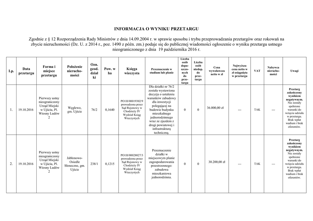 INFORMACJA O WYNIKU PRZETARGU Zgodnie z § 12 Rozporządzenia Rady Ministrów z dnia 14.09.2004 r. w sprawie sposobu i trybu przeprowadzania przetargów oraz rokowań na zbycie nieruchomości (Dz. U. z 2014 r., poz. 1490 z późn. zm.) podaje się do publicznej wiadomości ogłoszenie o wyniku przetargu ustnego nieograniczonego z dnia 19 października 2016 r. Lp. 1. 2. Data przetargu 19.10.2016 19.10.2016 Forma i miejsce przetargu Pierwszy ustny nieograniczony Urząd Miejski w Ujściu, Pl. Wiosny Ludów 2 Pierwszy ustny nieograniczony Urząd Miejski w Ujściu, Pl. Wiosny Ludów 2 Położenie nieruchomości Węglewo, gm. Ujście JabłonowoOsiedle Słoneczne, gm. Ujście Ozn. geod. dział ki 76/2 238/1 Pow. w ha 0,1640 0,1215 Księga wieczysta Przeznaczenie w studium lub planie PO1H/00019302/9 prowadzona przez Sąd Rejonowy w Chodzieży IV Wydział Ksiąg Wieczystych Dla działki nr 76/2 została wystawiona decyzja o ustaleniu warunków zabudowy dla inwestycji polegającej na budowie budynku mieszkalnego jednorodzinnego wraz ze zjazdem z drogi powiatowej i infrastrukturą techniczną. PO1H/00028027/3 prowadzona przez Sąd Rejonowy w Chodzieży IV Wydział Ksiąg Wieczystych Przeznaczenie działki w miejscowym planie zagospodarowania przestrzennego: zabudowa mieszkaniowa jednorodzinna. Liczba osób dopuszczonych do przetargu 0 0 Liczba osób niedop. do przetargu 0 0 Cena wywoławcza netto w zł 36.000,00 zł 30.200,00 zł Najwyższa cena netto w zł osiągnięta w przetargu --- --- VAT TAK TAK Nabywca nieruchomości --- --- Uwagi Przetarg zakończony wynikiem negatywnym. Nie zostały spełnione warunki do wzięcia udziału w przetargu. Brak wpłat wadium i brak oferentów. Przetarg zakończony wynikiem negatywnym. Nie zostały spełnione warunki do wzięcia udziału w przetargu. Brak wpłat wadium i brak oferentów. 3. 4. 19.10.2016 19.10.2016 Pierwszy ustny nieograniczony Urząd Miejski w Ujściu, Pl. Wiosny Ludów 2 Pierwszy ustny nieograniczony Urząd Miejski w Ujściu, Pl. Wiosny Ludów 2 JabłonowoOsiedle Słoneczne, gm. Ujście Piła (obręb nr 39) 238/2 268 0,0929 0,0731 PO1H/00028027/3 prowadzona przez Sąd Rejonowy w Chodzieży IV Wydział Ksiąg Wieczystych Przeznaczenie działki w miejscowym planie zagospodarowania przestrzennego: zabudowa mieszkaniowa jednorodzinna. PO1I/00007112/4 prowadzona przez Sąd Rejonowy w Pile VI Wydział Ksiąg Wieczystych Działka znajduje się w granicach zmiany zasięgu obszarów przeznaczonych pod zabudowę oraz w granicach obszarów narażonych na niebezpieczeństwo powodzi. Dla działki została wystawiona decyzja o warunkach zabudowy dla inwestycji polegającej na budowie budynku mieszkalnego jednorodzinnego wolnostojącego wraz z niezbędną infrastrukturą techniczną 0 0 0 0 26.000,00 zł 54.000,00 zł --- TAK --- Przetarg zakończony wynikiem negatywnym. Nie zostały spełnione warunki do wzięcia udziału w przetargu. Brak wpłat wadium i brak oferentów. Przetarg zakończony wynikiem negatywnym. Nie zostały spełnione warunki do wzięcia udziału w przetargu. Brak wpłat wadium i brak oferentów. --- TAK --- 5. 6. 19.10.2016 19.10.2016 Pierwszy ustny nieograniczony Urząd Miejski w Ujściu, Pl. Wiosny Ludów 2 Pierwszy ustny nieograniczony Urząd Miejski w Ujściu, Pl. Wiosny Ludów 2 Nowa Wieś Ujska, gm. Ujście Nowa Wieś Ujska, gm. Ujście 344/13 344/14 0,0770 0,1171 PO1H/00018937/2 Dla działki została wydana decyzja o warunkach zabudowy dla inwestycji polegającej na budowie budynku mieszkalnego jednorodzinnego. PO1H/00018937/2 Dla działki została wydana decyzja o warunkach zabudowy dla inwestycji polegającej na budowie budynku mieszkalnego jednorodzinnego. 1 0 0 0 17.950,00 zł 25.950,00 zł 18.129,50 zł --- TAK TAK D.R. --- --- Przetarg zakończony wynikiem negatywnym. Nie zostały spełnione warunki do wzięcia udziału w przetargu. Brak wpłat wadium i brak oferentów. Informację o wyniku przetargu wywiesza się na okres 7 dni na tablicy ogłoszeń w siedzibie Urzędu Miejskiego w Ujściu Pl. Wiosny Ludów 2, oraz na stronie internetowej www.bip.ujscie.pl Burmistrz Ujścia Roman Wrotecki
