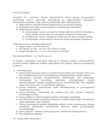 Szanowni Państwo, WIOLETA FIC CENTRUM USŁUG PRALNICZYCH BLUU planuje przeprowadzić modernizację procesu pralniczego zmierzającego do wygenerowania oszczędności finansowych związanych z jego realizacją. Planowany zakres zmiany procesu: 1) Wykorzystanie wody deszczowej przejmowanej z powierzchni dachów; 2) Magazynowanie ujętej wody deszczowej w podziemnych zbiornikach; 3) Wykorzystanie ścieków: a) pochodzącego z prania asortymentu białego (głównie pościele pochodzące z hoteli, szpitali, pensjonatów etc.) do prania asortymentu kolorowego; b) pochodzącego z prania asortymentu kolorowego do prania odzieży roboczej; c) pochodzącego z prania odzieży roboczej do prania pozostałego asortymentu. Parametry procesu technologicznego prania: 1) Zużycie wody – od 40 do 50 m3/d, 2) Ilość prania na dobę - od 2 do 5 ton (średnio 4 tony), 3) Zużycie detergentów - 5-7 g na 1 kg wsadu tj. ok. 25 kg/d, Powierzchnia dachów – ok. 1 ha (10 tys. m2). W związku z powyższym nasza firma zwraca się do Państwa z prośbą o przeprowadzenie szacunku kosztów wykonania studium wykonalności dla projektu badawczo-rozwojowego w zakresie: I) Technologicznym: 1) Opracowania koncepcji i zakresu prowadzenia prac badawczych, których efektem ma być zmodyfikowany proces technologiczny w przedstawionym powyżej zakresie; 2) Opracowania koncepcji przeprowadzenia dodatkowych prac badawczych zmierzających do sprawdzenia możliwości technologicznych innych, nieprzewidzianych powyżej modyfikacji procesu technologicznego, które mogłyby okazać się ekonomicznie i środowiskowo opłacalne; 3) Analizy możliwość wykorzystania ciepła technologicznego na poszczególnych etapach procesu prania; 4) Oceny bazowego i docelowego (po realizacji prac B+R) poziomu gotowości technologicznej (TRL); 5) Oceny wpływu na ochronę/poprawę jakości środowiska naturalnego; 6) Określenia kluczowych warunków powodzenia projektu badawczego i identyfikacja ryzyk związanych z jego realizacją; 7) Oceny innowacyjności projektu opisującego unikalne cechy w porównaniu z innymi produktami istniejącymi rozwiązaniami procesów pralni profesjonalnych (przemysłowych). 8) Oceny zagrożeń i zdolności operacyjnych (tzw. HAZOP) dla obsługi procesu; 9) Plan gospodarki odpadami. II) Analizy rynku obejmującej: 1) Ocenę zapotrzebowania rynkowego na rezultaty projektu (z uwzględnieniem różnic dotyczących innowacji procesowych: analiza rynku docelowego i klientów/analiza wpływu na cykl produkcyjny w przedsiębiorstwie); 2) Ocenę opłacalności wdrożenia; 3) Weryfikację czy kwestia praw własności intelektualnej nie stanowi bariery do wdrożenia wyników projektu; 4) Ocenę kluczowych warunków powodzenia i identyfikacja ryzyk; III) Analizy potencjału kadrowego i technicznego firmy obejmującej: 1) Określenie modelu zarządzania projektem; 2) Ocenę potencjału kadr bezpośrednio zaangażowanych w realizację projektu; 3) Ocenę potencjału technicznego do realizacji projektu; 4) Ocenę potencjału finansowego do realizacji projektu; 5) Ocenę kluczowych warunków powodzenia i identyfikacja ryzyk. Uprzejmie prosimy o sporządzenie szacunkowej wyceny powyższego zamówienia (w kwotach netto i brutto) i przesłania jej na adres mailowy: [email protected] do dnia 2016-10-20 do godziny 9:00. Niniejsza oferta nie stanowi oferty w myśl art. 66 Kodeksu Cywilnego. Zapytanie ma na celu określenie wartości szacunkowej niezbędnej do przeprowadzenia postępowania o udzielenie zamówienia publicznego. Z poważaniem, Wioleta Fic