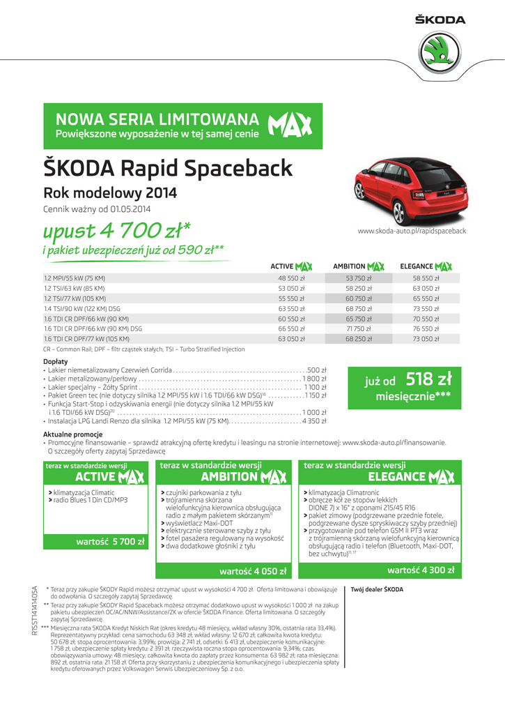 NOWA SERIA LIMITOWANA Powiększone wyposażenie w tej samej cenie ŠKODA Rapid Spaceback Rok modelowy 2014 Cennik ważny od 01.05.2014 upust 4 700 zł* www.skoda-auto.pl/rapidspaceback i pakiet ubezpieczeń już od 590 zł** ACTIVE AMBITION ELEGANCE 1.2 MPI/55 kW (75 KM) 48 550 zł 53 750 zł 58 550 zł 1.2 TSI/63 kW (85 KM) 53 050 zł 58 250 zł 63 050 zł 1.2 TSI/77 kW (105 KM) 55 550 zł 60 750 zł 65 550 zł 1.4 TSI/90 kW (122 KM) DSG 63 550 zł 68 750 zł 73 550 zł 1.6 TDI CR DPF/66 kW (90 KM) 60 550 zł 65 750 zł 70 550 zł 1.6 TDI CR DPF/66 kW (90 KM) DSG 66 550 zł 71 750 zł 76 550 zł 1.6 TDI CR DPF/77 kW (105 KM) 63 050 zł 68 250 zł 73 050 zł CR – Common Rail; DPF – filtr cząstek stałych; TSI – Turbo Stratified Injection Dopłaty • Lakier niemetalizowany Czerwień Corrida. . . . . . . . . . . . . . . . . . . . . . . . . . . . . . . . . . . . . . . . . . . . 500 zł • Lakier metalizowany/perłowy. . . . . . . . . . . . . . . . . . . . . . . . . . . . . . . . . . . . . . . . . . . . . . . . . . . . . .1 800 zł • Lakier specjalny – Żółty Sprint. . . . . . . . . . . . . . . . . . . . . . . . . . . . . . . . . . . . . . . . . . . . . . . . . . . . . . 1 100 zł • Pakiet Green tec (nie dotyczy silnika 1.2 MPI/55 kW i 1.6 TDI/66 kW DSG)18 . . . . . . . . . . . . 1 150 zł • Funkcja Start-Stop i odzyskiwania energii (nie dotyczy silnika 1.2 MPI/55 kW i 1.6 TDI/66 kW DSG)20 . . . . . . . . . . . . . . . . . . . . . . . . . . . . . . . . . . . . . . . . . . . . . . . . . . . . . . . . . . . . .1 000 zł • Instalacja LPG Landi Renzo dla silnika 1.2 MPI/55 kW (75 KM). . . . . . . . . . . . . . . . . . . . . . . . 4 350 zł 518 zł już od miesięcznie*** Aktualne promocje • Promocyjne finansowanie – sprawdź atrakcyjną ofertę kredytu i leasingu na stronie internetowej: www.skoda-auto.pl/finansowanie. O szczegóły oferty zapytaj Sprzedawcę teraz w standardzie wersji ACTIVE > klimatyzacja Climatic > radio Blues 1 Din CD/MP3 wartość 5 700 zł teraz w standardzie wersji teraz w standardzie wersji > czujniki parkowania z tyłu > trójramienna skórzana wielofunkcyjna kierownica obsługująca radio z małym pakietem skórzanym11 > wyświetlacz Maxi-DOT > elektrycznie sterowane szyby z tyłu > fotel pasażera regulowany na wysokość > dwa dodatkowe głośniki z tyłu > klimatyzacja Climatronic > obręcze kół ze stopów lekkich DIONE 7J x 16” z oponami 215/45 R16 > pakiet zimowy (podgrzewane przednie fotele, podgrzewane dysze spryskiwaczy szyby przedniej) > przygotowanie pod telefon GSM II PT3 wraz z trójramienną skórzaną wielofunkcyjną kierownicą obsługującą radio i telefon (Bluetooth, Maxi-DOT, bez uchwytu)11, 17 AMBITION ELEGANCE R1SST14141405A wartość 4 050 zł *Teraz przy zakupie ŠKODY Rapid możesz otrzymać upust w wysokości 4 700 zł. Oferta limitowana i obowiązuje do odwołania. O szczegóły zapytaj Sprzedawcę. **Teraz przy zakupie ŠKODY Rapid Spaceback możesz otrzymać dodatkowo upust w wysokości 1 000 zł na zakup pakietu ubezpieczeń OC/AC/NNW/Assistance/ZK w ofercie ŠKODA Finance. Oferta limitowana. O szczegóły zapytaj Sprzedawcę. ***Miesięczna rata SKODA Kredyt Niskich Rat (okres kredytu 48 miesięcy, wkład własny 30%, ostatnia rata 33,4%). Reprezentatywny przykład: cena samochodu 63 348 zł; wkład własny: 12 670 zł; całkowita kwota kredytu: 50 678 zł; stopa oprocentowania: 3,99%; prowizja: 2 741 zł, odsetki: 6 413 zł, ubezpieczenie komunikacyjne: 1 758 zł, ubezpieczenie spłaty kredytu: 2 391 zł; rzeczywista roczna stopa oprocentowania: 9,34%; czas obowiązywania umowy: 48 miesięcy; całkowita kwota do zapłaty przez konsumenta: 63 982 zł; rata miesięczna: 892 zł, ostatnia rata: 21 158 zł. Oferta przy skorzystaniu z ubezpieczenia komunikacyjnego i ubezpieczenia spłaty kredytu oferowanych przez Volkswagen Serwis Ubezpieczeniowy Sp. z o.o. wartość 4 300 zł Twój dealer ŠKODA NOWA SERIA LIMITOWANA Powiększone wyposażenie w tej samej cenie ŠKODA Rapid Rok modelowy 2014 Cennik ważny od 01.05.2014 upust 4 700 zł* www.skoda-auto.pl/rapid ACTIVE AMBITION ELEGANCE 1.2 MPI/55 kW (75 KM) 48 550 zł 53 750 zł 1.2 TSI/63 kW (85 KM) 53 050 zł 58 250 zł 58 900 zł 63 400 zł 1.2 TSI/77 kW (105 KM) 55 550 zł 60 750 zł 65 900 zł 1.4 TSI/90 kW (122 KM) DSG 63 550 zł 68 750 zł 73 900 zł 1.6 TDI CR DPF/66 kW (90 KM) 60 550 zł 65 750 zł 70 900 zł 1.6 TDI CR DPF/66 kW (90 KM) DSG 66 550 zł 71 750 zł 76 900 zł 1.6 TDI CR DPF/77 kW (105 KM) 63 050 zł 68 250 zł 73 400 zł CR – Common Rail; DPF – filtr cząstek stałych; TSI – Turbo Stratified Injection Dopłaty • Lakier niemetalizowany Czerwień Corrida. . . . . . . . . . . . . . . . . . . . . . . . . . . . . . . . . . . . . . . . . . 500 zł • Lakier metalizowany/perłowy. . . . . . . . . . . . . . . . . . . . . . . . . . . . . . . . . . . . . . . . . . . . . . . . . . . .1 800 zł • Lakier specjalny – Żółty Sprint. . . . . . . . . . . . . . . . . . . . . . . . . . . . . . . . . . . . . . . . . . . . . . . . . . . . 1 100 zł • Pakiet Green tec (nie dotyczy silnika 1.2 MPI/55 kW i 1.6 TDI/66 kW DSG)18 . . . . . . . . . . 1 150 zł • Funkcja Start-Stop i odzyskiwania energii (nie dotyczy silnika 1.2 MPI/55 kW i 1.6 TDI/66 kW DSG)20 . . . . . . . . . . . . . . . . . . . . . . . . . . . . . . . . . . . . . . . . . . . . . . . . . . . . . . . . . . .1 000 zł • Instalacja LPG Landi Renzo dla silnika 1.2 MPI/55 kW (75 KM). . . . . . . . . . . . . . . . . . . . . . 4 350 zł 518 zł już od miesięcznie** Aktualne promocje • Promocyjne finansowanie – sprawdź atrakcyjną ofertę kredytu i leasingu na stronie internetowej: www.skoda-auto.pl/finansowanie. O szczegóły oferty zapytaj Sprzedawcę teraz w standardzie wersji ACTIVE > klimatyzacja Climatic > radio Blues 1 Din CD/MP3 wartość 5 700 zł teraz w standardzie wersji teraz w standardzie wersji > czujniki parkowania z tyłu > trójramienna skórzana wielofunkcyjna kie