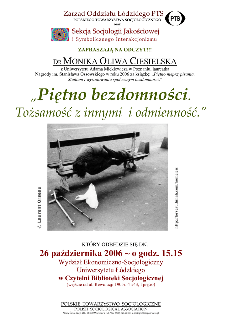 Zarząd Oddziału Łódzkiego PTS POLSKIEGO TOWARZYSTWA SOCJOLOGICZNEGO oraz Sekcja Socjologii Jakościowej i Symbolicznego Interakcjonizmu ZAPRASZAJĄ NA ODCZYT!!! DR MONIKA OLIWA CIESIELSKA z Uniwersytetu Adama Mickiewicza w Poznaniu, laureatka Nagrody im. Stanisława Ossowskiego w roku 2006 za książkę: „Piętno nieprzypisania. Studium i wyizolowaniu społecznym bezdomności.” „Piętno bezdomności. © Laurent Orseau http://lorseau.hinah.com/homeless Tożsamość z innymi i odmienność.” KTÓRY ODBĘDZIE SIĘ DN. 26 października 2006 ~ o godz. 15.15 Wydział Ekonomiczno-Socjologiczny Uniwersytetu Łódzkiego w Czytelni Biblioteki Socjologicznej (wejście od ul. Rewolucji 1905r. 41/43, I piętro) POLSKIE TOWARZYSTWO SOCJOLOGICZNE POLISH SOCIOLOGICAL ASSOCIATION Nowy Świat 72, p. 216, 00-330 Warszawa, tel./fax (0-22) 826-77-37, e-mail:[email protected]