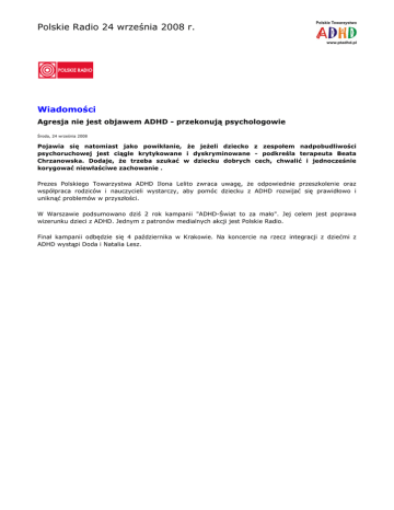 Polskie Radio 24 września 2008 r. Wiadomości Agresja nie jest objawem ADHD - przekonują psychologowie Środa, 24 września 2008 Pojawia się natomiast jako powikłanie, że jeżeli dziecko z zespołem nadpobudliwości psychoruchowej jest ciągle krytykowane i dyskryminowane - podkreśla terapeuta Beata Chrzanowska. Dodaje, że trzeba szukać w dziecku dobrych cech, chwalić i jednocześnie korygować niewłaściwe zachowanie . Prezes Polskiego Towarzystwa ADHD Ilona Lelito zwraca uwagę, że odpowiednie przeszkolenie oraz współpraca rodziców i nauczycieli wystarczy, aby pomóc dziecku z ADHD rozwijać się prawidłowo i uniknąć problemów w przyszłości. W Warszawie podsumowano dziś 2 rok kampanii "ADHD-Świat to za mało". Jej celem jest poprawa wizerunku dzieci z ADHD. Jednym z patronów medialnych akcji jest Polskie Radio. Finał kampanii odbędzie się 4 października w Krakowie. Na koncercie na rzecz integracji z dziećmi z ADHD wystąpi Doda i Natalia Lesz.
