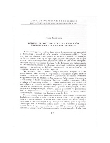 Teresa Szychowska WYDZIAŁ PRZYGOTOWAWCZY DLA STUDENTÓW ZAGRANICZNYCH W SANKT-PETERSBURGU W nauczaniu języka polskiego jako obcego korzystano dotąd przeważnie z doświadczeń /i m etod lektorów języków zachodnioeuropejskich. Często przy tym nie zdawano sobie sprawy, że dydaktyka języków niefleksyjnych w istotny sposób różni się od dydaktyki języków fleksyjnych, do których należą z nielicznymi wyjątkami języki słowiańskie. W tym świetle szczególnie znacząca staje się współpraca Studium Języka Polskiego dla Cudzoziemców w Uniwersytecie Łódzkim z podobnymi ośrodkami rosyjskimi, ukraińskimi, czeskimi i słowackimi, w których przygotowuje się cudzoziemców pod względem językowym do studiów wyższych. We wrześniu 1990 r. podczas pobytu rosyjskiej delegacji w Łodzi przygotowano tekst umowy o bezpośredniej współpracy między Studium Języka Polskiego dla Cudzoziemców w Uniwersytecie Łódzkim i Wydziałem Przygotowawczym dla Studentów Zagranicznych Państwowego Uniwersytetu Technicznego w Sankt-Petersburgu. Ustalono, że celem współpracy będzie wymiana wykładowców m ająca za zadanie podnoszenie ich kwalifikacji, prowadzenie w grupach autorskich wspólnych prac nad przygotowaniem m ateriałów metodycznych, podręczników i pomocy dydaktycznych, a także program ów komputerowych. Umowa została podpisana w październiku 1991 r. Zapoczątkow ana w ten sposób bezpośrednia współpraca między wymienionymi ośrodkam i jest kontynuowana do dziś. Nosząca obecnie nazwę Sankt-Petersburskiego Państwowego Uniwersytetu I echnicznego uczelnia została założona 3 m arca 1899 r. i od początku była jednym z najważniejszych ośrodków kształcenia wysoko wykwalifikowanych inżynierów i kadr naukowych Rosji. Początkowo istniały tylko 4 wydziały, obecnie jest ich 12. Uczelnia kształci około 15 tys. studentów i zatrudnia łącznie około 2 tys. pracowników, w tym 800 profesorów i docentów. Biblioteka Uniwersytetu Technicznego należy do największych w kraju, liczy około 2,5 min tomów. Uczelnia wychowała wielu wybitnych uczonych - laureatów nagród krajowych i międzynarodowych (w tym Nagrody Nobla). Od 1965 r. przy Uniwersytecie Technicznym istnieje Wydział Przygotowawczy dla Studentów Zagranicznych. Jest to nowoczesny kompleks dydaktyczno-naukowo-wychowawczy wyposażony wg wymagań współczesnej dydaktyki w sprzęt techniczny najnowszej generacji, filmy video i kom putery. W jego skład wchodzi korpus dydaktyczny, akademik, 2 stołówki, kompleks sportowy, sala konferencyjna z synchronizowanym systemem tłumaczenia na 4 języki, własne studio telewizyjne, studio fotograficzne, sala do zajęć pozalekcyjnych o charakterze rekreacyjno-wychowawczym i dydaktycznym. Wydział dysponuje pięcioma laboratoriami językowymi, pięcioma salami komputerowymi, pięciom a pracowniami fizycznymi, chemicznymi i biologicznymi, piętnastom a salami wyposażonymi w sprzęt telewizyjny i video. Studenci m ogą również korzystać z księgozbioru bibliotecznego liczącego około 40.000 woluminów, gazet i czasopism w 4 językach, a także z czytelni obliczonej na 100 czytelników. Od 1965 r. do tej pory na Wydziale przygotowano do studiów w rosyjskich uczelniach ponad 8 tys. studentów zagranicznych z różnych krajów Europy, Afryki, Azji i Ameryki Łacińskiej oraz USA. W trakcie nauki w cyklu najczęściej rocznym, rzadziej półtorarocznym lub dwuletnim, cudzoziemcy uczą się języka rosyjskiego ogólnego i specjalistycznego, zdobywają wiedzę z zakresu przedmiotów kierunkowych, a także poznają literaturę rosyjską, historię, kulturę i sztukę Rosji. N a Wydziale Przygotowawczym dla Studentów Zagranicznych w Sankt-Petersburgu funkcjonuje 8 katedr: K atedra Języka Rosyjskiego, K atedra Matematyki i Cybernetyki, K atedra Fizyki Ogólnej, K atedra Chemii Ogólnej, K ated ra N auk Społecznych, K atedra Podstaw Rysunku Technicznego, Katedra Kultury Fizycznej i Sportu, Katedra Lingwistyki, Literatury i Kultury. Zatrudnionych jest około 120 wykładowców języka rosyjskiego, literatury, kultury, historii, fizyki, m atematyki, informatyki, chemii, biologii, rysunku technicznego i wychowania fizycznego, w tym 45 profesorów i docentów. Wydział Przygotowawczy dla Studentów Zagranicznych w Sankt-Petersburgu znany jest w Rosji jako jeden z wiodących w opracowaniu takich problemów jak: - intensywne metody nauczania cudzoziemców języka rosyjskiego i przedm iotów kierunkowych podczas kursu elementarnego, - tworzenie nowych podręczników wg nowoczesnych założeń, - naukowe podstawy międzyprzedmiotowej korelacji i nauczanie cudzoziemców języka specjalistycznego na zajęciach z przedmiotów kierunkowych, - wykorzystanie środków audiowizualnych w procesie dydaktycznym, szczególnie filmów telewizyjnych i video, - nowoczesne programy i scenariusze komputerowe, problemy socjalno-psychologicznej i socjalno-kulturalnej i biologicznej adaptacji studentów zagranicznych do warunków życia i nauki w Rosji. Prow adzona od 1991 r. współpraca Studium Języka Polskiego dla Cudzoziemców w Uniwersytecie Łódzkim z Wydziałem Przygotowawczym dla Studentów Zagranicznych w Sankt-Petersburgu pozwoliła naszym pracownikom zapoznać się z bogatszym dorobkiem naukowym rosyjskiej placówki, umożliwiła też wzajemną wymianę doświadczeń z zakresu pracy dydaktyczno-wychowawczej oraz stworzyła warunki do dyskusji naukowych i wspólnych prac nad interesującymi obie strony zagadnieniami, np. zasadami tworzenia nowych podręczników do nauczania języka i przedmiotów kierunkowych, opracowaniem program ów i scenariuszy komputerowych, a także wykorzystaniem środków audiowizualnych w procesie dydaktycznym oraz problemami socjalno-psychologicznej i socjalno-kulturalnej i biologicznej adaptacji studentów zagranicznych do nowych dla nich warunków życia i nauki. Współpracują ze sobą nie tylko poloniści, ale także fizycy, matematycy, chemicy