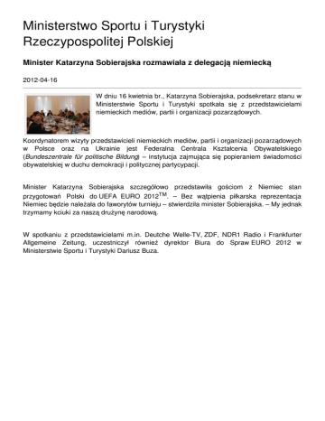 Ministerstwo Sportu i Turystyki Rzeczypospolitej Polskiej Minister Katarzyna Sobierajska rozmawiała z delegacją niemiecką 2012-04-16 W dniu 16 kwietnia br., Katarzyna Sobierajska, podsekretarz stanu w Ministerstwie Sportu i Turystyki spotkała się z przedstawicielami niemieckich mediów, partii i organizacji pozarządowych. Koordynatorem wizyty przedstawicieli niemieckich mediów, partii i organizacji pozarządowych w Polsce oraz na Ukrainie jest Federalna Centrala Kształcenia Obywatelskiego (Bundeszentrale für politische Bildung) – instytucja zajmująca się popieraniem świadomości obywatelskiej w duchu demokracji i politycznej partycypacji. Minister Katarzyna Sobierajska szczegółowo przedstawiła gościom z Niemiec stan przygotowań Polski do UEFA EURO 2012TM. – Bez wątpienia piłkarska reprezentacja Niemiec będzie należała do faworytów turnieju – stwierdziła minister Sobierajska. – My jednak trzymamy kciuki za naszą drużynę narodową. W spotkaniu z przedstawicielami m.in. Deutche Welle-TV, ZDF, NDR1 Radio i Frankfurter Allgemeine Zeitung, uczestniczył również dyrektor Biura do Spraw EURO 2012 w Ministerstwie Sportu i Turystyki Dariusz Buza.