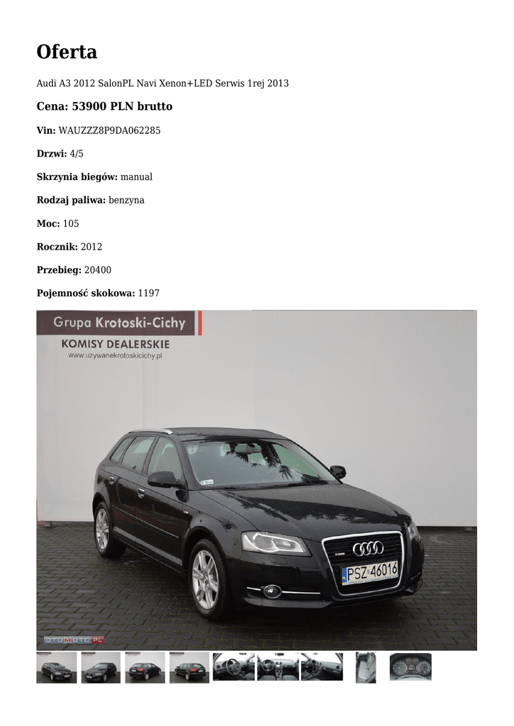 Oferta Audi A3 2012 SalonPL Navi Xenon+LED Serwis 1rej 2013 Cena: 53900 PLN brutto Vin: WAUZZZ8P9DA062285 Drzwi: 4/5 Skrzynia biegów: manual Rodzaj paliwa: benzyna Moc: 105 Rocznik: 2012 Przebieg: 20400 Pojemność skokowa: 1197 Opis: Auto-Handel-Centrum Krotoski-Cichy Autoryzowany Dealer VW Audi Seat Skoda GWARANCJA POCHODZENIA MOŻLIWOŚĆ SPRAWDZENIA POJAZDU W STACJI OBSŁUGI. MOŻLIWOŚĆ POZOSTAWIENIA SWOJEGO SAMOCHODU UŻYWANEGO W ROZLICZENIU -----------------------------------------------------------------------------------------------------------------------------------------------------Uwaga: Miejsce ekspozycji pojazdu - Grupa Krotoski-Cichy Salon Pojazdów Używanych Wysogotowo, ul. Skórzewska 8 OGŁOSZENIE PRYWATNE ( samochód w ciągłej eksploatacji ) NR TELEFONU DO WŁAŚCICIELA: 602 - 329 - 163 -----------------------------------------------------------------------------------------------------------------------------------------------------AUDI A3 SPORTBACK 1.2 TFSI 6-biegów 105 KM samochód z tym silnikiem jest bardzo elastyczny i dynamiczny, a zarazem oszczędny dzięki systemowi start-stop zużycie paliwa to ok 6,0l Samochód kupiony w polskim salonie w 2.2013 auto świeżo po przeglądzie gwarancyjnym w ASO AUDI Bardzo bogate wyposażenie: Skrzynia biegów 6 stopniowa System nawigacji satelitarnej , wyświetlacz wysokiej rozdzielczości , Radio CD obsługa kart SD oraz MP3 Bixenony oraz światła LED do jazdy dziennej Klimatyzacja dwustrefowa (Climatronic) Tempomat System Start-Stop System nagłośnienia z 7 głośnikami Lusterka boczne elektrycznie regulowane 4 x elektryczne szyby Autoalarm z funkcją dozoru wnętrza Aplikacje dekoracyjne na desce rozdzielczej, konsoli środkowej i drzwiach Obramowania osłony wlotu powietrza do chłodnicy, listwy wokół drzwi oraz klamki z chromowanymi dodatkami Relingi dachowe chromowane Dźwignia zmiany biegów oraz hamulca ręcznego obszyta skórą Fotel kierowcy z regulacją wysokości Komputer pokładowy Kierownica MULTIFUNKCYJNA obszyta skórą Lusterko wewnętrzne oraz zewnętrzne kierowcy asferyczne (samościemniające się) Złącze multimedialne AUX-IN Systemy bezpieczeństwa ESP, ABS, ASR, EDS ESP - system stabilizacji toru jazdy System audio BOSE Czujniki parkowania tył Czujniki deszczu i zmierzchu Centralny zamek sterowany pilotem Wspomaganie kierownicy Funkcja oświetlenia drogi do domu "door to door" Kolor nadwozia - Czarny perłowy i inne -----------------------------------------------------------------------------------------------------------------------------------------------------OGŁOSZENIE PRYWATNE ( samochód w ciągłej eksploatacji ) NR TELEFONU DO WŁAŚCICIELA: 602 - 329 - 163 ----------------------------------------------------------------------------------------------------------------------------------------------------Oferujemy kompleksową obsługę sprzedaży ratalnej na bardzo dogodnych warunkach - w celu bliższego zapoznania się z aktualną ofertą finansowania prosimy o kontakt : Łukasz Grześkowiak - 601 383 710 Katarzyna Świątkiewicz - 609 562 980 Oferujemy ubezpieczenia samochodowe z wiodących na rynku ubezpieczalni - możliwość zakupu pakietu ubezpieczeniowego na miejscu. Oferujemy możliwość jazdy próbnej przed zakupem oraz usługę inspekcji pojazdu. Przyjmujemy również w rozliczeniu każdy pojazd. -----------------------------------------------------------------------------------------------------------------------------------------------------Ogłoszenie ma charakter informacyjny i stanowi zaproszenie do zawarcia umowy (art. 71 Kodeksu cywilnego); nie stanowi natomiast oferty handlowej w rozumieniu art. 66 § 1 Kodeksu cywilnego. W celu sprawdzenia zgodności oferty oraz uzyskania wszelkich informacji prosimy kontaktować się z handlowcem d.s. samochodów używanych Auto możesz zobaczyć: