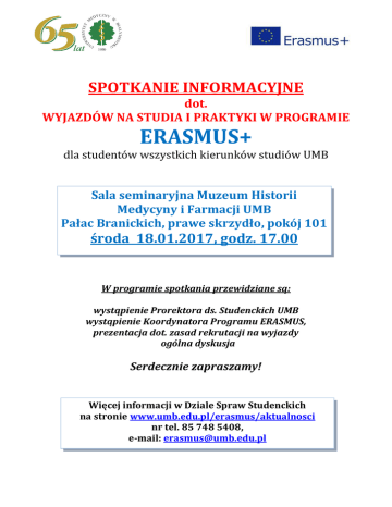 …… SPOTKANIE INFORMACYJNE dot. WYJAZDÓW NA STUDIA I PRAKTYKI W PROGRAMIE ERASMUS+ dla studentów wszystkich kierunków studiów UMB Sala seminaryjna Muzeum Historii Medycyny i Farmacji UMB Pałac Branickich, prawe skrzydło, pokój 101 środa 18.01.2017, godz. 17.00 W programie spotkania przewidziane są: wystąpienie Prorektora ds. Studenckich UMB wystąpienie Koordynatora Programu ERASMUS, prezentacja dot. zasad rekrutacji na wyjazdy ogólna dyskusja Serdecznie zapraszamy! Więcej informacji w Dziale Spraw Studenckich na stronie www.umb.edu.pl/erasmus/aktualnosci nr tel. 85 748 5408, e-mail: [email protected]