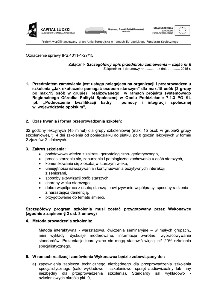 Oznaczenie sprawy IPS.4011-1-27/15 Załącznik Szczegółowy opis przedmiotu zamówienia – część nr 6 Załącznik nr 1 do umowy nr ………… z dnia ……….. 2015 r. 1. Przedmiotem zamówienia jest usługa polegająca na organizacji i przeprowadzeniu szkolenia „Jak skutecznie pomagać osobom starszym” dla max.15 osób (2 grupy po max.15 osób w grupie) realizowanego w ramach projektu systemowego Regionalnego Ośrodka Polityki Społecznej w Opolu Poddziałanie 7.1.3 PO KL pt. „Podnoszenie kwalifikacji kadry pomocy i integracji społecznej w województwie opolskim”, 2. Czas trwania i forma przeprowadzenia szkoleń: 32 godziny lekcyjnych (45 minut) dla grupy szkoleniowej (max. 15 osób w grupie/2 grupy szkoleniowe), tj. 4 dni szkolenia od poniedziałku do piątku, po 8 godzin lekcyjnych w formie 2 zjazdów 2- dniowych. 3. Zakres szkolenia: podstawowa wiedza z zakresu gerontologiczno- geriatrycznego, proces starzenia się, zaburzenia i patologiczne zachowania u osób starszych, komunikowanie się z osobą w starszym wieku, umiejętności nawiązywania i kontynuowania pozytywnych interakcji z seniorami, sposoby aktywizacji osób starszych, choroby wieku starczego, dobra współpraca z osobą starszą: nawiązywanie współpracy, sposoby radzenia z narastającą demencją, przygotowanie do tematu śmierci. Szczegółowy program szkolenia musi zostać przygotowany przez Wykonawcę (zgodnie z zapisem § 2 ust. 3 umowy) 4. Metoda prowadzenia szkolenia: Metoda interaktywna - warsztatowa, ćwiczenia seminaryjne – w małych grupach., mini wykłady, dyskusje moderowane, informacje zwrotne, wypracowywanie standardów. Prezentacje teoretyczne nie mogą stanowić więcej niż 20% szkolenia specjalistycznego. 5. W ramach realizacji zamówienia Wykonawca będzie zobowiązany do : a) zapewnienia zaplecza technicznego niezbędnego dla przeprowadzenia szkolenia specjalistycznego (sale wykładowo - szkoleniowe, sprzęt audiowizualny lub inny niezbędny dla przeprowadzenia szkolenia). Standardy sal wykładowo szkoleniowych określa pkt. 9, b) zapewnienia materiałów szkoleniowych (adekwatnych do tematyki szkolenia specjalistycznego, zawierających wyczerpujące treści przedmiotowo związane z tematyką szkolenia) oraz przedstawienie materiałów szkoleniowych Zamawiającemu do zatwierdzenia na co najmniej 3 dni roboczych przed planowanym terminem szkolenia, c) przygotowania szczegółowego programu merytorycznego szkolenia specjalistycznego uwzględniającego zakres szkolenia wskazanego w przedmiocie zamówienia i przedłożenia go do akceptacji Zamawiającemu nie później niż w ciągu 5 dni roboczych od dnia podpisania umowy, d) przedłożenia do akceptacji Zamawiającemu harmonogramu szkolenia specjalistycznego ze wskazaniem miejsca oraz terminów organizowanego szkolenia nie później niż w ciągu 5 dni roboczych od dnia podpisania umowy, e) obsługi administracyjnej szkolenia, f) zapewnienia zakwaterowania na czas trwania szkolenia dla uczestników z kolacją (1 dzień zjazdu) i śniadaniem (2 dzień zjazdu) z zachowaniem standardu opisanego w pkt. 7.- podczas każdego zjazdu, g) zapewnienia wyżywienia uczestników na czas trwania 1 zjazdu w ramach szkolenia, tj. każdemu uczestnikowi zapewnia się, 2 obiady, , 4 przerwy kawowe – 2 przerwy kawowe w ciągu jednego dnia szkolenia, Specyfikację i standardy wyżywienia określa pkt. 8. 6. Do obowiązków Wykonawcy należeć będzie także: a) promocja usługi na zasadach określonych w Umowie, zgodnie z § 12 umowy, b) przygotowanie oraz wydanie uczestnikom zaświadczenia o ukończeniu szkolenia specjalistycznego, zgodnie ze wzorem Zamawiającego oraz sporządzenie rejestru wydanych zaświadczeń. Zaświadczenia muszą być podpisywane przez Dyrektora ROPS oraz wykładowców, po czym ksero poświadczone za zgodność Wykonawca będzie zobowiązany przedłożyć Zamawiającemu wraz z innymi dokumentami wskazanymi w przedmiocie zamówienia. Pozostałe dokumenty będą przekazywane Zamawiającemu w oryginale, tj. listy obecności, ankiety (końcowa), lista odbioru materiałów szkoleniowych, c) prowadzanie list obecności, d) niezwłoczne informowanie Zamawiającego o występujących trudnościach w realizacji usługi, a w szczególności o każdym przypadku rezygnacji z uczestnictwa w szkoleniu specjalistycznym przez osoby zakwalifikowane do odbycia szkolenia, e) informowanie uczestników szkolenia o świadczeniu usługi szkoleniowej w ramach projektu pt. „Podnoszenie kwalifikacji kadry pomocy i integracji społecznej w województwie opolskim”. Poddziałanie 7.1.3 PO KL, f) złożenie Zamawiającemu sprawozdania końcowego po wykonaniu usługi (wg wzoru Zamawiającego), g) dokonanie oceny (przekazanie, zebranie i podsumowanie ankiet) efektywności szkolenia na podstawie kwestionariusza ankiety końcowej szkolenia specjalistycznego (według wzoru Zamawiającego). Ww. ocena zostanie przekazana Zamawiającemu po zakończeniu usługi. 7. Standardy zakwaterowania: a) maksymalnie 3 osoby w pokoju, b) pomieszczenia przeznaczone do zakwaterowania muszą spełniać wymagania sanitarne, przeciwpożarowe oraz inne określone odrębnymi przepisami, muszą mieć także sprawne oświetlenie oraz estetyczny wygląd (powinny być czyste i zadbane), w okresie grzewczym pokoje muszą być ogrzewane, c) zakwaterowanie jest możliwe jedynie w pokojach, które spełniają poniższe wymogi dotyczące powierzchni w m 2: - pokój 1-osobowy – 9 m2; - pokój 2-osobowy – 12 m2; - pokój 3-osobowy – 15 m2; d) zakwaterowanie może odbywać się w pokojach przeznaczonych dla większej liczby osób, jednak liczba osób w zakwaterowanych w pokoju nie może być większa niż 3 osoby, e) pokoje muszą być wyposażone w odpowiednie wyposażenie meblowe, tj.: - dla każdej osoby łóżko jednoosobowe o wymiarach min. 90 x 200cm, - nocny stolik lub półka przy każdym miejscu do spania, - wnęka garderobiana lub szafa na ubrania, - minimum 2 wieszaki na oso