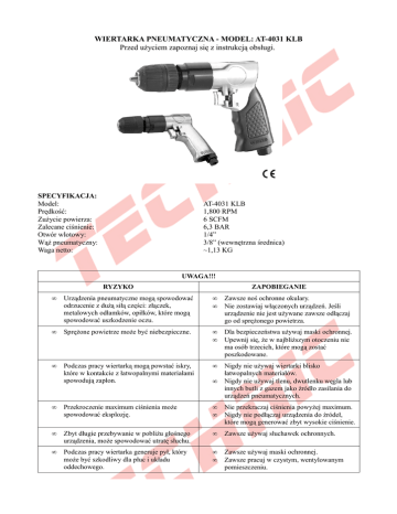 WIERTARKA PNEUMATYCZNA - MODEL: AT-4031 KLB Przed użyciem zapoznaj się z instrukcją obsługi. SPECYFIKACJA: Model: Prędkość: Zużycie powierza: Zalecane ciśnienie: Otwór wlotowy: Wąż pneumatyczny: Waga netto: AT-4031 KLB 1,800 RPM 6 SCFM 6,3 BAR 1/4” 3/8” (wewnętrzna średnica) ~1,13 KG UWAGA!!! RYZYKO ZAPOBIEGANIE • Urządzenia pneumatyczne mogą spowodować odrzucenie z dużą siłą części: złączek, metalowych odłamków, opiłków, które mogą spowodować uszkodzenie oczu. • • Zawsze noś ochronne okulary. Nie zostawiaj włączonych urządzeń. Jeśli urządzenie nie jest używane zawsze odłączaj go od sprężonego powietrza. • Sprężone powietrze może być niebezpieczne. • • Dla bezpieczeństwa używaj maski ochronnej. Upewnij się, że w najbliższym otoczeniu nie ma osób trzecich, które mogą zostać poszkodowane. • Podczas pracy wiertarką mogą powstać iskry, które w kontakcie z łatwopalnymi materiałami spowodują zapłon. • Nigdy nie używaj wiertarki blisko łatwopalnych materiałów. Nigdy nie używaj tlenu, dwutlenku węgla lub innych butli z gazem jako źródło zasilania do urządzeń pneumatycznych. • Przekroczenie maximum ciśnienia może spowodować eksplozję. • • Nie przekraczaj ciśnienia powyżej maximum. Nigdy nie podłączaj urządzenia do źródeł, które mogą generować zbyt wysokie ciśnienie. • Zbyt długie przebywanie w pobliżu głośnego urządzenia, może spowodować utratę słuchu. • Zawsze używaj słuchawek ochronnych. • Podczas pracy wiertarka generuje pył, który może być szkodliwy dla płuc i układu oddechowego. • • Zawsze używaj maski ochronnej. Zawsze pracuj w czystym, wentylowanym pomieszczeniu. • • Urządzenie pneumatyczne w kontakcie z przewodem elektrycznym może spowodować porażenie prądem. • Sprawdź czy w pobliżu miejsca pracy nie ma przewodów elektrycznych, które mogą zagrażać Twojemu bezpieczeństwu. • W urządzenie, które posiada ruszające się elementy mogą wplątać się włosy, ubranie, biżuteria lub inne przedmioty co może spowodować uszkodzenie ciała. • Podczas używania wiertarki noś odpowiednie ubranie. Nie pracuj w biżuterii, która może zostać wciągnięta w urządzenie. Zepnij długie włosy. Trzymaj urządzenie z dala od ciała i dłoni. Niepoprawne używanie urządzenia może spowodować uszkodzenie ciała. Praca uszkodzonym urządzeniem może spowodować uszkodzenie ciała. • • • • • • • Trzymaj z daleka od dzieci. Zabezpiecz urządzenie tak aby unikać niezamierzonego włączenia. Jeśli jesteś pod wpływem alkoholu nie używaj urządzenia. Nie kieruj urządzenia w stronę innych ludzi. UWAGA! • Nigdy nie używaj urządzenia niezgodnie z jego przeznaczeniem. ZASILANIE: 1. Kiedy podłączasz urządzenie do kompresora pamiętaj aby byłą wyłączone. 2. Używaj normalnego ciśnienia powietrza - 6,3 barów. 3. Osuszaj zbiornik kompresora. Woda w przewodach może spowodować uszkodzenie urządzenia. 4. Czyść filtr co tydzień. 5. Ciśnienie powinno być podwyższone jeśli wąż pneumatyczny jest dłuższy (zazwyczaj powyżej 8m). Minimalna średnica węża powinna wynosić 1/4”. Zalecana średnica węża pneumatycznego to 3/8”. 6. Używaj odpowiedniego węża pneumatycznego. Przed użyciem upewnij się, że wszystkie połączenia są zabezpieczone. INSTRUKCJA OBSŁUGI: 1. Nasmaruj urządzenie przed użyciem. (zaleca się stosowanie naolejacza) 2. Załóż wiertło odpowiednie do zamierzanej pracy po czym dokręć głowicę samozaciskową 3. Usuń zaślepkę z wylotu powietrza i podłącz węża do urządzenia. Ustaw ciśnienie powietrza na 6,3 barów. 4. Naciśnij spust w celu rozpoczęcia pracy UTRZYMANIE: 1. Urządzenie powinno być smarowane przed każdym użyciem. 2. Podczas ciągłego używania urządzenie powinno być smarowane co 1-2 godziny: • Odłącz urządzenie od ciśnienia. • Umieść kilka kropel oleju w wylocie powietrza. • Podłącz węża. Włącz urządzenie na kilka sekund tak aby olej rozprowadził się po całym urządzeniu. 3. Unikaj przechowywania w wilgotnym pomieszczeniu. ZASADY BEZPIECZEŃSTWA: • Długotrwałe wibracje emitowane przez narzędzia pneumatyczne na dłoń operatora mogą być przyczyną poważnych schorzeń i dolegliwości. • Narzędzia pneumatyczne są zasilane ciśnieniem sprężonego powietrza. Dlatego należy zawsze zachowywać szczególne środki ostrożności przy pracy. Nigdy nie przekraczaj maksymalnego ciśnienia roboczego danego urządzenia. • Zawsze używaj węży z odprowadzeniem elektrostatycznym. Bądź pewien, że używasz tylko szczelnych i w dobrym stanie węży oraz złączy. • Używaj produktów i innych akcesoriów tylko wtedy, jeżeli masz pewność, że mogą pracować z twoim urządzeniem. • Nigdy nie zatykaj otworów wylotowych powietrza palcami. • • • Nigdy nie kieruj narzędzia w stronę ludzi zwierząt i siebie. Zawsze odłącz sprężone powietrze przed przystąpieniem do jakichkolwiek czynności serwisowych. Nigdy nie modyfikuj sprzętu na własną rękę. Sprawdzaj czy wszystkie części są sprawne a w razie zużycia wymieniaj tylko na oryginalne. • Przed przystąpieniem do czyszczenia lub wymiany komponentów upewnij się, że sprężone powietrze jest odłączone i naciśnij spust narzędzia, aby mieć absolutną pewność, że nie ma tam ciśnienia. WYKAZ CZĘŚCI: 1 Główna obudowa 13 Element tłumiący 25 Przekładnia 2 O-ring 14 Przekładka 26 Trzpień 3 O-ring 15 Przyłącze powietrza 27 Obracająca oś 4 Trzpień 16 Uszczelka 28 Pierścień przekładni 5 O-ring 17 Łożysko 29 Łożysko 6 Element spustowy 18 Płytka 30 Pierścień mocowania 7 O-ring 19 Wirnik 31 Element amortyzacji 8 Przełącznik 20 Łopatka wirnika 32 Uchwyt samozaciskowy 9 Sprężyna 21 Cylinder 33 Śruba 10 Spust 22 Wał 34 Gumowana rękojeść 11 Śruba 23 Płytka 12 Śruba spustu 24 Element amortyzacji Życzymy bezpiecznej i bezawar