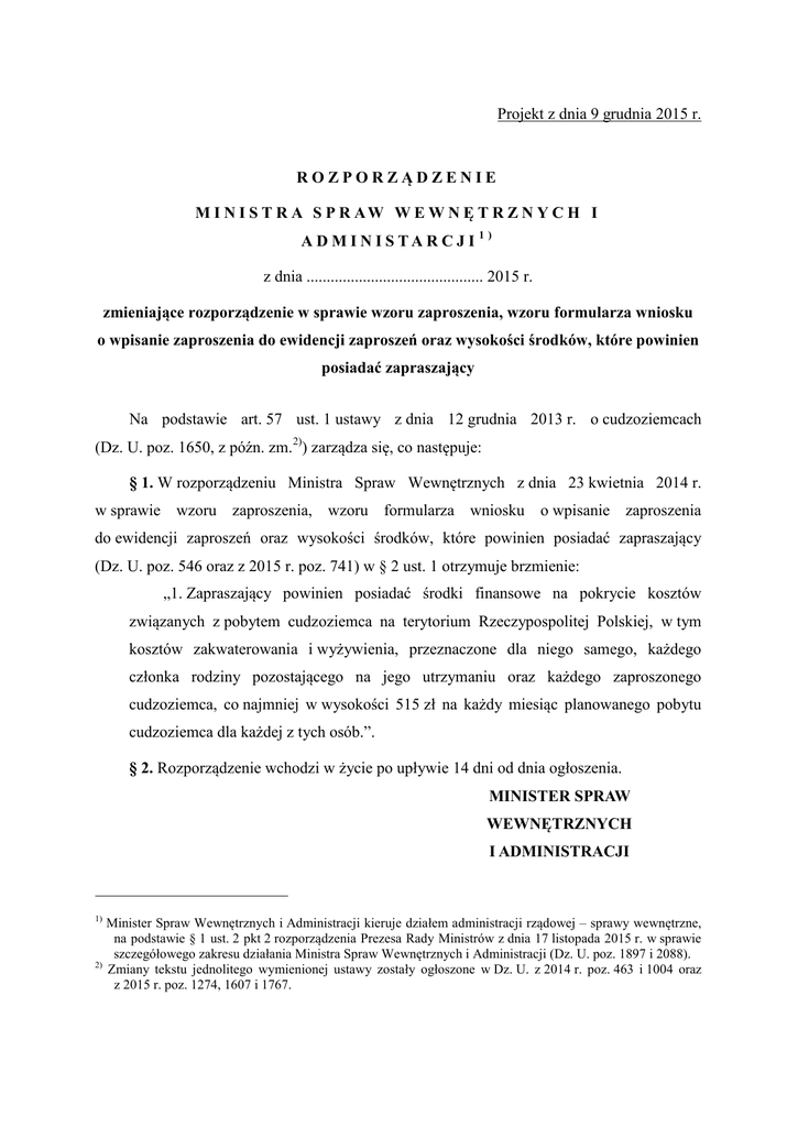 Projekt z dnia 9 grudnia 2015 r. ROZPORZĄDZENIE M I N I S T R A S P R AW W E W N Ę T R Z N Y C H I A D M I N I S TA R C J I 1 ) z dnia ............................................ 2015 r. zmieniające rozporządzenie w sprawie wzoru zaproszenia, wzoru formularza wniosku o wpisanie zaproszenia do ewidencji zaproszeń oraz wysokości środków, które powinien posiadać zapraszający Na podstawie art. 57 ust. 1 ustawy z dnia 12 grudnia 2013 r. o cudzoziemcach (Dz. U. poz. 1650, z późn. zm.2)) zarządza się, co następuje: § 1. W rozporządzeniu Ministra Spraw Wewnętrznych z dnia 23 kwietnia 2014 r. w sprawie wzoru zaproszenia, wzoru formularza wniosku o wpisanie zaproszenia do ewidencji zaproszeń oraz wysokości środków, które powinien posiadać zapraszający (Dz. U. poz. 546 oraz z 2015 r. poz. 741) w § 2 ust. 1 otrzymuje brzmienie: „1. Zapraszający powinien posiadać środki finansowe na pokrycie kosztów związanych z pobytem cudzoziemca na terytorium Rzeczypospolitej Polskiej, w tym kosztów zakwaterowania i wyżywienia, przeznaczone dla niego samego, każdego członka rodziny pozostającego na jego utrzymaniu oraz każdego zaproszonego cudzoziemca, co najmniej w wysokości 515 zł na każdy miesiąc planowanego pobytu cudzoziemca dla każdej z tych osób.”. § 2. Rozporządzenie wchodzi w życie po upływie 14 dni od dnia ogłoszenia. MINISTER SPRAW WEWNĘTRZNYCH I ADMINISTRACJI 1) 2) Minister Spraw Wewnętrznych i Administracji kieruje działem administracji rządowej – sprawy wewnętrzne, na podstawie § 1 ust. 2 pkt 2 rozporządzenia Prezesa Rady Ministrów z dnia 17 listopada 2015 r. w sprawie szczegółowego zakresu działania Ministra Spraw Wewnętrznych i Administracji (Dz. U. poz. 1897 i 2088). Zmiany tekstu jednolitego wymienionej ustawy zostały ogłoszone w Dz. U. z 2014 r. poz. 463 i 1004 oraz z 2015 r. poz. 1274, 1607 i 1767. UZASADNIENIE Projekt rozporządzenia Ministra Spraw Wewnętrznych i Administracji zmieniającego rozporządzenie w sprawie wzoru zaproszenia, wzoru formularza wniosku o wpisanie zaproszenia do ewidencji zaproszeń oraz wysokości środków, które powinien posiadać zapraszający stanowi realizację upoważnienia ustawowego zawartego w art. 57 ust. 1 ustawy z dnia 12 grudnia 2013 r. o cudzoziemcach (Dz. U. poz. 1650, z późn. zm.). Zgodnie z delegacją ustawową zawartą w art. 57 ust. 1 ustawy o cudzoziemcach minister właściwy do spraw wewnętrznych ma określić w drodze rozporządzenia wysokość środków finansowych, które powinien posiadać zapraszający, na pokrycie kosztów związanych z pobytem cudzoziemca, a także wzory zaproszenia i formularza wniosku o wpisanie zaproszenia do ewidencji zaproszeń. Zgodnie z wytycznymi przewidzianymi w art. 57 ust. 2 ww. ustawy, wysokość środków finansowych powinna być ustalona na takim poziomie, aby zapewnić pokrycie niezbędnych wydatków związanych z pobytem cudzoziemca na terytorium Rzeczypospolitej Polskiej, w tym kosztów zakwaterowania i wyżywienia, pokrycie kosztów podróży powrotnej do państwa pochodzenia lub zamieszkania albo kosztów tranzytu do państwa trzeciego, które udzieli pozwolenia na wjazd i uwzględniać możliwość zróżnicowania tej wysokości w zależności od miejsca zakwaterowania cudzoziemca, długości okresu jego pobytu na terytorium Rzeczypospolitej Polskiej oraz więzi rodzinnych łączących zapraszającego z zapraszanym. Należy przy tym wskazać, iż jako punkt odniesienia przy określaniu wysokości środków, które powinien posiadać zapraszający przyjmuje się zweryfikowane kryterium dochodowe dla osoby w rodzinie określone w rozporządzeniu Rady Ministrów w sprawie zweryfikowanych kryteriów dochodowych oraz kwot świadczeń pieniężnych z pomocy społecznej stanowiącym akt wykonawczy do ustawy z dnia 12 marca 2004 r. o pomocy społecznej (Dz. U. z 2015 r. poz. 163, z późn. zm.). Zgodnie z aktualnie obowiązującym rozporządzeniem Ministra Spraw Wewnętrznych z dnia 23 kwietnia 2014 r. w sprawie wzoru zaproszenia, wzoru formularza wniosku o wpisanie zaproszenia do ewidencji zaproszeń oraz wysokości środków, które powinien posiadać zapraszający (Dz. U. poz. 546 oraz z 2015 r. poz. 741), kwota środków finansowych, którą powinien dysponować zapraszający wynosi 456 zł. Kwota ta odpowiada wysokości kryteriów dochodowych określonych w rozporządzeniu z dnia 17 lipca 2012 r. w sprawie zweryfikowanych kryteriów dochodowych oraz kwot świadczeń pieniężnych z pomocy społecznej (Dz. U. poz. 823). Wskutek określenia nowych kwot kryteriów dochodowych, niezbędne stało się dokonanie weryfikacji środków finansowych określonych w aktualnie obowiązującym rozporządzeniu Ministra Spraw Wewnętrznych w sprawie wzoru zaproszenia, wzoru formularza wniosku o wpisanie zaproszenia do ewidencji zaproszeń oraz wysokości środków, które powinien posiadać zapraszający. Rozporządzenie Rady Ministrów z dnia 17 lipca 2012 r. w sprawie zweryfikowanych kryteriów dochodowych oraz kwot świadczeń pieniężnych z pomocy społecznej zostało z dniem 1 października 2015 r. zastąpione przez rozporządzenie o identycznym tytule z dnia 14 lipca 2015 r. Zgodnie z nowym rozporządzeniem Rady Ministrów z dnia 14 lipca 2015 r. w sprawie zweryfikowanych kryteriów dochodowych oraz kwot świadczeń pieniężnych z pomocy społecznej (Dz. U. poz. 1058) kwota kryteriów dochodowych uprawniających do świadczeń z pomocy społecznej uległa podwyższeniu do 514 zł. Biorąc pod uwagę przyjęte przez Radę Ministrów nowe, podwyższone kryterium dochodowe należało zwiększyć wysokość środków finansowych, które powinien posiadać zapraszający na pokrycie kosztów związanych z pobytem cudzoziemca na terytorium Rzeczypospolitej Polskiej. Otóż zgodnie z nowoprojektowanym przepisem zapraszający będzie obowiązany posiadać co najmniej 515 zł na każdy miesiąc planowanego pobytu dla każdego zapraszanego cudzoziemca o