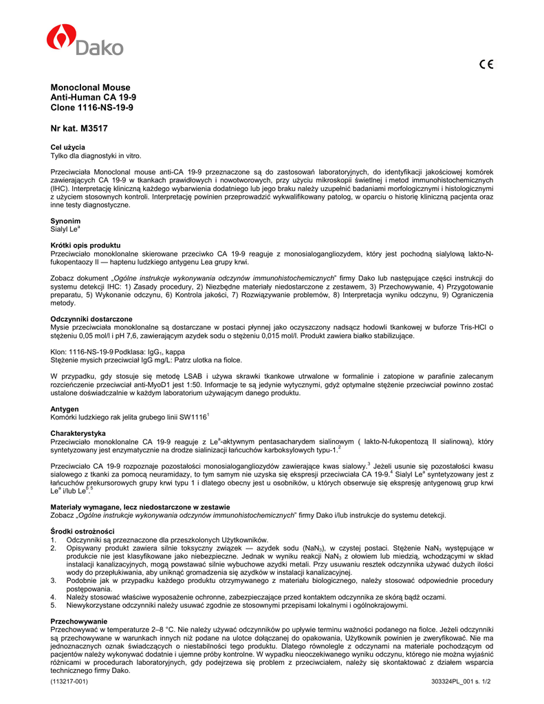 Monoclonal Mouse Anti-Human CA 19-9 Clone 1116-NS-19-9 Nr kat. M3517 Cel użycia Tylko dla diagnostyki in vitro. Przeciwciała Monoclonal mouse anti-CA 19-9 przeznaczone są do zastosowań laboratoryjnych, do identyfikacji jakościowej komórek zawierających CA 19-9 w tkankach prawidłowych i nowotworowych, przy użyciu mikroskopii świetlnej i metod immunohistochemicznych (IHC). Interpretację kliniczną każdego wybarwienia dodatniego lub jego braku należy uzupełnić badaniami morfologicznymi i histologicznymi z użyciem stosownych kontroli. Interpretację powinien przeprowadzić wykwalifikowany patolog, w oparciu o historię kliniczną pacjenta oraz inne testy diagnostyczne. Synonim Sialyl Lea Krótki opis produktu Przeciwciało monoklonalne skierowane przeciwko CA 19-9 reaguje z monosialogangliozydem, który jest pochodną sialylową lakto-Nfukopentaozy II — haptenu ludzkiego antygenu Lea grupy krwi. Zobacz dokument „Ogólne instrukcje wykonywania odczynów immunohistochemicznych” firmy Dako lub następujące części instrukcji do systemu detekcji IHC: 1) Zasady procedury, 2) Niezbędne materiały niedostarczone z zestawem, 3) Przechowywanie, 4) Przygotowanie preparatu, 5) Wykonanie odczynu, 6) Kontrola jakości, 7) Rozwiązywanie problemów, 8) Interpretacja wyniku odczynu, 9) Ograniczenia metody. Odczynniki dostarczone Mysie przeciwciała monoklonalne są dostarczane w postaci płynnej jako oczyszczony nadsącz hodowli tkankowej w buforze Tris-HCl o stężeniu 0,05 mol/l i pH 7,6, zawierającym azydek sodu o stężeniu 0,015 mol/l. Produkt zawiera białko stabilizujące. Klon: 1116-NS-19-9 Podklasa: IgG1, kappa Stężenie mysich przeciwciał IgG mg/L: Patrz ulotka na fiolce. W przypadku, gdy stosuje się metodę LSAB i używa skrawki tkankowe utrwalone w formalinie i zatopione w parafinie zalecanym rozcieńczenie przeciwciał anti-MyoD1 jest 1:50. Informacje te są jedynie wytycznymi, gdyż optymalne stężenie przeciwciał powinno zostać ustalone doświadczalnie w każdym laboratorium używającym danego produktu. Antygen Komórki ludzkiego rak jelita grubego linii SW11161 Charakterystyka Przeciwciało monoklonalne CA 19-9 reaguje z Lea-aktywnym pentasacharydem sialinowym ( lakto-N-fukopentozą II sialinową), który syntetyzowany jest enzymatycznie na drodze sialinizacji łańcuchów karboksylowych typu-1.2 Przeciwciało CA 19-9 rozpoznaje pozostałości monosialogangliozydów zawierające kwas sialowy.3 Jeżeli usunie się pozostałości kwasu sialowego z tkanki za pomocą neuramidazy, to tym samym nie uzyska się ekspresji przeciwciała CA 19-9.4 Sialyl Lea syntetyzowany jest z łańcuchów prekursorowych grupy krwi typu 1 i dlatego obecny jest u osobników, u których obserwuje się ekspresję antygenową grup krwi Lea i/lub Leb.5 Materiały wymagane, lecz niedostarczone w zestawie Zobacz „Ogólne instrukcje wykonywania odczynów immunohistochemicznych” firmy Dako i/lub instrukcje do systemu detekcji. Środki ostrożności 1. Odczynniki są przeznaczone dla przeszkolonych Użytkowników. 2. Opisywany produkt zawiera silnie toksyczny związek — azydek sodu (NaN3), w czystej postaci. Stężenie NaN3 występujące w produkcie nie jest klasyfikowane jako niebezpieczne. Jednak w wyniku reakcji NaN3 z ołowiem lub miedzią, wchodzącymi w skład instalacji kanalizacyjnych, mogą powstawać silnie wybuchowe azydki metali. Przy usuwaniu resztek odczynnika używać dużych ilości wody do przepłukiwania, aby uniknąć gromadzenia się azydków w instalacji kanalizacyjnej. 3. Podobnie jak w przypadku każdego produktu otrzymywanego z materiału biologicznego, należy stosować odpowiednie procedury postępowania. 4. Należy stosować właściwe wyposażenie ochronne, zabezpieczające przed kontaktem odczynnika ze skórą bądź oczami. 5. Niewykorzystane odczynniki należy usuwać zgodnie ze stosownymi przepisami lokalnymi i ogólnokrajowymi. Przechowywanie Przechowywać w temperaturze 2–8 °C. Nie należy używać odczynników po upływie terminu ważności podanego na fiolce. Jeżeli odczynniki są przechowywane w warunkach innych niż podane na ulotce dołączanej do opakowania, Użytkownik powinien je zweryfikować. Nie ma jednoznacznych oznak świadczących o niestabilności tego produktu. Dlatego równolegle z odczynami na materiale pochodzącym od pacjentów należy wykonywać dodatnie i ujemne próby kontrolne. W wypadku nieoczekiwanego wyniku odczynu, którego nie można wyjaśnić różnicami w procedurach laboratoryjnych, gdy podejrzewa się problem z przeciwciałem, należy się skontaktować z działem wsparcia technicznego firmy Dako. (113217-001) 303324PL_001 s. 1/2 Przygotowanie próbek Skrawki parafinowe Przeciwciało anti-CA 19-9 można stosować na skrawkach tkankowych utrwalonych w formalinie, a później zatopionych w parafinie. Skrawki tkankowe nie wymagają wcześniejszej obróbki enzymami proteolitycznymi. Instrukcja barwienia Stosować się do instrukcji zawartych w opisach wybranych metod barwienia. Interpretacja wyniku barwienia Przeciwciała anty-CA 19-9 dają odczyn błonowy i/lub cytoplazmatyczny. Charakterystyka występowania Komórki prawidłowe We wczesnym życiu płodowym sialyl- Lea występuje w rozwijającym się przewodzie pokarmowym, natomiast po urodzeniu obecny jest tylko w przewodach i wydzielinach gruczołach trawiennych, układu oddechowego oraz rozrodczego. 4,6 Imunohistochemicznie wykazano ekspresję CA 19-9 w prawidłowych nabłonku przewodowym gruczołu piersiowego, nerki, ślinianki oraz gruczołów potowych. Wykazano ekspresję monoklonalnego przeciwciała skierowanego przeciwko CA 19-9 w nabłonku oddechowym płuc, nabłonkach gruczołów jelita grubego, gronkach i przewodach trzustki, nabłonku dróg żółciowym wątroby i nabłonku przewodów gruczołu krokowego.1 Wykazano ekspresję anti-CA 19-9 w wydzielinach obecnych w świetle tkanek gruczołowych bogatych w SLea. 4,6,7 Komórki nowotworowe Silną ekspresję pr