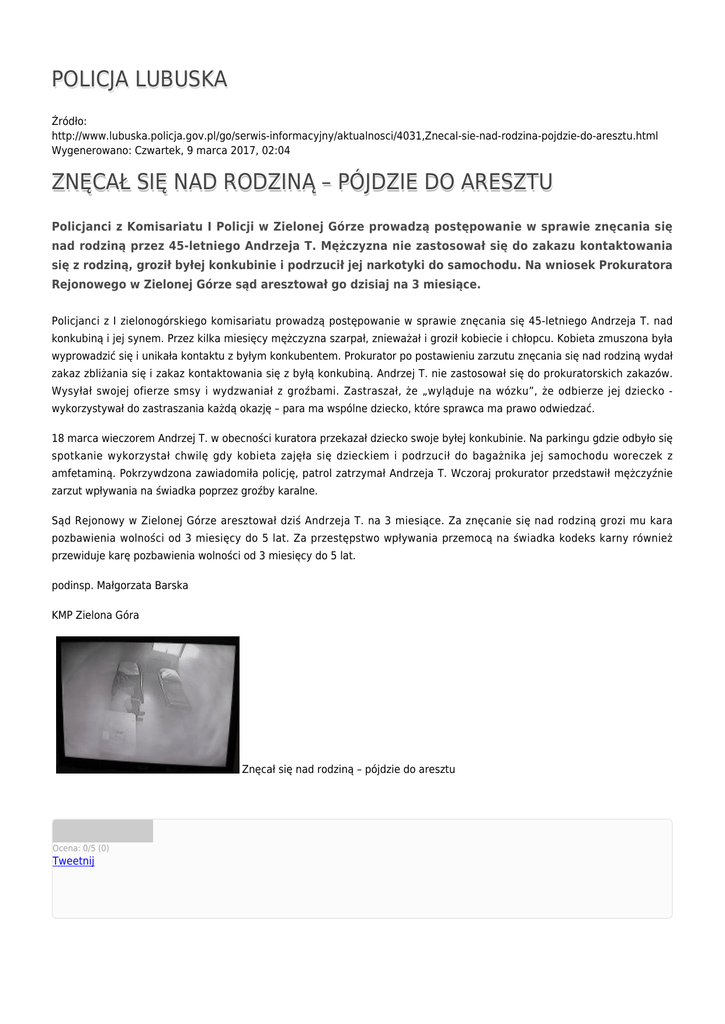 POLICJA LUBUSKA Źródło: http://www.lubuska.policja.gov.pl/go/serwis-informacyjny/aktualnosci/4031,Znecal-sie-nad-rodzina-pojdzie-do-aresztu.html Wygenerowano: Czwartek, 9 marca 2017, 02:04 ZNĘCAŁ SIĘ NAD RODZINĄ – PÓJDZIE DO ARESZTU Policjanci z Komisariatu I Policji w Zielonej Górze prowadzą postępowanie w sprawie znęcania się nad rodziną przez 45-letniego Andrzeja T. Mężczyzna nie zastosował się do zakazu kontaktowania się z rodziną, groził byłej konkubinie i podrzucił jej narkotyki do samochodu. Na wniosek Prokuratora Rejonowego w Zielonej Górze sąd aresztował go dzisiaj na 3 miesiące. Policjanci z I zielonogórskiego komisariatu prowadzą postępowanie w sprawie znęcania się 45-letniego Andrzeja T. nad konkubiną i jej synem. Przez kilka miesięcy mężczyzna szarpał, znieważał i groził kobiecie i chłopcu. Kobieta zmuszona była wyprowadzić się i unikała kontaktu z byłym konkubentem. Prokurator po postawieniu zarzutu znęcania się nad rodziną wydał zakaz zbliżania się i zakaz kontaktowania się z byłą konkubiną. Andrzej T. nie zastosował się do prokuratorskich zakazów. Wysyłał swojej ofierze smsy i wydzwaniał z groźbami. Zastraszał, że „wyląduje na wózku”, że odbierze jej dziecko wykorzystywał do zastraszania każdą okazję – para ma wspólne dziecko, które sprawca ma prawo odwiedzać. 18 marca wieczorem Andrzej T. w obecności kuratora przekazał dziecko swoje byłej konkubinie. Na parkingu gdzie odbyło się spotkanie wykorzystał chwilę gdy kobieta zajęła się dzieckiem i podrzucił do bagażnika jej samochodu woreczek z amfetaminą. Pokrzywdzona zawiadomiła policję, patrol zatrzymał Andrzeja T. Wczoraj prokurator przedstawił mężczyźnie zarzut wpływania na świadka poprzez groźby karalne. Sąd Rejonowy w Zielonej Górze aresztował dziś Andrzeja T. na 3 miesiące. Za znęcanie się nad rodziną grozi mu kara pozbawienia wolności od 3 miesięcy do 5 lat. Za przestępstwo wpływania przemocą na świadka kodeks karny również przewiduje karę pozbawienia wolności od 3 miesięcy do 5 lat. podinsp. Małgorzata Barska KMP Zielona Góra Znęcał się nad rodziną – pójdzie do aresztu Ocena: 0/5 (0) Tweetnij