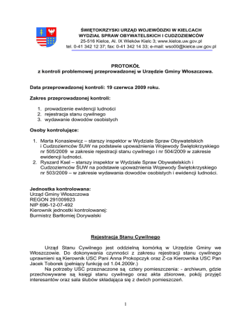 ŚWIĘTOKRZYSKI URZĄD WOJEWÓDZKI W KIELCACH WYDZIAŁ SPRAW OBYWATELSKICH I CUDZOZIEMCÓW 25-516 Kielce, Al. IX Wieków Kielc 3; www.kielce.uw.gov.pl tel. 0-41 342 12 37; fax: 0-41 342 14 33; e-mail: [email protected] PROTOKÓŁ z kontroli problemowej przeprowadzonej w Urzędzie Gminy Włoszczowa. Data przeprowadzonej kontroli: 19 czerwca 2009 roku. Zakres przeprowadzonej kontroli: 1. prowadzenie ewidencji ludności 2. rejestracja stanu cywilnego 3. wydawanie dowodów osobistych Osoby kontrolujące: 1. Marta Konasiewicz – starszy inspektor w Wydziale Spraw Obywatelskich i Cudzoziemców ŚUW na podstawie upoważnienia Wojewody Świętokrzyskiego nr 505/2009 w zakresie rejestracji stanu cywilnego i nr 504/2009 w zakresie ewidencji ludności. 2. Ryszard Ksel – starszy inspektor w Wydziale Spraw Obywatelskich i Cudzoziemców ŚUW na podstawie upoważnienia Wojewody Świętokrzyskiego nr 503/2009 – w zakresie wydawania dowodów osobistych i ewidencji ludności. Jednostka kontrolowana: Urząd Gminy Włoszczowa REGON 291009923 NIP 696-12-07-492 Kierownik jednostki kontrolowanej: Burmistrz Bartłomiej Dorywalski Rejestracja Stanu Cywilnego Urząd Stanu Cywilnego jest oddzielną komórką w Urzędzie Gminy we Włoszczowie. Do dokonywania czynności z zakresu rejestracji stanu cywilnego uprawnieni są Kierownik USC Pani Anna Prokopczyk oraz Z-ca Kierownika USC Pan Jacek Toborek (pełniący funkcję od 1.04.2009r.) Na potrzeby USC przeznaczone są cztery pomieszczenia: - archiwum, gdzie przechowywane są księgi stanu cywilnego oraz akta zbiorowe, pokój przyjęć interesantów oraz sala ślubów składająca się z dwóch pomieszczeń. 1 Warunki przechowywania ksiąg stanu cywilnego oraz akt zbiorowych nie budzą zastrzeżeń, są prawidłowe i gwarantują ich bezpieczeństwo – pomieszczenie posiada alarm, kraty w oknach oraz drzwi antywłamaniowe. Uwagi ogólne o aktach stanu cywilnego Akty stanu cywilnego sporządzane są w gotowych księgach, odrębnych dla każdego rodzaju aktów (księgi: urodzeń, małżeństw, zgonów). Księgi zawierają zapisy zdarzeń nie więcej niż dla lat pięciu, są prawidłowo zamknięte poprzez wpisanie właściwej adnotacji po ostatnim akcie sporządzonym w danym roku. Akty są sporządzane pismem ręcznym, starannym i czytelnym, pisownia poszczególnych wyrazów nie budzi wątpliwości, każdy akt jest opatrzony podpisem i pieczęcią imienną osoby uprawnionej. W przypadkach gdy podstawą sporządzenia aktu była decyzja Kierownika USC wpisana jest odpowiednia informacja w rubryce „Uwagi”. Dla poszczególnych rodzajów aktów prowadzone są także skorowidze alfabetyczne. Powyższe jest zgodne z Rozporządzeniem Ministra Spraw Wewnętrznych i Administracji z dnia 26 października 1998 r. w sprawie szczegółowych zasad sporządzania aktów stanu cywilnego, sposobu prowadzenia ksiąg stanu cywilnego, ich kontroli, przechowywania i zabezpieczenia oraz wzorów aktów stanu cywilnego, ich odpisów, zaświadczeń i protokołów.(Dz. U. z 1998r. Nr 136, poz. 884 z późn. zm). Kontroli poddano akty małżeństw, urodzeń i zgonów sporządzone w 2008 i 2009 roku. Akty urodzenia Do kontroli przedstawiono księgę urodzeń: 1. Księga za lata 2007-2008 zawierająca akty od nr 417 do nr 542 (2007r.) – od nr 1 do 68, 2. Księga za 2008 rok zawierająca akty nr 69 do 452, 3. Księga za lata 2008-2009 zawierająca akty od nr 453 do 567 (2008r.) i od 1 do 243 (2009r.) W 2008 roku sporządzono 597 aktów urodzenia, w 2009 roku (do dnia kontroli) sporządzono 260 aktów urodzenia. Skontrolowano akta zbiorowe do aktów: 597/2008 – w aktach zbiorowych znajdują się: karta pisemnego zgłoszenia urodzenia dziecka oraz kserokopia odpisu aktu małżeństwa rodziców dziecka; 569/2008 – w aktach zbiorowych: karta pisemnego zgłoszenia dziecka i kserokopia odpisu aktu małżeństwa rodziców; 456/2008 – akta zbiorowe zawierają: kartę zgłoszenia urodzenia dziecka, protokół uznania sporządzony w dniu sporządzenia aktu urodzenia; 150/2009 – akta zbiorowe zawierają: pisemne zgłoszenie urodzenia dziecka i kserokopię odpisu aktu małżeństwa rodziców; 131/2009 – akta zbiorowe zawierają tylko pisemne zgłoszenie urodzenia dziecka, bowiem rodzice dziecka zawarli związek małżeński w USC Włoszczowa; 106/2009 – akt sporządzony na podstawie dokumentu zagranicznego (transkrypcja), w rubryce „Uwagi” wpisano odpowiednią adnotację, w aktach zbiorowych znajdują się: wniosek, dowód opłaty, oryginał aktu urodzenia, oryginał tłumaczenia na jęz. polski, odpis aktu małżeństwa rodziców dziecka, decyzje (art. 73, art. 28, art.36) wraz z dowodami odbioru przez stronę; 2 100/2009 – transkrypcja, dane ojca wpisano w oparciu o przepis art. 42 ust. 2 Poasc, w aktach zbiorowych: wniosek z konsulatu, oryginał aktu urodzenia wraz z tłumaczeniem, kserokopia paszportu, odpis aktu urodzenia matki dziecka, decyzje (art.73 i art. 36) z dowodem odbioru przez stronę; 70/2009 – akta zbiorowe zawierają pisemne zgłoszenie urodzenia dziecka, (akt małżeństwa rodziców sporządzono w USC Włoszczowa); 9/2009 – w aktach zbiorowych: pisemne zgłoszenie urodzenia dziecka i odpis aktu małżeństwa rodziców. Akty małżeństwa Do kontroli przedstawiono księgę aktów małżeństwa zawierającą akty: od nr 35 do 149 (2007r.) , od nr1 do 55 (2008r.) i od nr 1 do 38 (2009r.). W 2008 roku sporządzono 149 aktów małżeństwa, w 2009 roku (do dnia kontroli) sporządzono 38 aktów małżeństwa. Skontrolowano akta zbiorowe do aktów: 35/2008 – ślub tzw. konkordatowy w dn. 7.06.2008r., akta zbiorowe zawierają: zapewnienie z dn. 11.04.2008r., zaświadczenie od duchownego bez daty wpływu, jedynie z daty sporządzenia aktu (10.06.2008r.) wynika, iż było dostarczone w przepisanym terminie, nie zawierają odpisów aktów urodzenia, bowiem sporządzone zostały w USC Włoszczowa; 36/2008 – małżeństwo zawarte przed Kierownikiem USC w dn. 14.06.2008r.