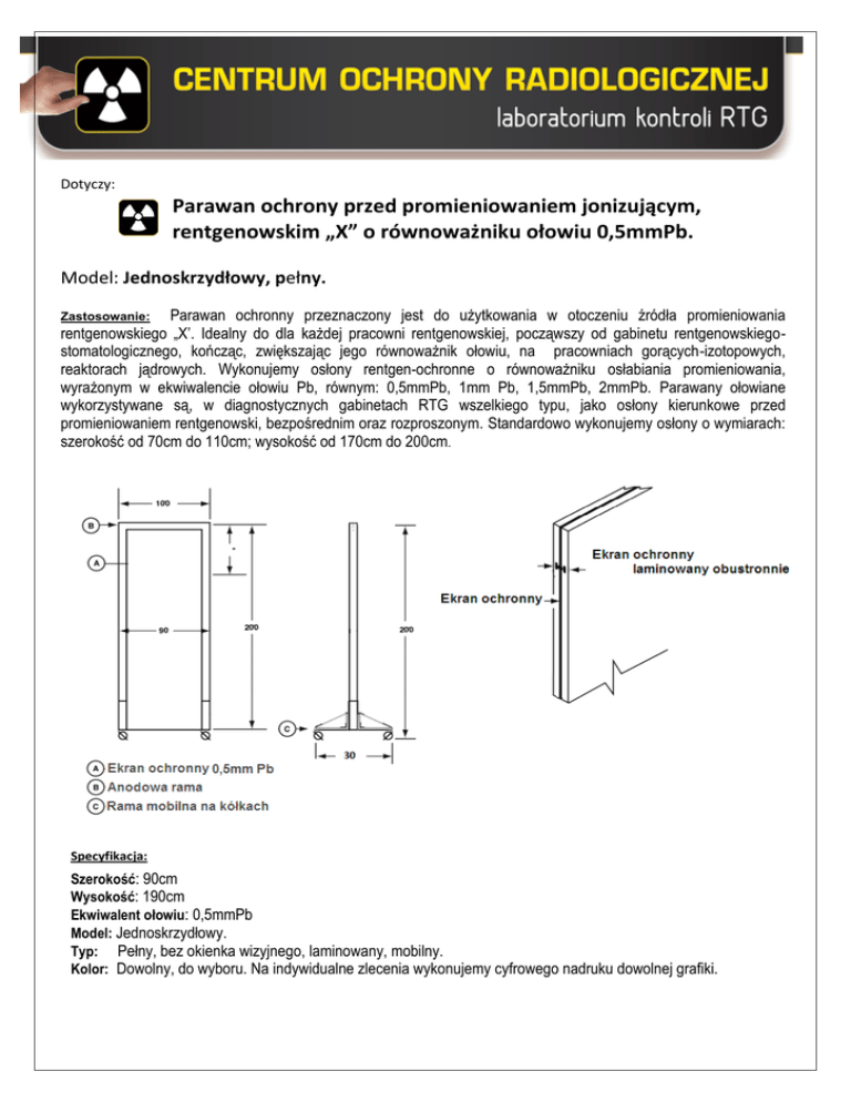 Dotyczy: Parawan ochrony przed promieniowaniem jonizującym, rentgenowskim „X” o równoważniku ołowiu 0,5mmPb. Model: Jednoskrzydłowy, pełny. Parawan ochronny przeznaczony jest do użytkowania w otoczeniu źródła promieniowania rentgenowskiego „X’. Idealny do dla każdej pracowni rentgenowskiej, począwszy od gabinetu rentgenowskiegostomatologicznego, kończąc, zwiększając jego równoważnik ołowiu, na pracowniach gorących-izotopowych, reaktorach jądrowych. Wykonujemy osłony rentgen-ochronne o równoważniku osłabiania promieniowania, wyrażonym w ekwiwalencie ołowiu Pb, równym: 0,5mmPb, 1mm Pb, 1,5mmPb, 2mmPb. Parawany ołowiane wykorzystywane są, w diagnostycznych gabinetach RTG wszelkiego typu, jako osłony kierunkowe przed promieniowaniem rentgenowski, bezpośrednim oraz rozproszonym. Standardowo wykonujemy osłony o wymiarach: szerokość od 70cm do 110cm; wysokość od 170cm do 200cm. Zastosowanie: Specyfikacja: Szerokość: 90cm Wysokość: 190cm Ekwiwalent ołowiu: 0,5mmPb Model: Jednoskrzydłowy. Typ: Pełny, bez okienka wizyjnego, laminowany, mobilny. Kolor: Dowolny, do wyboru. Na indywidualne zlecenia wykonujemy cyfrowego nadruku dowolnej grafiki. Dotyczy: Parawan ochrony przed promieniowaniem jonizującym „X”, o równoważniku ołowiu równym 0,5mmPb, z szybą ołowianą, o wymiarach [12cm x 15cm] i równoważniku osłabiania prom. 2.2mmPb. Model: Jednoskrzydłowy, z szybą ołowianą Pb. Parawan ochronny jest przeznaczony do użytkowania w otoczeniu źródła promieniowania rentgenowskiego „X’. Dzięki zastosowaniu okna wizyjnego, wykonanego ze szkła ołowianego, o równoważniku osłabiania promieniowania wyrażonym w ekwiwalencie ołowiu równym> 2.00mmPb. Parawan zapewnia możliwość bezpośredniej obserwacji pacjenta podczas wykonywania ekspozycji RTG, z zachowaniem najwyższego bezpieczeństwa dla osób wykonujących zdjęcie rentgenowskie. Szyba ołowiana posiada wymiary 12x16cm i gr 2.2cm. Zastosowanie: Specyfikacja: Szerokość: 90cm Wysokość: 190cm Ekwiwalent ołowiu: 0,5mmPb Model: Jednoskrzydłowy z szybą ołowianą Pb Typ: Z oknem wizyjnym wykonanym z szkła ołowianego Pb, o ekwiwalencie ołowiu 2.2mmPb i wymiarach światła okna [12cm x 15cm], laminowany, mobilny. Kolor: Dowolny, do wyboru. Na indywidualne zlecenia wykonujemy cyfrowego nadruku dowolnej grafiki. Wybierz kolor Oferta cenowa: Model: Typ: Jednoskrzydłowy Pełny-mobilny Szerokość Wysokość RÓWNOWAŻNIKGRUBOŚĆ OŁOWIU Cena brutto: 70-120 170-200 0,5mm Pb 1499.00 70-120 170-200 1mm Pb 1889.00 Model: Jednoskrzydłowy Z szybką ołowianą Pb [12x15cm] -mobilny 70-120 170-200 0,5mm Pb 1789.00 70-120 170-200 1mm Pb 2189.00 POWRÓT DO STRONY GŁÓWNEJ