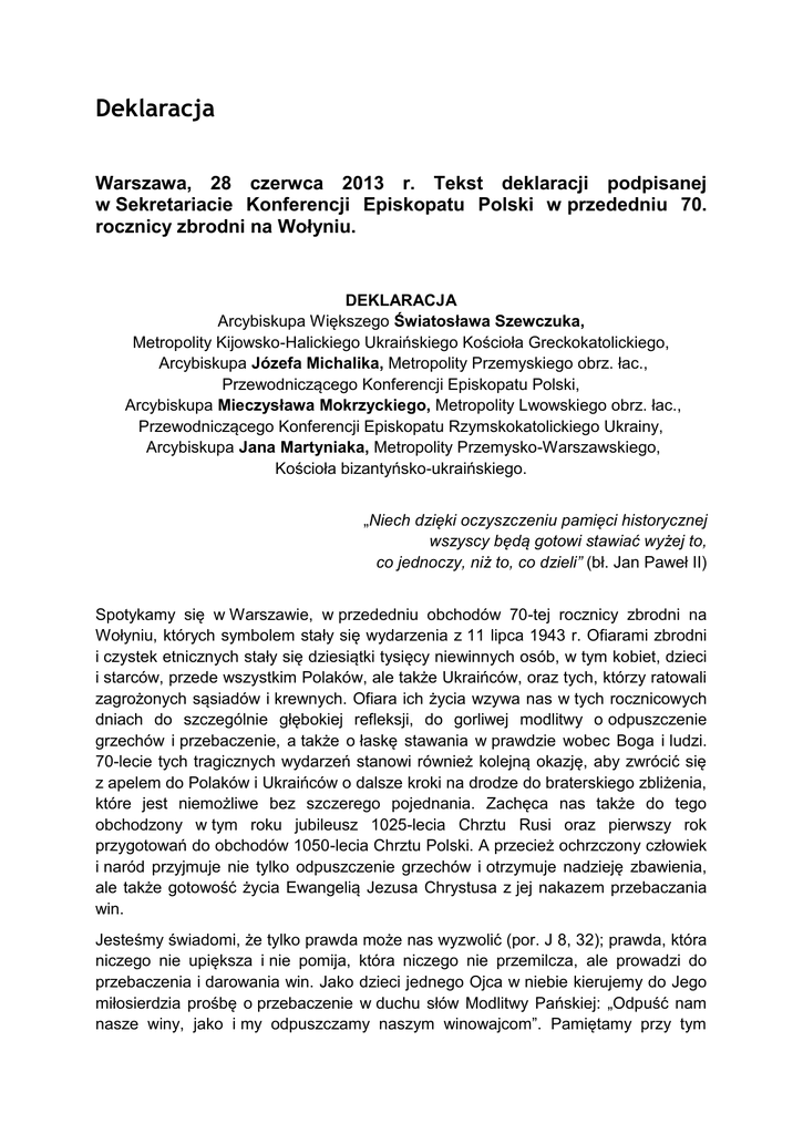 Deklaracja Warszawa, 28 czerwca 2013 r. Tekst deklaracji podpisanej w Sekretariacie Konferencji Episkopatu Polski w przededniu 70. rocznicy zbrodni na Wołyniu. DEKLARACJA Arcybiskupa Większego Światosława Szewczuka, Metropolity Kijowsko-Halickiego Ukraińskiego Kościoła Greckokatolickiego, Arcybiskupa Józefa Michalika, Metropolity Przemyskiego obrz. łac., Przewodniczącego Konferencji Episkopatu Polski, Arcybiskupa Mieczysława Mokrzyckiego, Metropolity Lwowskiego obrz. łac., Przewodniczącego Konferencji Episkopatu Rzymskokatolickiego Ukrainy, Arcybiskupa Jana Martyniaka, Metropolity Przemysko-Warszawskiego, Kościoła bizantyńsko-ukraińskiego. „Niech dzięki oczyszczeniu pamięci historycznej wszyscy będą gotowi stawiać wyżej to, co jednoczy, niż to, co dzieli” (bł. Jan Paweł II) Spotykamy się w Warszawie, w przededniu obchodów 70-tej rocznicy zbrodni na Wołyniu, których symbolem stały się wydarzenia z 11 lipca 1943 r. Ofiarami zbrodni i czystek etnicznych stały się dziesiątki tysięcy niewinnych osób, w tym kobiet, dzieci i starców, przede wszystkim Polaków, ale także Ukraińców, oraz tych, którzy ratowali zagrożonych sąsiadów i krewnych. Ofiara ich życia wzywa nas w tych rocznicowych dniach do szczególnie głębokiej refleksji, do gorliwej modlitwy o odpuszczenie grzechów i przebaczenie, a także o łaskę stawania w prawdzie wobec Boga i ludzi. 70-lecie tych tragicznych wydarzeń stanowi również kolejną okazję, aby zwrócić się z apelem do Polaków i Ukraińców o dalsze kroki na drodze do braterskiego zbliżenia, które jest niemożliwe bez szczerego pojednania. Zachęca nas także do tego obchodzony w tym roku jubileusz 1025-lecia Chrztu Rusi oraz pierwszy rok przygotowań do obchodów 1050-lecia Chrztu Polski. A przecież ochrzczony człowiek i naród przyjmuje nie tylko odpuszczenie grzechów i otrzymuje nadzieję zbawienia, ale także gotowość życia Ewangelią Jezusa Chrystusa z jej nakazem przebaczania win. Jesteśmy świadomi, że tylko prawda może nas wyzwolić (por. J 8, 32); prawda, która niczego nie upiększa i nie pomija, która niczego nie przemilcza, ale prowadzi do przebaczenia i darowania win. Jako dzieci jednego Ojca w niebie kierujemy do Jego miłosierdzia prośbę o przebaczenie w duchu słów Modlitwy Pańskiej: „Odpuść nam nasze winy, jako i my odpuszczamy naszym winowajcom”. Pamiętamy przy tym o pięknych kartach współżycia naszych narodów, o radościach i sukcesach współpracy, ale i o krzywdach, jakie zostały wyrządzone zwłaszcza w trakcie II wojny światowej i w jej następstwie. Wiemy, że chrześcijańska ocena zbrodni wołyńskiej domaga się od nas jednoznacznego potępienia i przeproszenia za nią. Uważamy bowiem, że ani przemoc, ani czystki etniczne nigdy nie mogą być metodą rozwiązywania konfliktów między sąsiadującymi ludami czy narodami, ani usprawiedliwione racją polityczną, ekonomiczną czy religijną. Pragniemy dzisiaj oddać hołd niewinnie pomordowanym, ale i przepraszać Boga za popełnione zbrodnie oraz raz jeszcze wezwać wszystkich, Ukraińców i Polaków, zamieszkujących zarówno na Ukrainie, jak i w Polsce oraz gdziekolwiek na świecie, do odważnego otwarcia umysłów i serc na wzajemne przebaczenie i pojednanie. Przypominamy słowa kard. Lubomira Huzara z 2001 r., że „niektórzy synowie i córki Ukraińskiego Kościoła Greckokatolickiego wyrządzali zło – niestety świadomie i dobrowolnie – swoim bliźnim z własnego narodu i z innych narodów”. Jako zwierzchnik Kościoła greckokatolickiego pragnę powtórzyć te słowa dzisiaj i przeprosić Braci Polaków za zbrodnie popełnione w 1943 r. W imię prawdy uważamy, że przeproszenia i prośby o wybaczenie wymaga postawa tych Polaków, którzy wyrządzali zło Ukraińcom i odpowiadali przemocą na przemoc. Jako przewodniczący Episkopatu Polski kieruję do Braci Ukraińców prośbę o wybaczenie. Do dzisiaj Polacy i Ukraińcy noszą w swojej pamięci bolesne rany i wspomnienia tragedii wołyńskiej. W sposób szczególny widoczne są one w społeczeństwie współczesnej Ukrainy, którego dobro duchowe jest najważniejsze także dla Kościoła Rzymskokatolickiego na Ukrainie. Dlatego z gorącą troską, jako przewodniczący Episkopatu Rzymskokatolickiego Ukrainy przyłączam się do apelu o pojednanie. Mam nadzieję, że pomimo tragicznej przeszłości możliwe są dobrosąsiedzkie i chrześcijańskie relacje Polaków i Ukraińców, gdziekolwiek się spotykają, współpracują i myślą o przyszłości. Za godny potępienia uważamy skrajny nacjonalizm oraz szowinizm. To on bowiem, obok ateistycznego i totalitarnego komunizmu oraz nazizmu, był ideologią, która w trakcie XX stulecia spowodowała miliony ofiar. To, co niektórym jawiło się wówczas jako usprawiedliwione w oczach Boga, okazało się bezwzględnym deptaniem Jego przykazań. Przed obliczem Pana, w świetle Jego kategorycznego żądania „Nie zabijaj!”, wyrażamy gorzką świadomość przewinień, gdyż nic nie usprawiedliwia wzajemnej wrogości, prowadzącej aż do przelewu bratniej krwi. Obiektywne poznanie faktów oraz ukazanie rozmiarów tragedii i dramatów przeszłości staje się dzisiaj pilną sprawą historyków i specjalistów, bo tylko poznanie prawdy historycznej wyciszyć może narosłe wokół tej sprawy emocje. Apelujemy więc do polskich i ukraińskich naukowców o dalsze badania oparte na źródłach i o współdziałanie w wyjaśnianiu okoliczności tych przerażających zbrodni, jak również sporządzenie listy imion wszystkich, którzy ucierpieli. Widzimy też potrzebę godnego upamiętnienia ofiar w miejscach ich śmierci i największego cierpienia. Pragniemy przypomnieć, że katoliccy biskupi polscy i ukraińscy rozpoczęli rozmowy o potrzebie pojednania obu Kościołów i narodów już w październiku 1987 r. na spotkaniu w Rzymie poprzedzającym millennium chrztu Rusi Kijowskiej. W rok później dosz