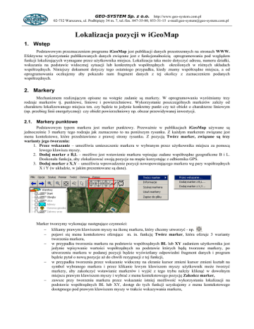 GEO-SYSTEM Sp. z o.o. http://www.geo-system.com.pl 02-732 Warszawa, ul. Podbipięty 34 m. 7, tel./fax. 847-35-80, 853-31-15 e-mail:[email protected] Lokalizacja pozycji w iGeoMap 1. Wstęp Podstawowym przeznaczeniem programu iGeoMap jest publikacji danych przestrzennych na stronach WWW. Efektywne wykorzystanie publikowanych danych związane jest z funkcjonalnością oprogramowania pod względem funkcji lokalizujących wymagane przez użytkownika miejsca. Lokalizacja taka może dotyczyć adresu, numeru działki, wskazania na podstawie widocznej sytuacji lub konkretnych współrzędnych określonych w różnych układach współrzędnych. Niniejszy dokument dotyczy tego ostatniego przypadku, kiedy znamy współrzędne miejsca, a od oprogramowania oczkujemy aby pokazało nam fragment danych z tej okolicy z zaznaczeniem podanych współrzędnych. 2. Markery Mechanizmem realizującym opisane na wstępie zadanie są markery. W oprogramowaniu wyróżniamy trzy rodzaje markerów tj. punktowe, liniowe i powierzchniowe. Wykorzystanie poszczególnych markerów zależy od charakteru lokalizowanego miejsca tzn. czy będzie to jedynie konkretny punkt czy też obiekt o charakterze liniowym (np. przebieg linii energetycznej) czy obiekt powierzchniowy np. obszar przewidywanej inwestycji. 2.1. Markery punktowe Podstawowym typem markera jest marker punktowy. Przeważnie w publikacjach iGeoMap używane są jednocześnie 3 markery tego rodzaju jak zaznaczono to na poniższym rysunku. Z każdym markerem związane jest menu kontekstowe, które przedstawiono z prawej strony rysunku. Z pozycją Twórz marker, związane są trzy warianty jego tworzenia: 1. Przez wskazanie – umożliwia umieszczenie markera w wybranym przez użytkownika miejscu za pomocą lewego klawisza myszy. 2. Dodaj marker z B,L – możliwe jest wstawienie markera wpisując zadane współrzędne geograficzne B i L. Doskonała funkcja, aby zlokalizować swoją pozycje na mapie korzystając z odbiornika GPS. 3. Dodaj marker z X,Y – umożliwia wprowadzenie pozycji nowopowstającego markera wg pary współrzędnych X i Y (w układzie, w jakim prezentowane są dane). Marker tworzymy wykonując następujące czynności: − klikamy prawym klawiszem myszy na ikonę markera, który chcemy utworzyć - np. , − pojawi się menu kontekstowe oferujące m. in. funkcję Twórz marker, która oferuje 3 warianty tworzenia markera, − w przypadku tworzenia markera na podstawie współrzędnych BL lub XY zadaniem użytkownika jest jedynie wpisywanie wartości współrzędnych na podstawie których będą tworzone markery, po utworzeniu markera w podanej pozycji będzie wyświetlany odpowiedni fragment danych i program będzie pytał o nową pozycje aż do chwili rezygnacji z tej funkcji, − w przypadku tworzenia przez wskazanie widoczny na ekranie kursor zmieni kursor zmieni kształt na symbol wybranego markera i przez klikanie lewym klawiszem myszy użytkownik może tworzyć markery, aby zakończyć wstawianie markerów i wyjść z tego trybu należy kliknąć w dowolnym miejscu prawym klawiszem myszy i wybrać z menu kontekstowego pozycję Zakończ marker, − zawsze przy tworzeniu markera przez wskazanie istniej możliwość wykorzystania lokalizacji na podstawie współrzędnych BL lub XY, dostęp do tych funkcji uzyskujemy z menu kontekstowego dostępnego pod prawym klawiszem myszy w trakcie wskazywania markera, GEO-SYSTEM Sp. z o.o. http://www.geo-system.com.pl 02-732 Warszawa, ul. Podbipięty 34 m. 7, tel./fax. 847-35-80, 853-31-15 e-mail:[email protected] 2.2. Markery liniowe Marker liniowy służy do lokalizowania miejsc o charakterze liniowym . Analogicznie jak w przypadku markera punktowego dostęp do funkcji tworzenia uzyskujemy z menu kontekstowego. Menu oferuje tylko jeden wariant tworzenia markera, ale możliwy jest w nim każdy wariant lokalizacji punktu opisany przy tworzeniu markera punktowego. Możemy mianowicie punkty wskazywać kursorem myszy lub na podstawie menu kontekstowego lokalizować zarówno na podstawie współrzędnych XY jak i BL. Kończymy wstawianie markera i wychodzimy z trybu tworzenia klikając prawym klawiszem myszy i wybierając z menu kontekstowego pozycję Zakończ marker. Program zakończy marker w ostatnim punkcie, jaki umieściliśmy na mapie. 2.3. Markery powierzchniowe Marker powierzchniowy służy do lokalizowania miejsc o charakterze powierzchniowym . Analogicznie jak w przypadku markera punktowego dostęp do funkcji tworzenia uzyskujemy z menu kontekstowego. Menu oferuje tylko jeden wariant tworzenia markera, ale możliwy jest w nim każdy wariant lokalizacji punktu opisany przy tworzeniu markera punktowego. Możemy mianowicie punkty wskazywać kursorem myszy lub na podstawie menu kontekstowego lokalizować zarówno na podstawie współrzędnych XY jak i BL. Kończymy wstawianie markera i wychodzimy z trybu tworzenia klikając prawym klawiszem myszy i wybierając z menu kontekstowego pozycję Zakończ marker. W efekcie program „domknie” poligon umieszczając ostatni punkt w miejscu punktu, od którego zaczęliśmy tworzenie markera.