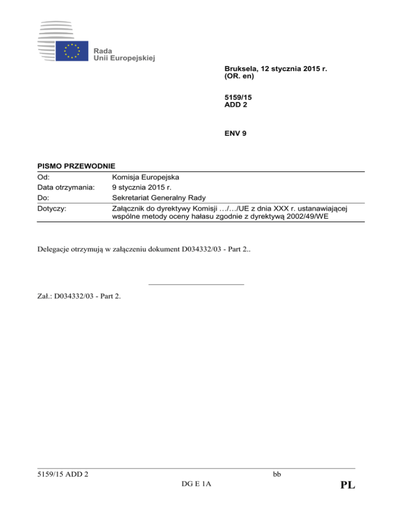 Rada Unii Europejskiej Bruksela, 12 stycznia 2015 r. (OR. en) 5159/15 ADD 2 ENV 9 PISMO PRZEWODNIE Od: Data otrzymania: Komisja Europejska 9 stycznia 2015 r. Do: Sekretariat Generalny Rady Dotyczy: Załącznik do dyrektywy Komisji …/…/UE z dnia XXX r. ustanawiającej wspólne metody oceny hałasu zgodnie z dyrektywą 2002/49/WE Delegacje otrzymują w załączeniu dokument D034332/03 - Part 2.. Zał.: D034332/03 - Part 2. 5159/15 ADD 2 bb DG E 1A PL Wersja ostateczna – strona 121 DODATEK A: WYMOGI DOTYCZĄCE DANYCH W sekcji 2.7.6 dokumentu głównego wyszczególniono ogólnie wymogi dotyczące określonych danych odnoszących się do portu lotniczego i jego funkcjonowania, potrzebnych do obliczania linii konturowej hałasu. W poniższych arkuszach danych zamieszczono przykładowe dane dla hipotetycznego portu lotniczego. Konkretne formaty danych będą zazwyczaj uzależnione od wymogów i potrzeb konkretnego systemu modelowania hałasu oraz scenariusza badania. Uwaga: zaleca się wyznaczane informacji geograficznych (punktów referencyjnych itd.) na podstawie kartezjańskiego układu współrzędnych. Wybór konkretnego systemu współrzędnych zależy zazwyczaj od dostępnych map. A1 Ogólne dane dla portu lotniczego Oznaczenie lotniska Hipotetyczny port lotniczy Układ współrzędnych UTM, strefa 15, Datum WGS-84 Punkt referencyjny lotniska, ARP 3 600 000 m E 6 300 000 m N Środek drogi startowej 09L-27R Wysokość bezwzględna ARP 120 m / Średnia temperatura powietrza w ARP* 12,0 ºC Średnia wilgotność względna w ARP* 60 % Średnia prędkość wiatru i kierunek wiatru 5 węzłów Appendix A: Źródło danych topograficznych 270 stopni Nieznane * Należy podać dla każdego analizowanego przedziału czasowego (pora dnia, pora roku itd.). A2 Charakterystyka drogi startowej Oznaczenie drogi startowej 09L Początek drogi startowej 3 599 000 m E 6 302 000 m N Koniec drogi startowej 3 603 000 m E 6 302 000 m N Wersja ostateczna – strona 122 Początek rozbiegu/dobiegu 3 599 000 m E 6 302 000 m N Próg lądowania na drodze startowej 3 599 700 m E 6 302 000 m N Wysokość bezwzględna początku drogi startowej Średni gradient drogi startowej 110 m 0,001 W przypadku progów przemieszczonych charakterystykę drogi startowej można powtórzyć lub opisać przemieszczone progi w sekcji dotyczącej charakterystyki rzutu toru na ziemi. A3 Charakterystyka rzutu toru na ziemi Przy braku danych radarowych, do scharakteryzowania poszczególnych rzutów torów na ziemi potrzebne są następujące informacje. Tor nr 001 Oznaczenie toru Dep 01 – 09L Od drogi startowej 09L Rodzaj toru Odejście Przemieszczenie względem rozbiegu/dobiegu 0m Liczba alternatywnych torów: 7 Charakterystyka podstawowej toru Krzywa Segment nr W linii prostej [m] 1 10 000 3 4 L/R Zmiana kursu [°] Promień [m] Odchylenie standardowe dla rozproszenia poprzecznego na końcu segmentu [m] 2 000 R 90,00 3 000 20 000 2 500 3 000 Tor nr 002 Oznaczenie toru App 01 – 09L – Disp 300 Od drogi startowej 09L Wersja ostateczna – strona 123 Rodzaj toru Podejście Przemieszczenie względem progu lądowania 300 m Liczba alternatywnych torów: 1 Charakterystyka toru głównego Krzywa Segment nr W linii prostej [m] 1 30 000 L/R Zmiana kursu [°] Promień [m] Odchylenie standardowe dla rozproszenia poprzecznego na końcu segmentu [m] 0 Informacje dotyczące drogi podejścia Kąt schodzenia dla dróg podejścia Wysokość bezwzględna schodzenia A4 lotu 2,7° na przecięciu ścieżki 4 000 stóp Charakterystyka ruchu lotniczego 366 d Okres referencyjny = 8 748 g (1.1.2014 do 31.12.2014) Pora doby I Od godziny 7 do 19 = 12 h Pora doby II Od godziny 19 do 23 =4h Pora doby III Od godziny 23 do 7 =8h ARKUSZ DANYCH CHARAKTERYSTYKI POSZCZEGÓLNYCH DROGACH RUCHU LOTNICZEGO Tor nr 001 Oznaczenie toru Dep 01 – 09L Oznaczenie powietrznego A/C 1, Dep.1 – RUCH Ruch w poszczególnych porach doby statku I 20 000 II III 4 000 1 000 NA Wersja ostateczna – strona 124 A/C 2, Dep.4 10 000 5 000 500 A/C 4, Dep.3 2 000 300 0 Tor nr 002 Oznaczenie toru Dep 01 – 09L – Disp 300 Oznaczenie powietrznego A5 Ruch w poszczególnych porach doby statku I II III A/C 1, App.1 18 000 2 000 5 000 A/C 2, App.1 10 000 3 000 2 500 A/C 4, App.1 1 300 0 1 000 Arkusz danych procedury lotu Podany jako przykład w rozdziale 3 statek powietrzny Boeing 727-200, dla którego dane radarowe pozyskano zgodnie z wytycznymi zawartymi w rozdziale 2.7.9 dokumentu głównego. Oznaczenie statku powietrznego B727C3 Identyfikator NPD z bazy danych ANP JT8E5 Liczba silników 3 Tryb pracy Odejście Rzeczywista masa statku powietrznego [t] 71,5 Wiatr czołowy [m/s] 5 Temperatura [°C] 20 Wzniesienie lotniska [m] 83 Wersja ostateczna – strona 125 Segment Odległość od punktu referencyjnego 1 Wysokość Prędkość względem ziemi Moc silnika Nr [m] [m] [m/s] [ 2] 1 0 0 0 14 568 2 2 500 0 83 13 335 3 3 000 117 88 13 120 4 4 000 279 90 13 134 5 4 500 356 90 13 147 6 5 000 431 90 13 076 7 6 000 543 90 13 021 8 7 000 632 93 12 454 9 8 000 715 95 10 837 10 10 000 866 97 10 405 11 12 000 990 102 10 460 12 14 000 1 122 111 10 485 13 16 000 1 272 119 10 637 14 18 000 1 425 125 10 877 15 20 000 1 581 130 10 870 16 25 000 1 946 134 10 842 17 30 000 2 242 142 10 763 Na przykładzie profilu zadanego w procedurach lotu w oparciu o dane A/C przechowywane w bazie danych ANP: Oznaczenie statku powietrznego zaczerpnięte z bazy danych ANP B727C3 Identyfikator NPD zaczerpnięty z bazy danych ANP JT8E5 1 2 Punkt referencyjny to początek rozbiegu przy odejściach i próg lądowania przy podejściach. Jednostki odpowiadające jednostkom ujętym w bazie danych ANP. Wersja ostateczna – strona 126 Liczba silników 3 Tryb pracy Odejście Rzeczywista masa statku powietrznego [t] 71,5 Wiatr czołowy [m/s] 5 15 Temperatura [°C] Wzniesienie lotniska [m] Segment 100 Tryb Cel Klapy Moc silnika Nr 1 Start 2 Początkowe wznoszenie 3 Klapy wpuszczone 4 Przyspieszenie 5 Wznoszenie Wysokość bezwzględna 