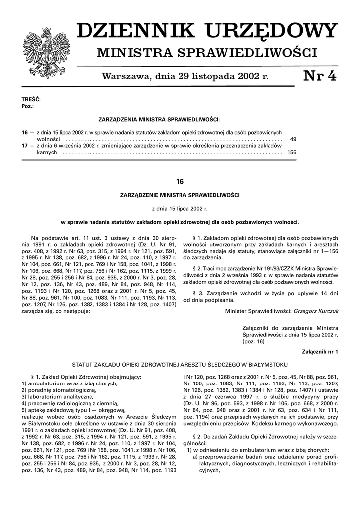 DZIENNIK URZĘDOWY MINISTRA SPRAWIEDLIWOŚCI Warszawa, dnia 29 listopada 2002 r. Nr 4 TREŚĆ: Poz.: ZARZĄDZENIA MINISTRA SPRAWIEDLIWOŚCI: 16 — z dnia 15 lipca 2002 r. w sprawie nadania statutów zakładom opieki zdrowotnej dla osób pozbawionych wolności . . . . . . . . . . . . . . . . . . . . . . . . . . . . . . . . . . . . . . . . . . . . . . . . . . . . . . . . . . . . . . . . . . . . . . . . 49 17 — z dnia 6 września 2002 r. zmieniające zarządzenie w sprawie określenia przeznaczenia zakładów karnych . . . . . . . . . . . . . . . . . . . . . . . . . . . . . . . . . . . . . . . . . . . . . . . . . . . . . . . . . . . . . . . . . . . . . . . . . 156 16 ZARZĄDZENIE MINISTRA SPRAWIEDLIWOŚCI z dnia 15 lipca 2002 r. w sprawie nadania statutów zakładom opieki zdrowotnej dla osób pozbawionych wolności. Na podstawie art. 11 ust. 3 ustawy z dnia 30 sierpnia 1991 r. o zakładach opieki zdrowotnej (Dz. U. Nr 91, poz. 408, z 1992 r. Nr 63, poz. 315, z 1994 r. Nr 121, poz. 591, z 1995 r. Nr 138, poz. 682, z 1996 r. Nr 24, poz. 110, z 1997 r. Nr 104, poz. 661, Nr 121, poz. 769 i Nr 158, poz. 1041, z 1998 r. Nr 106, poz. 668, Nr 117, poz. 756 i Nr 162, poz. 1115, z 1999 r. Nr 28, poz. 255 i 256 i Nr 84, poz. 935, z 2000 r. Nr 3, poz. 28, Nr 12, poz. 136, Nr 43, poz. 489, Nr 84, poz. 948, Nr 114, poz. 1193 i Nr 120, poz. 1268 oraz z 2001 r. Nr 5, poz. 45, Nr 88, poz. 961, Nr 100, poz. 1083, Nr 111, poz. 1193, Nr 113, poz. 1207, Nr 126, poz. 1382, 1383 i 1384 i Nr 128, poz. 1407) zarządza się, co następuje: § 1. Zakładom opieki zdrowotnej dla osób pozbawionych wolności utworzonym przy zakładach karnych i aresztach śledczych nadaje się statuty, stanowiące załączniki nr 1—156 do zarządzenia. § 2. Traci moc zarządzenie Nr 191/93/CZZK Ministra Sprawiedliwości z dnia 2 września 1993 r. w sprawie nadania statutów zakładom opieki zdrowotnej dla osób pozbawionych wolności. § 3. Zarządzenie wchodzi w życie po upływie 14 dni od dnia podpisania. Minister Sprawiedliwości: Grzegorz Kurczuk Załączniki do zarządzenia Ministra Sprawiedliwości z dnia 15 lipca 2002 r. (poz. 16) Załącznik nr 1 STATUT ZAKŁADU OPIEKI ZDROWOTNEJ ARESZTU ŚLEDCZEGO W BIAŁYMSTOKU § 1. Zakład Opieki Zdrowotnej obejmujący: 1) ambulatorium wraz z izbą chorych, 2) poradnię stomatologiczną, 3) laboratorium analityczne, 4) pracownię radiologiczną z ciemnią, 5) aptekę zakładową typu I — okręgową, realizuje wobec osób osadzonych w Areszcie Śledczym w Białymstoku cele określone w ustawie z dnia 30 sierpnia 1991 r. o zakładach opieki zdrowotnej (Dz. U. Nr 91, poz. 408, z 1992 r. Nr 63, poz. 315, z 1994 r. Nr 121, poz. 591, z 1995 r. Nr 138, poz. 682, z 1996 r. Nr 24, poz. 110, z 1997 r. Nr 104, poz. 661, Nr 121, poz. 769 i Nr 158, poz. 1041, z 1998 r. Nr 106, poz. 668, Nr 117, poz. 756 i Nr 162, poz. 1115, z 1999 r. Nr 28, poz. 255 i 256 i Nr 84, poz. 935, z 2000 r. Nr 3, poz. 28, Nr 12, poz. 136, Nr 43, poz. 489, Nr 84, poz. 948, Nr 114, poz. 1193 i Nr 120, poz. 1268 oraz z 2001 r. Nr 5, poz. 45, Nr 88, poz. 961, Nr 100, poz. 1083, Nr 111, poz. 1193, Nr 113, poz. 1207, Nr 126, poz. 1382, 1383 i 1384 i Nr 128, poz. 1407) i ustawie z dnia 27 czerwca 1997 r. o służbie medycyny pracy (Dz. U. Nr 96, poz. 593, z 1998 r. Nr 106, poz. 668, z 2000 r. Nr 84, poz. 948 oraz z 2001 r. Nr 63, poz. 634 i Nr 111, poz. 1194) oraz przepisach wydanych na ich podstawie, przy uwzględnieniu przepisów Kodeksu karnego wykonawczego. § 2. Do zadań Zakładu Opieki Zdrowotnej należy w szczególności: 1) w odniesieniu do ambulatorium wraz z izbą chorych: a) przeprowadzanie badań oraz udzielanie porad profilaktycznych, diagnostycznych, leczniczych i rehabilitacyjnych, Dziennik Urzędowy Nr 4 Ministra Sprawiedliwości — 50 — b) krótkotrwałe leczenie chorych umieszczonych w izbie chorych, c) kierowanie pacjentów na konsultacje specjalistyczne i do leczenia szpitalnego, 2) w odniesieniu do poradni stomatologicznej: a) przeprowadzanie badań profilaktycznych stanu uzębienia, b) udzielanie świadczeń z zakresu stomatologii zachowawczej i chirurgii stomatologicznej, 3) w odniesieniu do laboratorium analitycznego: a) przygotowywanie, wykonywanie i opracowywanie badań analitycznych, b) instruowanie personelu pielęgniarskiego w zakresie pobierania i dostarczania materiału do badań laboratoryjnych, 4) w odniesieniu do pracowni radiologicznej — wykonywanie diagnostycznych badań radiologicznych, 5) w odniesieniu do apteki zakładowej — okręgowej: a) zaopatrywanie w środki farmaceutyczne i materiały medyczne apteczek ambulatoryjnych Zakładów Opieki Zdrowotnej zlokalizowanych na terenie działalności Okręgowego Inspektoratu Służby Więziennej w Białymstoku, b) planowanie wydatków i zakupów oraz realizacja i monitorowanie wykonania tych planów, c) kontrola zaopatrywanych apteczek. § 3. Rodzaje świadczeń zdrowotnych, jakich udziela Zakład Opieki Zdrowotnej, określają odrębne przepisy, odpowiednio do określonych zadań dla poszczególnych komórek organizacyjnych wchodzących w skład zakładu. Poz. 16 § 4. Dla potrzeb Zakładu Opieki Zdrowotnej wydziela się: 1) w odniesieniu do ambulatorium wraz z izbą chorych: gabinet zabiegowy, gabinety lekarskie, pracownie pomocnicze i sale chorych — lokale zgodne z wymogami określonymi w odrębnych przepisach, 2) w odniesieniu do poradni stomatologicznej: gabinet stomatologiczny — lokal zgodny z wymogami określonymi w odrębnych przepisach, 3) w odniesieniu do laboratorium analitycznego — lokal zgodny z wymogami określonymi w odrębnych przepisach, 4) w odniesieniu do pracowni radiologicznej — lokal zgodny z wymogami określonymi w odrębnych przepisach, 5) w odniesieniu do apteki okręgowej — lokal apteczny zgodny z wymogami określonymi w odrębnych przepisach. § 5. W Zakładzie Opieki Zdrowotnej ustanawia się stanowiska określone zarządzeniem organizacyjno-etatowym dla Aresztu Śledczego w Białymstoku. § 6. Za