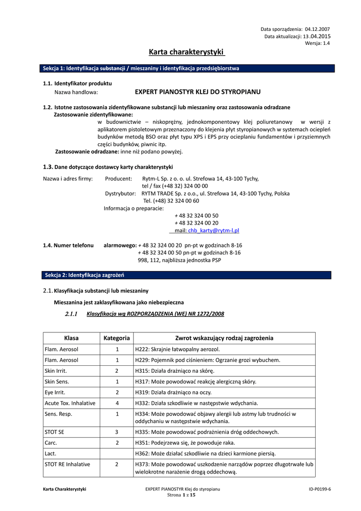 Data sporządzenia: 04.12.2007 Data aktualizacji: 13 .04.2015 Wersja: 1.4 Karta charakterystyki Sekcja 1: Identyfikacja substancji / mieszaniny i identyfikacja przedsiębiorstwa 1.1. Identyfikator produktu Nazwa handlowa: EXPERT PIANOSTYR KLEJ DO STYROPIANU 1.2. Istotne zastosowania zidentyfikowane substancji lub mieszaniny oraz zastosowania odradzane Zastosowanie zidentyfikowane: w budownictwie – niskoprężny, jednokomponentowy klej poliuretanowy w wersji z aplikatorem pistoletowym przeznaczony do klejenia płyt styropianowych w systemach ociepleń budynków metodą BSO oraz płyt typu XPS i EPS przy ocieplaniu fundamentów i przyziemnych części budynków, piwnic itp. Zastosowanie odradzane: inne niż podano powyżej. 1.3. Dane dotyczące dostawcy karty charakterystyki Nazwa i adres firmy: Producent: Rytm-L Sp. z o. o. ul. Strefowa 14, 43-100 Tychy, tel / fax (+48 32) 324 00 00 Dystrybutor: RYTM TRADE Sp. z o.o., ul. Strefowa 14, 43-100 Tychy, Polska Tel. (+48) 32 324 00 60 Informacja o preparacie: + 48 32 324 00 50 + 48 32 324 00 20 mail: [email protected] 1.4. Numer telefonu alarmowego: + 48 32 324 00 20 pn-pt w godzinach 8-16 + 48 32 324 00 50 pn-pt w godzinach 8-16 998, 112, najbliższa jednostka PSP Sekcja 2: Identyfikacja zagrożeń 2.1. Klasyfikacja substancji lub mieszaniny Mieszanina jest zaklasyfikowana jako niebezpieczna 2.1.1 Klasyfikacja wg ROZPORZĄDZENIA (WE) NR 1272/2008 Klasa Kategoria Zwrot wskazujący rodzaj zagrożenia Flam. Aerosol 1 H222: Skrajnie łatwopalny aerozol. Flam. Aerosol 1 H229: Pojemnik pod ciśnieniem: Ogrzanie grozi wybuchem. Skin Irrit. 2 H315: Działa drażniąco na skórę. Skin Sens. 1 H317: Może powodować reakcję alergiczną skóry. Eye Irrit. 2 H319: Działa drażniąco na oczy. Acute Tox. Inhalative 4 H332: Działa szkodliwie w następstwie wdychania. Sens. Resp. 1 H334: Może powodować objawy alergii lub astmy lub trudności w oddychaniu w następstwie wdychania. STOT SE 3 H335: Może powodować podrażnienia dróg oddechowych. Carc. 2 H351: Podejrzewa się, że powoduje raka. Lact. STOT RE Inhalative Karta Charakterystyki H362: Może działać szkodliwie na dzieci karmione piersią. 2 H373: Może powodować uszkodzenie narządów poprzez długotrwałe lub wielokrotne narażenie drogą oddechową. EXPERT PIANOSTYR Klej do styropianu Strona 1 z 15 ID-P0199-6 Aquatic Chronic 1 H410: Działa bardzo toksycznie na organizmy wodne, powodując długotrwałe skutki. 2.2. Elementy oznakowania Symbole ostrzegawcze: ROZPORZĄDZENIA (WE) NR 1272/2008 NIEBEZPIECZEŃSTWO Zawiera izocyjaniany, chloroalkany C14-C17, fosforan tris(2-chloro-1-metyloetylowy). Zwroty H wskazujące rodzaj zagrożenia: H222: Skrajnie łatwopalny aerozol. H229: Pojemnik pod ciśnieniem: Ogrzanie grozi wybuchem. H315: Działa drażniąco na skórę. H317: Może powodować reakcję alergiczną skóry. H319: Działa drażniąco na oczy. H332: Działa szkodliwie w następstwie wdychania. H334: Może powodować objawy alergii lub astmy lub trudności w oddychaniu w następstwie wdychania. H335: Może powodować podrażnienia dróg oddechowych. H351: Podejrzewa się, że powoduje raka. H362: Może działać szkodliwie na dzieci karmione piersią. H373: Może powodować uszkodzenie narządów poprzez długotrwałe lub wielokrotne narażenie drogą oddechową. H410: Działa bardzo toksycznie na organizmy wodne, powodując długotrwałe skutki. Zwroty P wskazujące środki ostrożności: P102: Chronić prze dziećmi. P210: Przechowywać z dala od źródeł ciepła/otwartego ognia i innych źródeł zapłonu. Palenie wzbronione. P251: Nie przekłuwać ani nie spalać, nawet po zużyciu. P260: Nie wdychać gazu/par. P271: Stosować wyłącznie na zewnątrz lub w dobrze wentylowanym pomieszczeniu. P273: Unikać uwolnienia do środowiska. P280: Stosować rękawice ochronne/odzież ochronną/ochronę oczu/ochronę twarzy. P302+P352: W PRZYPADKU KONTAKTU ZE SKÓRĄ: Umyć dużą ilością wody z mydłem. P304+P340: W PRZYPADKU DOSTANIA SIĘ DO DRÓG ODDECHOWYCH: Wyprowadzić lub wynieść poszkodowanego na świeże powietrze i zapewnić warunki do swobodnego oddychania. P305+P351+P338: W PRZYPADKU DOSTANIA SIĘ DO OCZU: Ostrożnie płukać wodą przez kilka minut. Wyjąć soczewki kontaktowe, jeżeli są i można je łatwo wyjąć. Nadal płukać. P410+P412: Chronić przed światłem słonecznym. Nie wystawiać na działanie temperatury przekraczającej 50 o C/122 oF. Informacje ostrzegawcze: Zawiera izocyjaniany. Może powodować wystąpienie reakcji alergicznej. Zapoznaj się z instrukcją dostarczoną przez producenta. W razie konieczności zasięgnąć porady lekarza, należy pokazać pojemnik lub etykietę. Zawiera gaz pod ciśnieniem; ogrzewanie grozi wybuchem. Nie rozpylać nad otwartym ogniem lub innym źródłem zapłonu. Zawartość/pojemnik usuwać do/zgodnie z krajowymi przepisami dotyczącymi gospodarki odpadami. Powtarzające się narażenie może powodować wysuszenie lub pękanie skóry. Stosowanie tego produktu może wywołać reakcje alergiczne u osób uczulonych na diizocyjaniany. Osoby cierpiące na astmę, egzemę lub inne dolegliwości skórne powinny unikać kontaktu skórnego z tym produktem. Ten produkt nie powinien być stosowany przy słabej wentylacji, chyba że stosowana jest maska ochronna z odpowiednim filtrem przeciwgazowym (np. typu A1 zgodnie z normą EN 14387). Stosować rękawice ochronne zgodne z EN 374, odzież ochronną zgodną z EN 13034, ochronę oczu zgodną z EN 167, ochronę twarzy zgodną z EN 166. 2.3 Inne zagrożenia: Brak informacji na temat spełnienia kryteriów PBT i vPvB zgodnie z załącznikiem XIII REACH. Karta Charakterystyki EXPERT PIANOSTYR Klej do styropianu Strona 2 z 15 ID-P0199-6 Sekcja 3: Skład / informacja o składnikach 3.1. Substancje Nie dotyczy 3.2. Mieszaniny Składniki Numery rejestracji REACH Diizocyjanian metylenodifenylu izomery i homologi Zawartość Nr WE Nr CAS 38 -55% - 9016-87-9 < 10% 287-477-0 85535-85-9 < 10% 