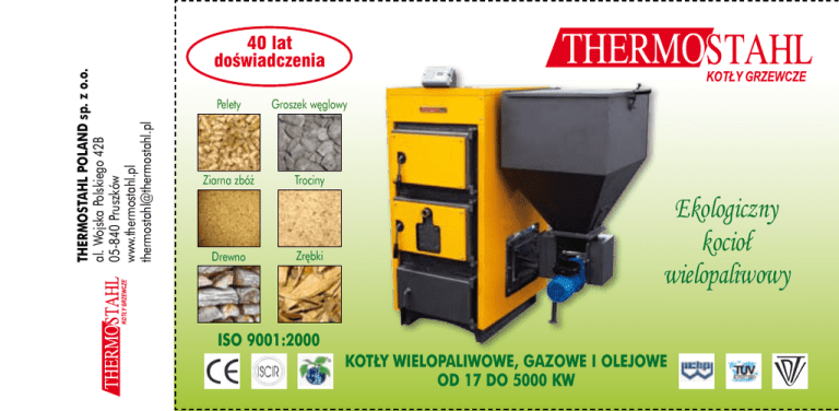 THERMOSTAHL POLAND sp. z o.o. al. Wojska Polskiego 42B 05-840 Pruszków www.thermostahl.pl [email protected] 40 lat doświadczenia Pelety Groszek węglowy Ziarna zbóż Trociny Drewno Zrębki ISO 9001:2000 Ekologiczny kocioł wielopaliwowy kotły wielopaliwowe, gazowe i olejowe od 17 do 5000 kW Zgadzam się na przetwarzanie moich danych osobowych przez MURATOR S.A., Warszawa 00-570, al. Wyzwolenia 14. Dane przekazuję dobrowolnie, zastrzegając sobie prawo dostępu do nich oraz ich poprawiania. Zgadzam się na przekazanie karty korespondencyjnej, zawierającej moje dane osobowe, firmie, której materiały zamówiłam/em w celu wykonania zamówienia. Zgadzam się na przetwarzanie moich danych przez MURATOR S.A. w celach promocyjno-marketingowych. Zgadzam się na przesyłanie na podany adres elektroniczny informacji handlowych w rozumieniu Ustawy z dn. 18.07.2002 r. o świadczeniu usług drogą elektroniczną. data ....................... podpis ...................................... 2009 Opłata przerzucona na adresata – umowa nr 133/04 z CUP OR Warszawa z dnia 20.09.2004 r. faks 0 22 590 53 36 MURATOR S.A. ul. Kamionkowska 45 03-812 Warszawa Wyślij już dziś! Otrzymasz informacje o naszych produktach. imię i nazwisko (nazwa firmy): .............................................. .................................................................................. adres: ................................................................................. .....–...... ........................................................................ tel.: ........................... e-mail: ............................................. informator instalacyjny- Proszę o przesłanie: ❏ oferty ogólnej ❏ cennika ❏ informacji technicznych Rodzaj prowadzonej działalności: ❏ architekt ❏ deweloper ❏ firma wykonawcza ❏ hurtownia ❏ inwestor indywidualny ❏ inwestor instytucjonalny