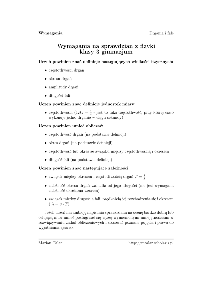 Wymagania Drgania i fale Wymagania na sprawdzian z fizyki klasy 3 gimnazjum Uczeń powinien znać definicje następujących wielkości fizycznych: • częstotliwości drgań • okresu drgań • amplitudy drgań • długości fali Uczeń powinien znać definicje jednostek miary: • częstotliwości (1Hz = 1s - jest to taka częstotliwość, przy której ciało wykonuje jedno drganie w ciągu sekundy) Uczeń powinien umieć obliczać: • częstotliwość drgań (na podstawie definicji) • okres drgań (na podstawie definicji) • częstotliwość lub okres ze związku między częstotliwością i okresem • długość fali (na podstawie definicji) Uczeń powinien znać następujące zależności: • związek między okresem i częstotliwością drgań T = 1 f • zależność okresu drgań wahadła od jego długości (nie jest wymagana zależność określona wzorem) • związek między długością fali, prędkością jej rozchodzenia się i okresem ( λ = υ · T) Jeżeli uczeń ma ambicję napisania sprawdzianu na ocenę bardzo dobrą lub celującą musi umieć posługiwać się wyżej wymienionymi umiejętnościami w rozwiązywaniu zadań obliczeniowych i stosować poznane pojęcia i prawa do wyjaśniania zjawisk. Marian Talar http://mtalar.scholaris.pl Wymagania Drgania i fale Ponadto uczeń powinien: umieć scharakteryzować zmiany prędkości ciała poruszającego się ruchem drgającym, na przykładzie wahadła matematycznego, umieć scharakteryzować zmiany siły działającej na ciało poruszające się ruchem drgającym, na przykładzie wahadła sprężynowego umieć scharakteryzować przemiany energii potencjalnej i kinetycznej ciała poruszającego się ruchem drgającym, na przykładzie wahadła matematycznego, znać pojęcia • drgań gasnących • drgań wymuszonych • ruchu falowego • fali poprzecznej • fali podłużnej umieć zinterpretować takie cechy dźwięku jak wysokość, głośność, barwa za pomocą fizycznych cech fali rozumieć zjawisko ruchu fali dźwiękowej w powietrzu znać pojęcia ultradźwięków i infradźwięków znać jednostkę poziomu głośności (dB - decybel) znać granice bezpiecznego poziomu głośności znać różne przykłady fal poprzecznych i podłużnych znać różne przykłady zastosowań fal dźwiękowych (ultra i infradźwiękowych) Wybierz na stronie link Drgania i fale gdzie znajdziesz niektóre przykładowe zadania do rozwiązania. Testy w formacie dokumentów Worda - w dziale Testy, sprawdziany, zadania konkursowe i inne. W tym samym dziale zamieściłem również test mojego autorstwa w postaci programu. Należy go ściągnąć i zapisać na dysku swojego komputera (na przykład na pulpicie), uruchomić. Po uruchomieniu należy wpisać swoje imię i nazwisko, klasę, po czym można będzie rozpocząć odpowiadać na pytania. Kolejność Marian Talar http://mtalar.scholaris.pl Wymagania Drgania i fale wyboru pytań jest dowolna. Czas na wykonanie testu wynosi 12 minut. Po zakończeniu testu program wystawi i wyświetli ocenę z testu. Miłej zabawy. Marian Talar http://mtalar.scholaris.pl
